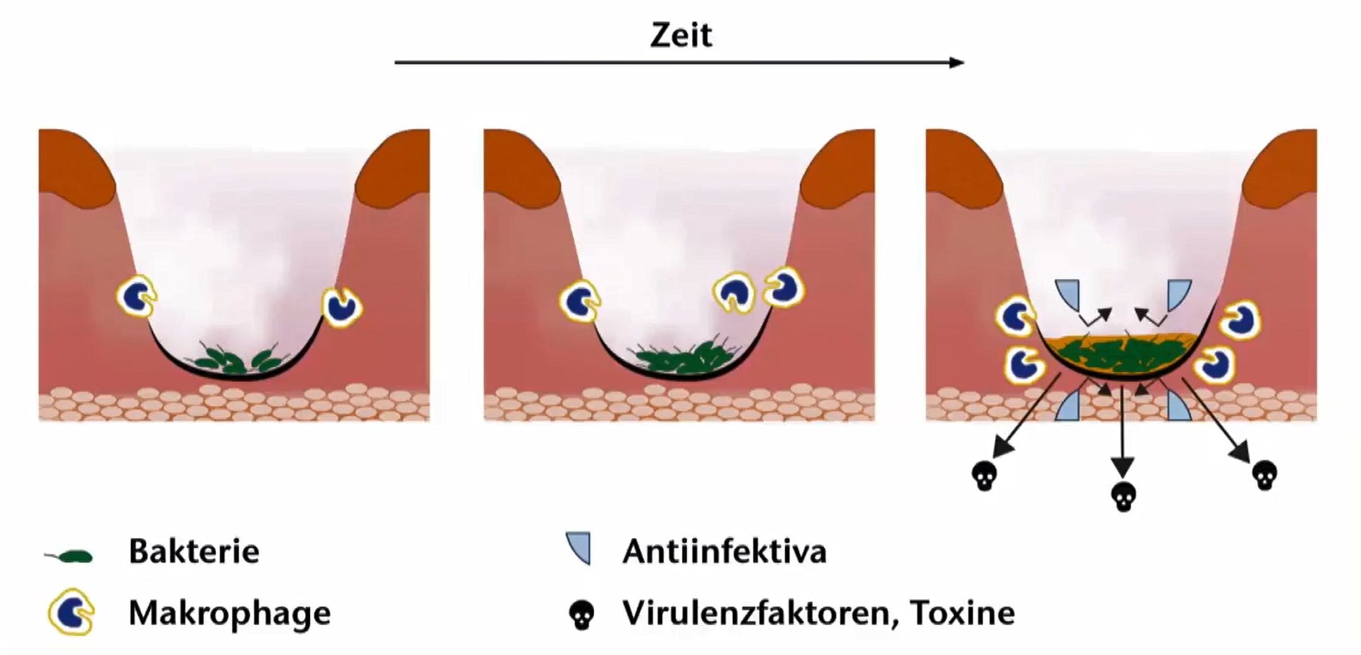 Biofilme stellen eine wesentliche Ursache für Wundheilungsstörungen und eine verzögerte Wundheilung dar. Sie können eine anhaltende Entzündungsreaktion auslösen, die den natürlichen Heilungsprozess behindert. Die Immunzellen des Körpers versuchen ständig die Erreger zu bekämpfen, was zu einer chronischen Entzündung und Gewebeschädigung führen kann.