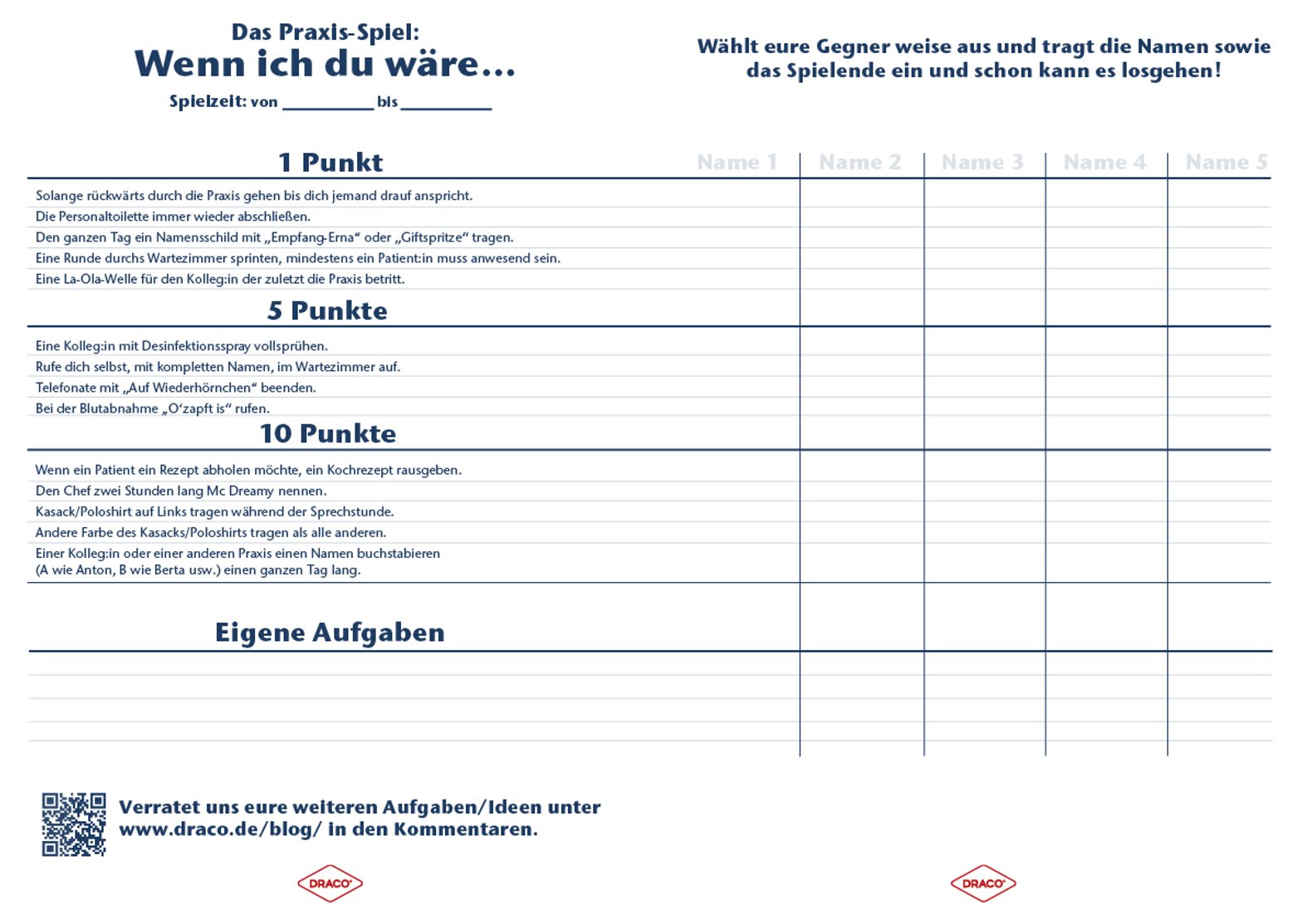 - Zuerst druckt ihr den Spielbogen "Das Praxis-Spiel: Wenn ich du wäre..." aus oder ladet ihn nur herunter (es handelt sich um eine beschreibbare PDF) und tragt die Namen aller Mitspieler ein. Hier geht es zum PDF Spielbogen.