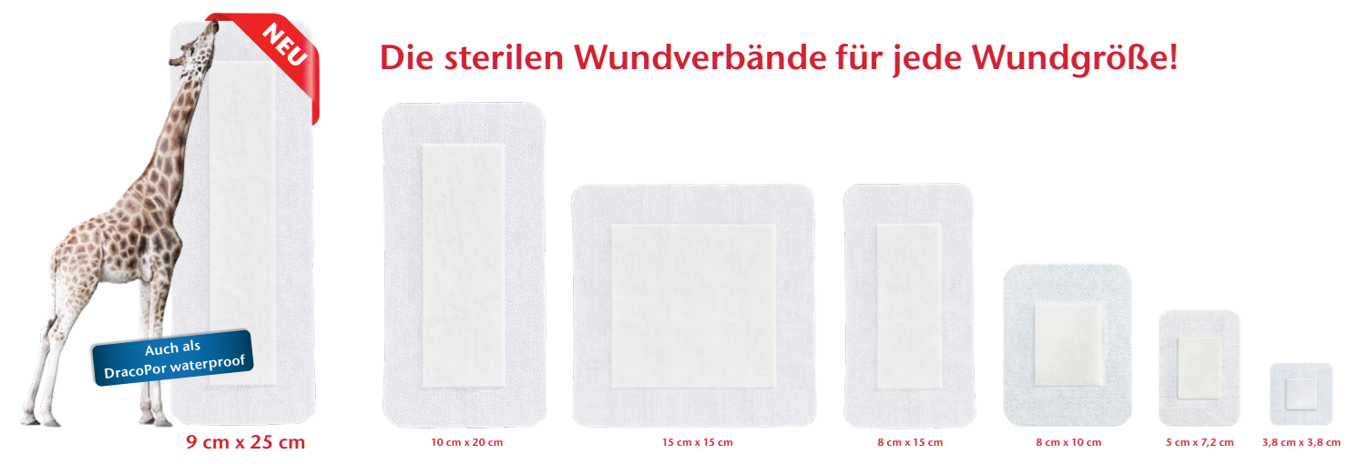 DracoPor sind die sterilen Wundverbände für jede Größe und Anforderung und jetzt wachsen sie über sich hinaus. Entdecken SIe jetzt DracoPor soft und waterproof in der neuen Größe 9cm x 25cm. Diese großzügige Fläche ist ideal für postoperative Wunden oder lange, akute Wunden.