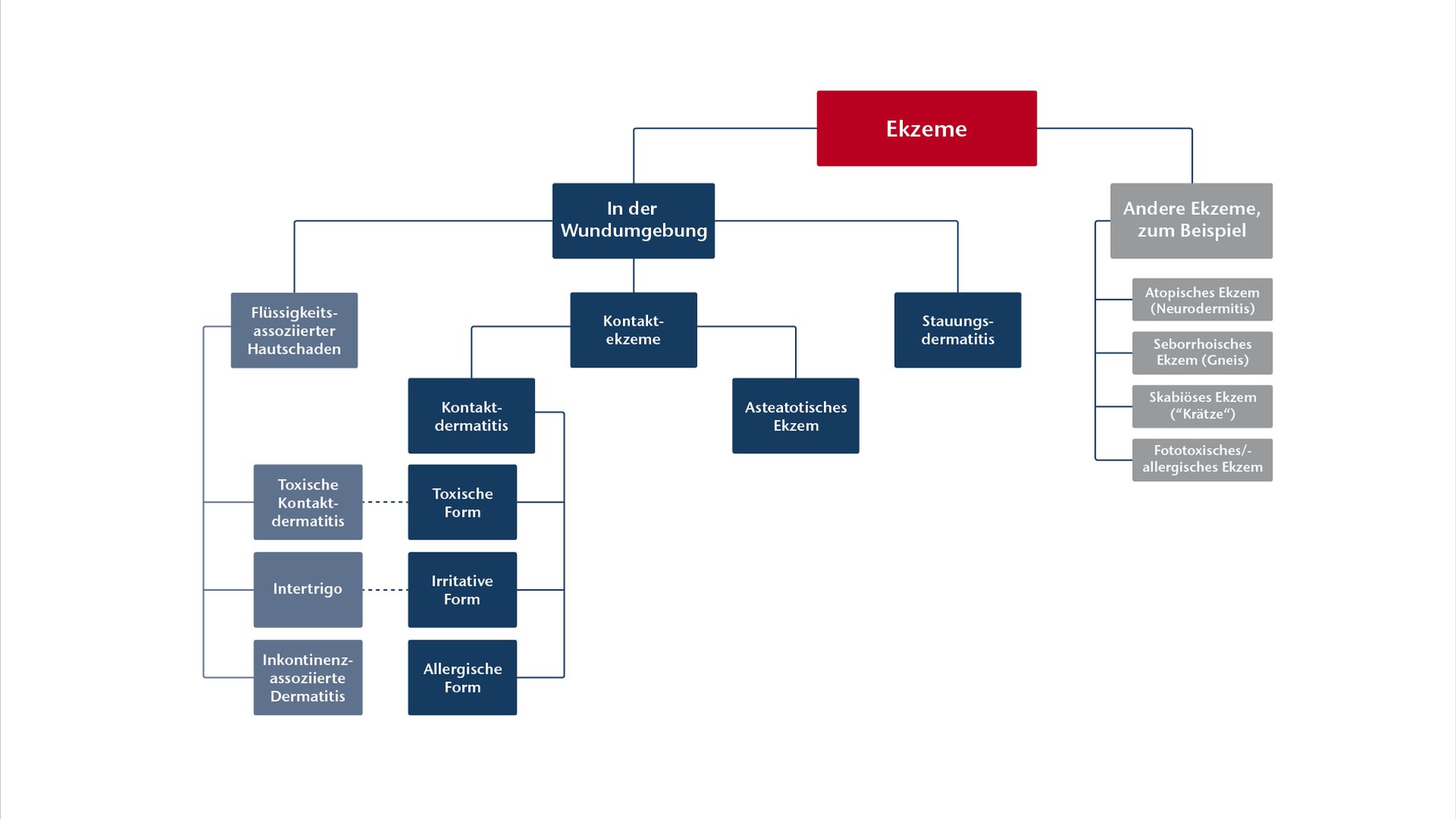 - Kontaktdermatitiden mit drei Subformen, zu denen auch einige Formen der Flüssigkeits-assoziierten Hautschäden (FAH) sowie die Medical Adhesive-Related Skin Injuries (MARSI) gehören