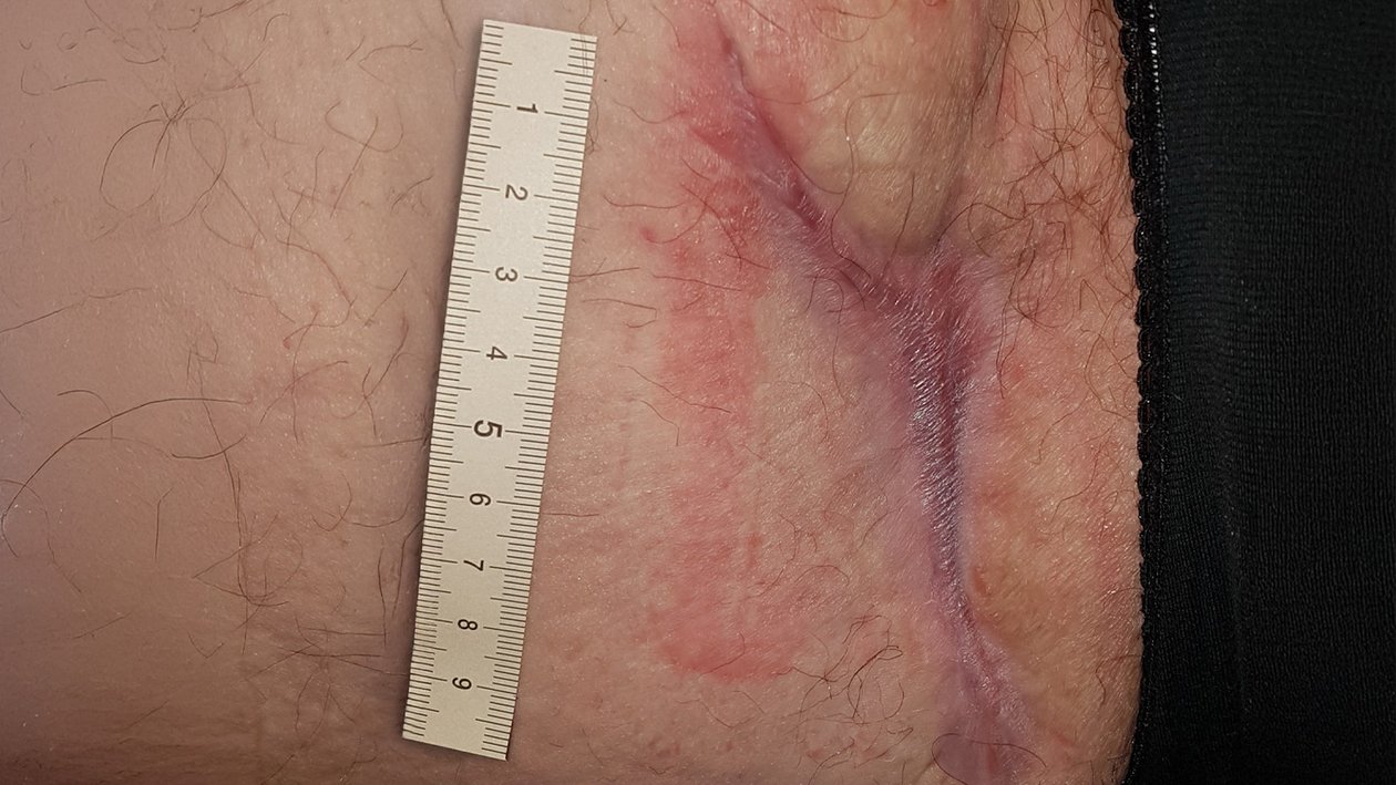 Nach einem weiteren Monat ist die Wunde noch 3,4 cm lang und 1,9 cm breit (Foto 3). Die Unterminierung ist weiterhin vorhanden, aber deutlich verkleinert. Bei 11:00 Uhr ist in der sonst oberflächlichen Wunde eine tiefere Stelle (2,8 cm Tiefe) erkennbar. Am Wundgrund zeigt sich weiter Granulationsgewebe mit etwas Biofilm. Zudem schreitet die Epithelisierung fort. Im Narbengewebe sind kleine Einziehungen zu erkennen. Die Exsudation ist weiter vorhanden, hat jedoch abgenommen.