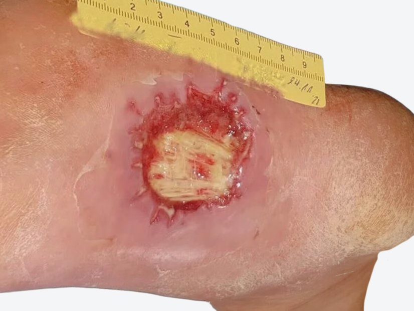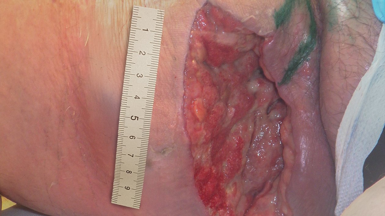 Die vorgefundene Wunde ist anfangs 14,4 cm lang, 5,2 cm breit und bis zu 6 cm tief (Foto 1). Bei 11 Uhr findet sich eine Unterminierung von 3,4 cm Länge und 2,3 cm Breite. Es sind viel subkutanes Fettgewebe sowie Granulationsgewebe zu erkennen, das mit Biofilm und Fibrin belegt ist. Der Wundrand und die Umgebungshaut sind intakt und unauffällig. Die Wunde exsudiert zu Beginn stark.