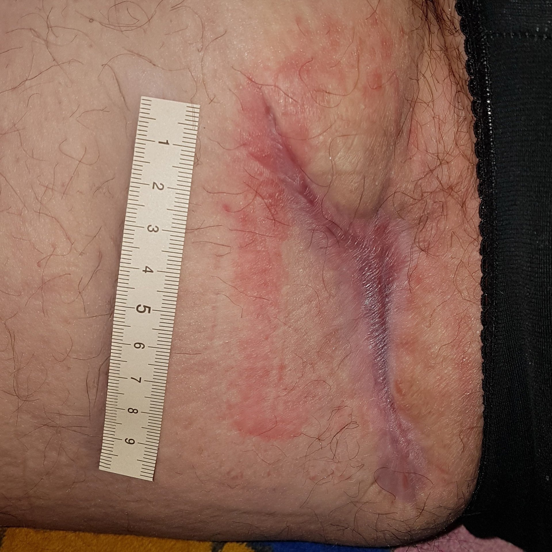 Nach einem weiteren Monat ist die Wunde noch 3,4 cm lang und 1,9 cm breit (Foto 3). Die Unterminierung ist weiterhin vorhanden, aber deutlich verkleinert. Bei 11:00 Uhr ist in der sonst oberflächlichen Wunde eine tiefere Stelle (2,8 cm Tiefe) erkennbar. Am Wundgrund zeigt sich weiter Granulationsgewebe mit etwas Biofilm. Zudem schreitet die Epithelisierung fort. Im Narbengewebe sind kleine Einziehungen zu erkennen. Die Exsudation ist weiter vorhanden, hat jedoch abgenommen.
