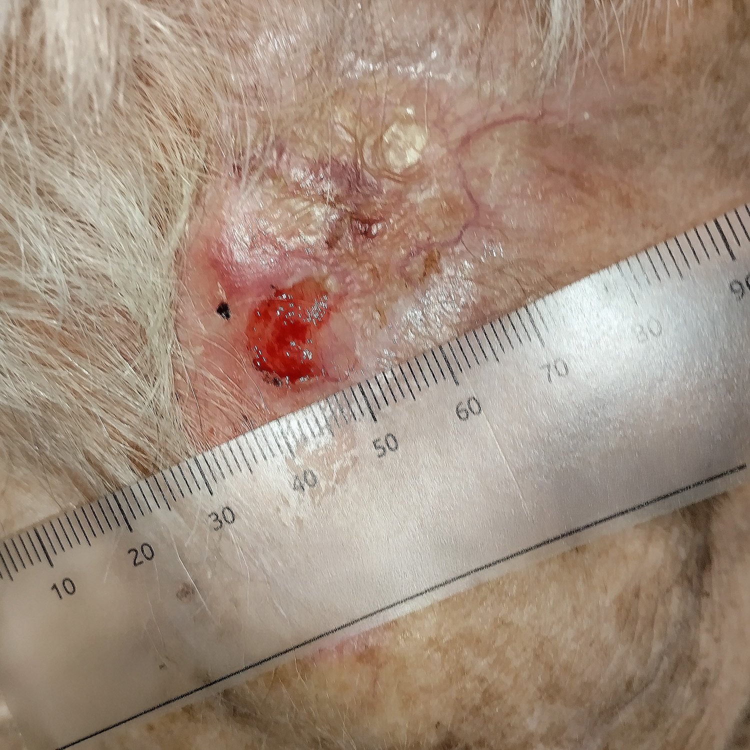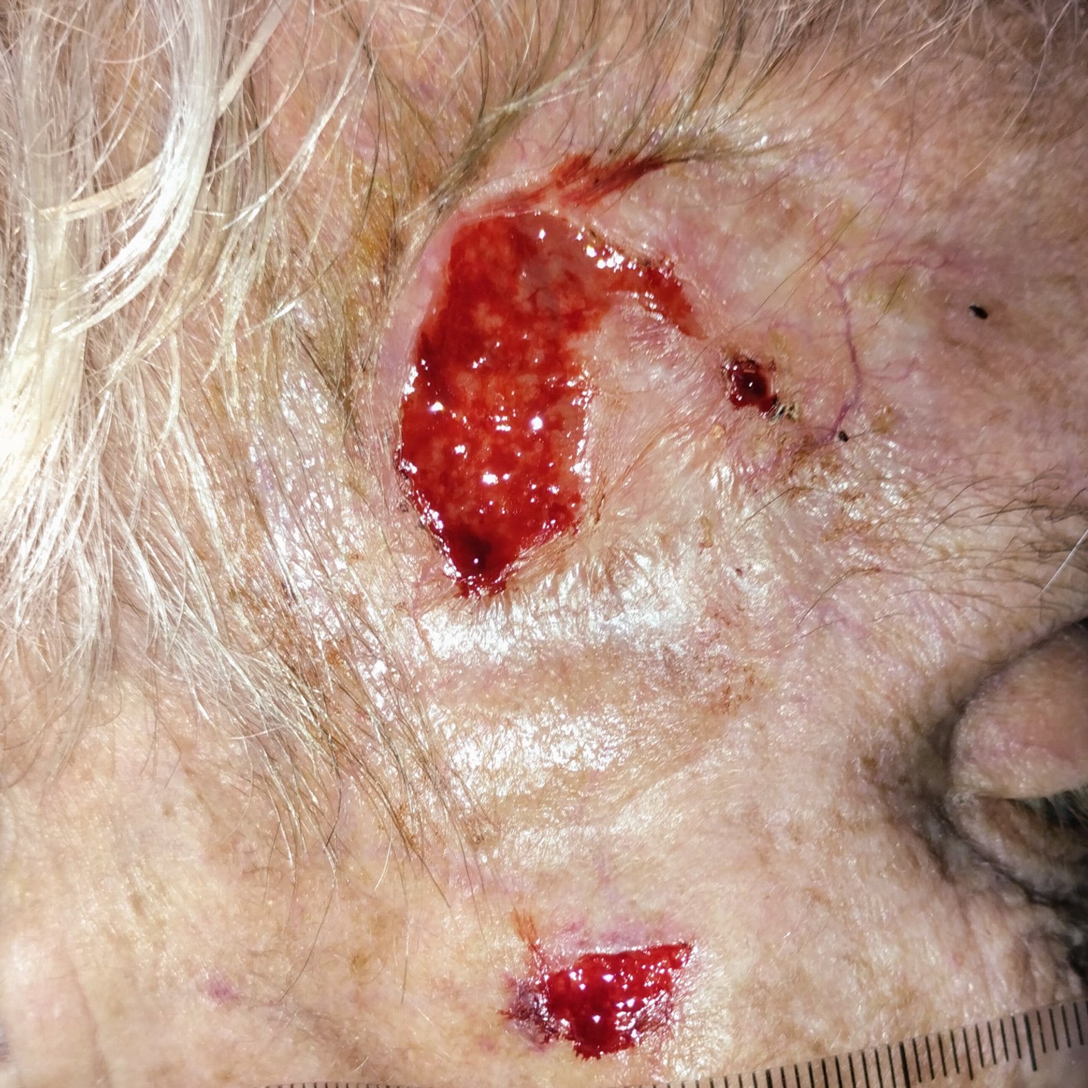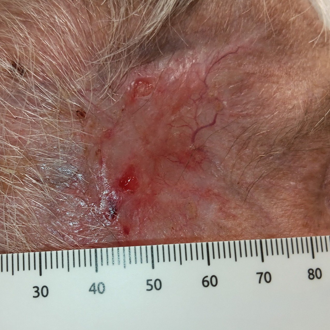 Zwei Wochen danach ist die Wunde abgeheilt. Da Frau S. zu diesem Zeitpunkt aufgrund anderer Erkrankungen stationär im Krankenhaus behandelt wird, wird in der Praxis kein Foto mehr angefertigt. Kurz nach der Heilung der Wunde kann sie in stabilem Allgemeinzustand in die Häuslichkeit entlassen werden und sucht künftig zur engmaschigen Krebsnachsorge alle 12 Wochen ihre Dermatologin auf.