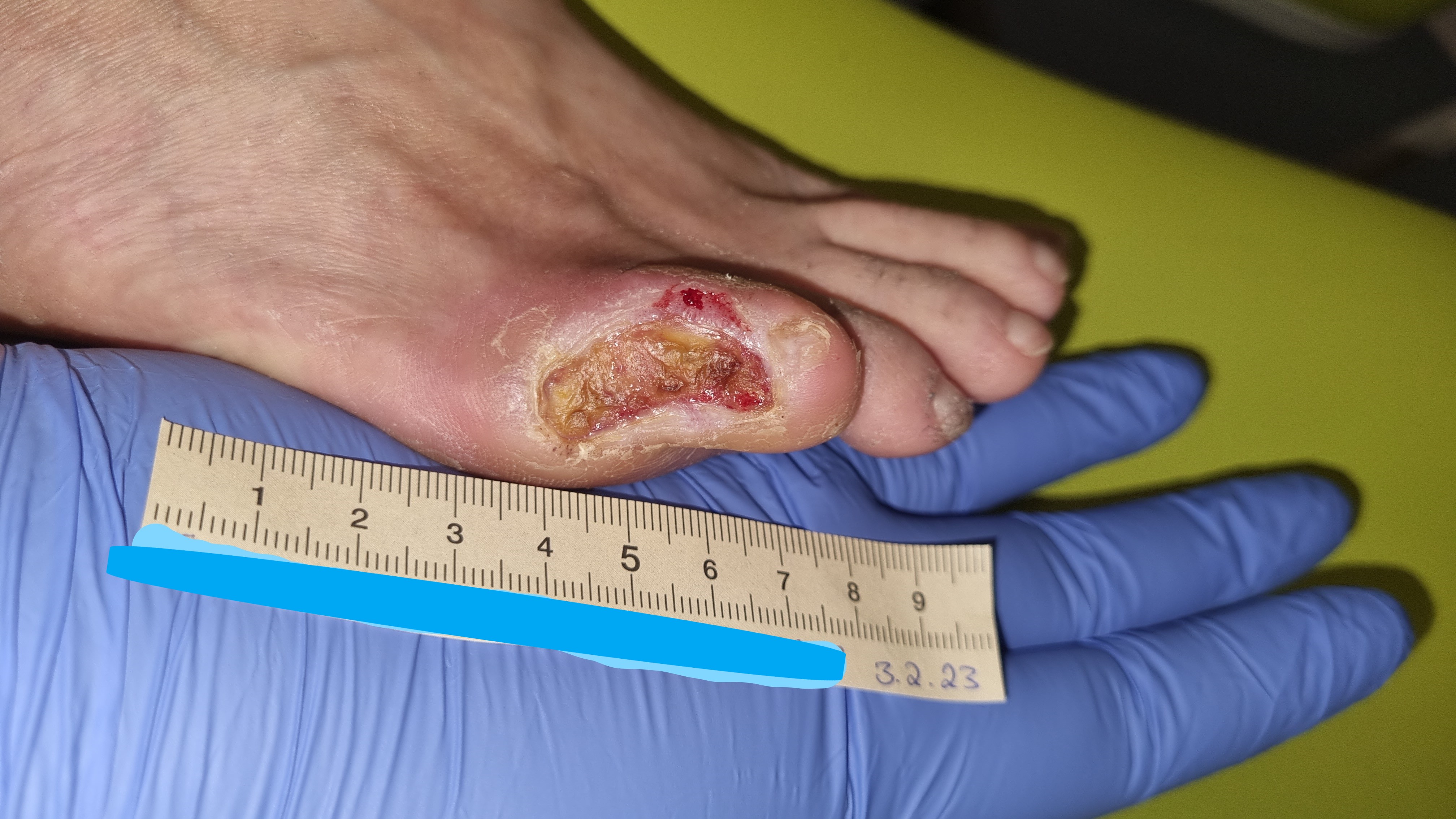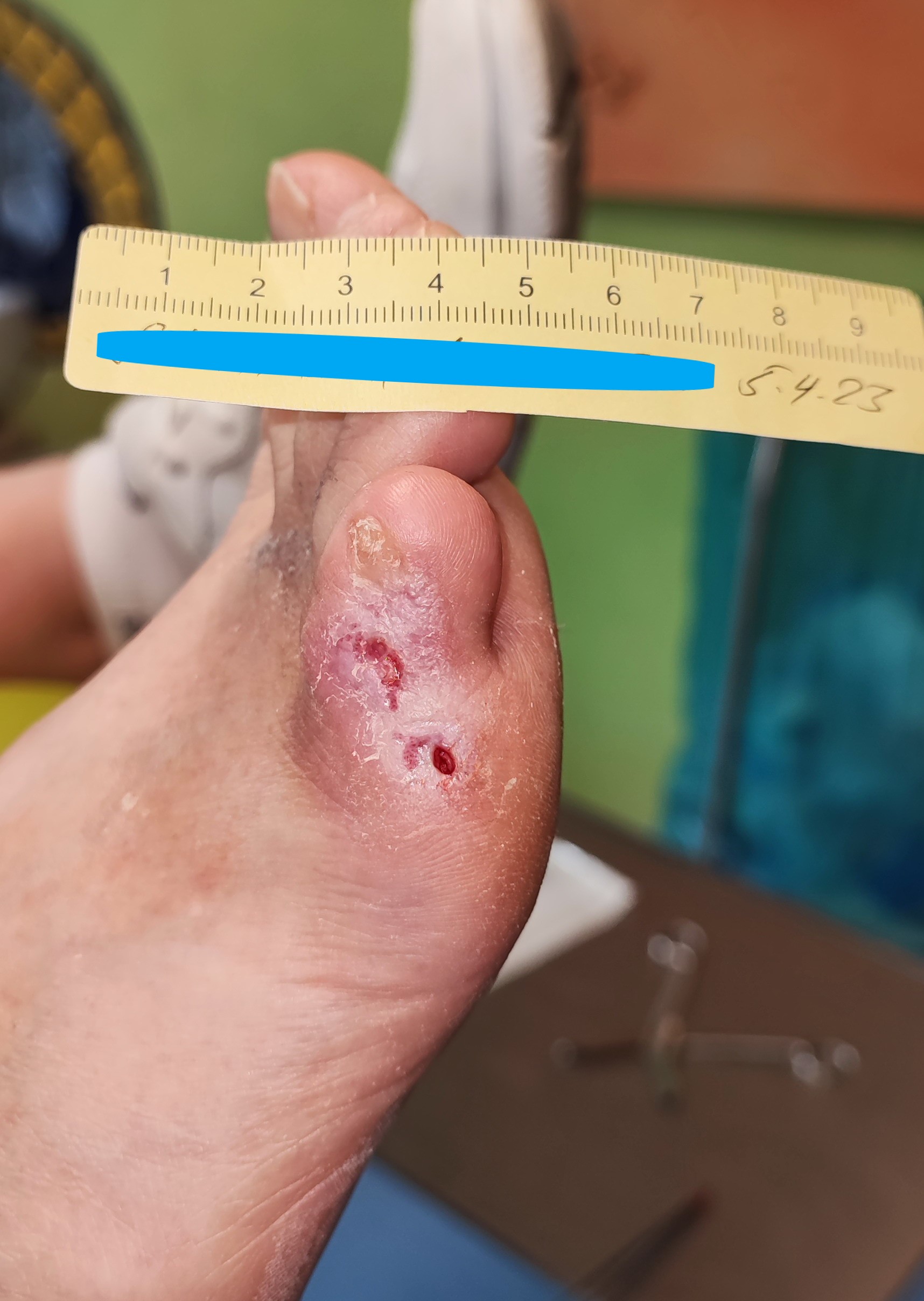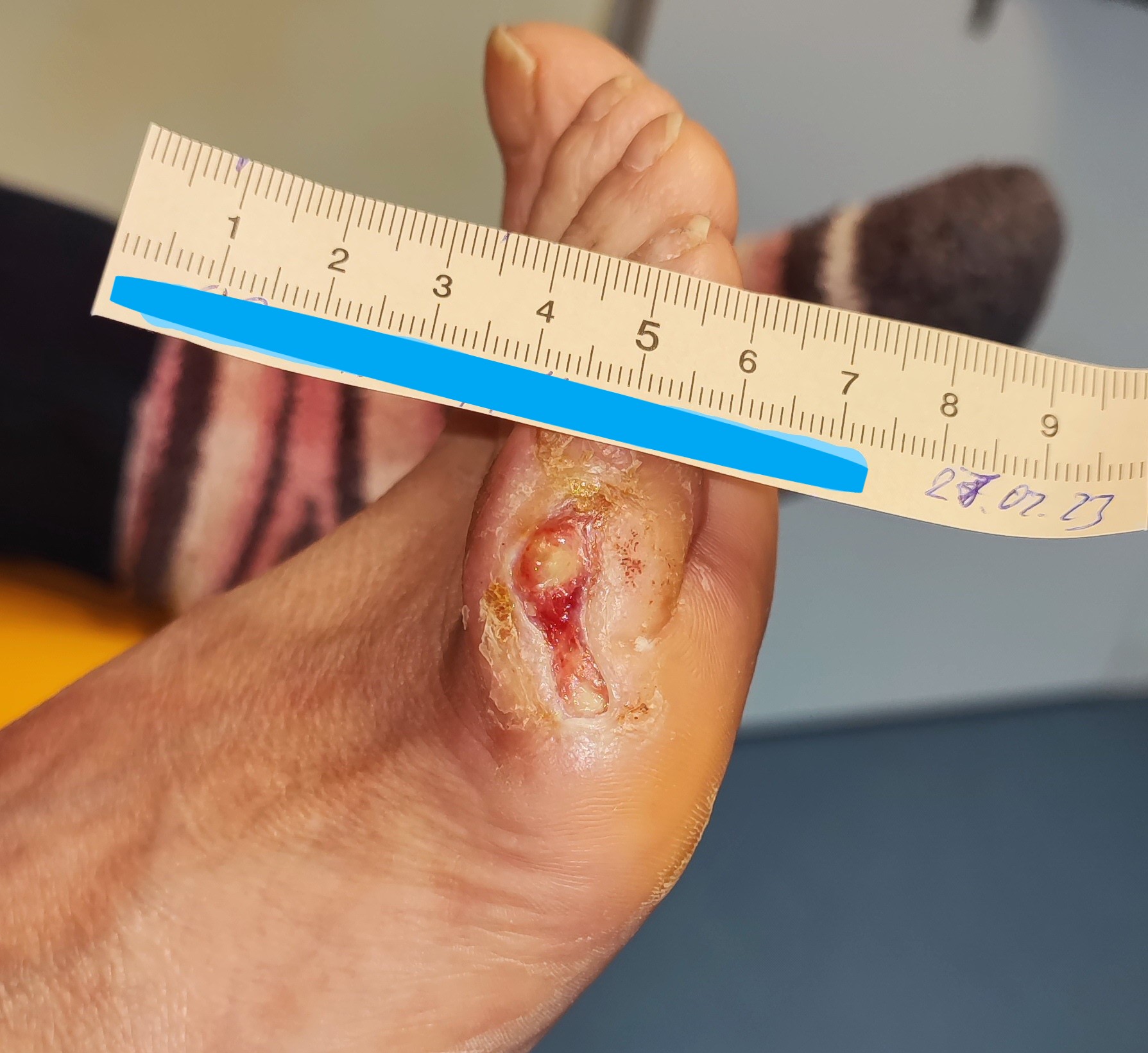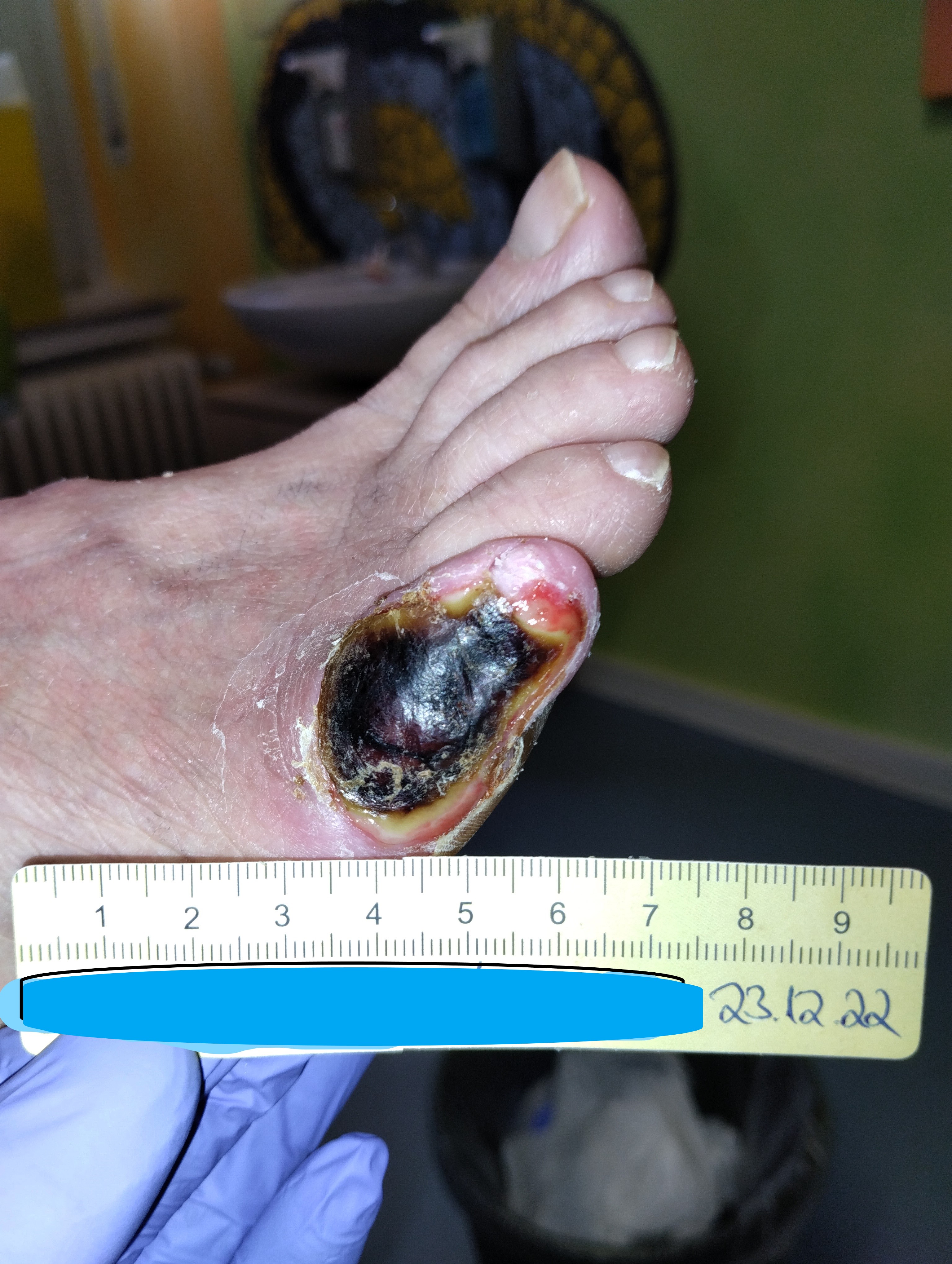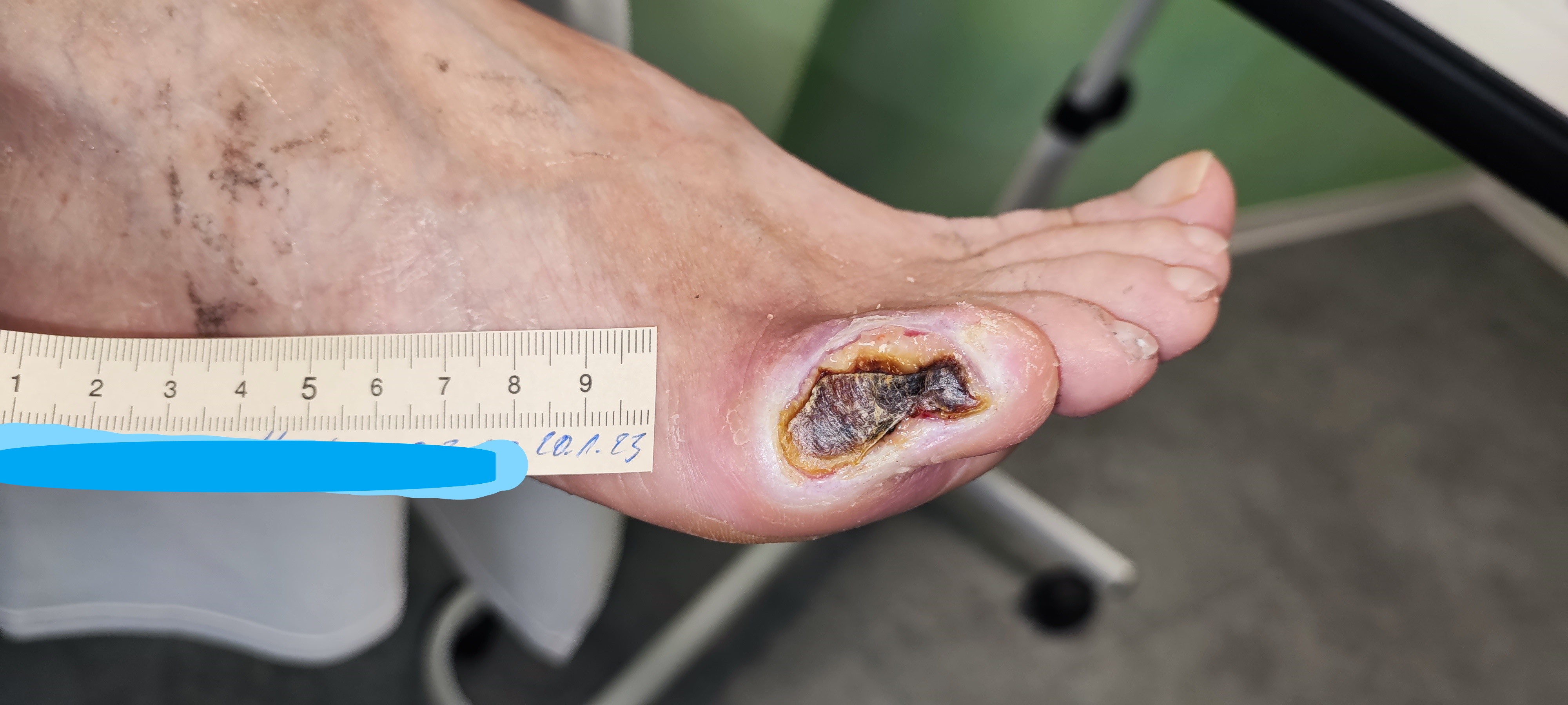 Die 53-jährige Patientin Frau S. ist an Diabetes und pAVK erkrankt. Seit 3 Jahren muss sie zudem regelmäßig zur Dialyse und wartet neben einer Pankreas- auch auf eine Nierentransplantation. Aufgrund einer Neuropathie im Rahmen eines Diabetischen Fußsyndroms bemerkte sie eine Läsion am kleinen Zeh (D5) ihres rechten Fußes nicht. Ihr Ehemann, der sie ansonsten bei der Pflege der Füße unterstützte, war zudem für einige Tage beruflich verreist, sodass auch er die Wunde nicht frühzeitig erkennen konnte. Als die Wunde schließlich doch auffiel, suchte Frau S. eine pflegerische Praxis auf.