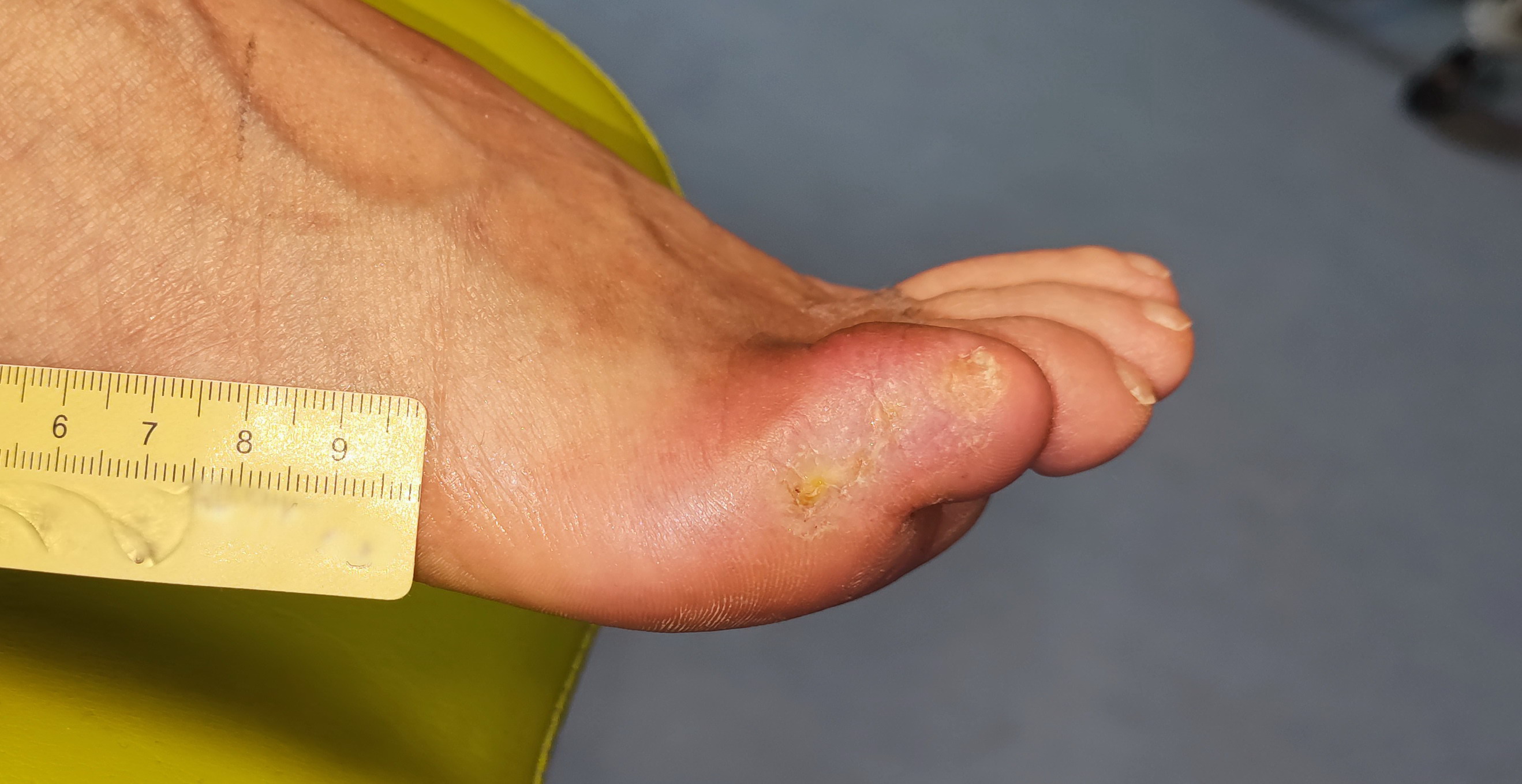 Nach weiteren 3 Wochen hatten sich die Nekrosen vollständig abgelöst und Granulationsgewebe war erkennbar (Bild 5). Die Exsudation war mäßig und nach wie vor gelblich-serös und geruchlos. Weiterhin waren Hyperkeratosen am Wundrand erkennbar, welche jedoch insgesamt etwas weniger geworden waren, da Frau S. den Fuß nun zu entlasten versuchte. Die Wunde war inzwischen nur noch 1,8 cm lang und 0,9 cm breit. Die Versorgung wurde beibehalten und Frau S. wurde dazu animiert, nach Abheilung der Fußwunde eine podologische Praxis aufzusuchen, um Hyperkeratosen in der Zukunft vorzubeugen bzw. diese zu reduzieren.