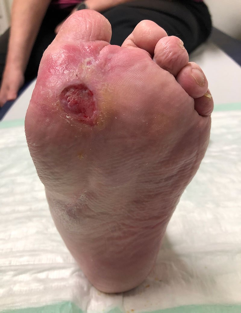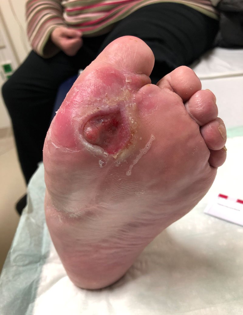 Die Patientin befindet sich im Ruhestand und weist seit 6 Monaten ein Diabetisches Fußulcus auf. Bei Erstvorstellung war das Diabetische Fußulcus bei hydrokolloidaler Wundtherapie zu feucht und es bestand eine kritische Kolonisierung mit Staphylococcus aureus.
