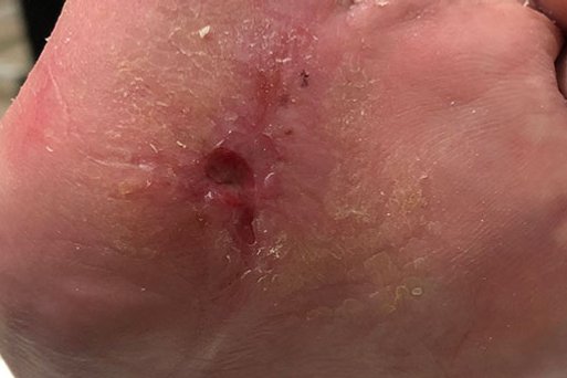 Aus unklaren Gründen erfolgte durch einen Pflegedienst 6 Monate nach Therapiebeginn die Wiederanlage von hydrokolloidalen Wundauflagen und/oder einfachen Kompressen als Lokaltherapie (ohne weitere Druckentlastung). Dies führte zur erneuten Eröffnung des Diabetischen Fußulcus (Bild 4).
