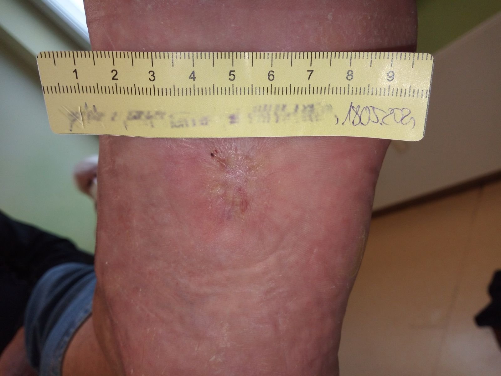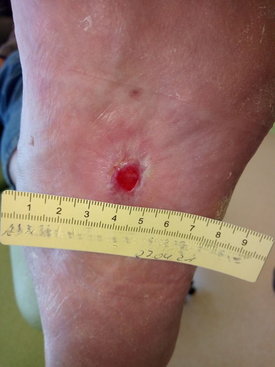 Der Wundrand ist weiterhin etwas wulstig und leicht eingekerbt, die Wundumgebung ist nach Abtragen der vorhandenen Hyperkeratosen unauffällig. Die Haut insgesamt ist etwas trocken und vor allem an den Hornhautstellen leicht rissig. Die Wundversorgung erfolgt weiterhin mit einem PU-Schaum. Die Umgebungshaut wird mit einem ureahaltigen Schaum gepflegt. Auch das Verbandwechselintervall von 3 Tagen wird beibehalten.
