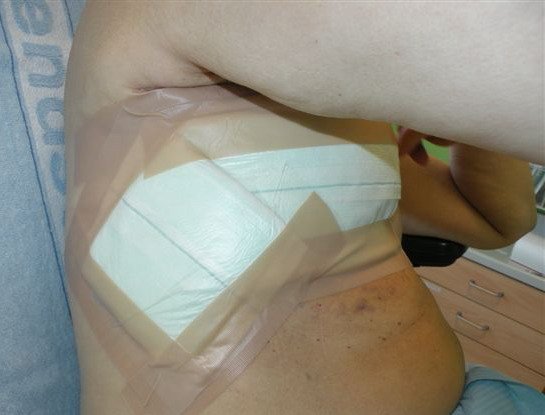 Einen Monat später war die Wunde wie erhofft so gut wie vollständig abgeheilt. In einer der Hautfalten fand sich noch eine sehr kleine Läsion auf Hautniveau (Foto 5). Die Läsion wurde mit einem sanft haftenden PU-Schaum abgedeckt, der weiterhin mit einem BH fixiert wurde und 7 Tage verbleiben konnte. Frau K. wurde noch einmal dahingehend beraten, dass sie vor allem ein Augenmerk auf die weiterhin bestehenden Falten haben sollte. Es war besonders wichtig, diese regelmäßig gut von Talg, Hautschuppen und Schweiß zu befreien und anschließend gut zu trocknen. Wenn sich Läsionen bilden sollten, müssten diese zeitnah begutachtet und adäquat versorgt werden. Frau K. wollte die nächsten Verbandwechsel selbst durchführen und sollte sich melden, falls Komplikationen auftreten würden. Nach einem weiteren Verbandwechsel zu Hause teilte sie uns telefonisch mit, dass die Wunde nun verschlossen sei. Sie wurde noch einmal ermutigt, sich umgehend zu melden, wenn wieder Läsionen an der Brust auftreten sollten.