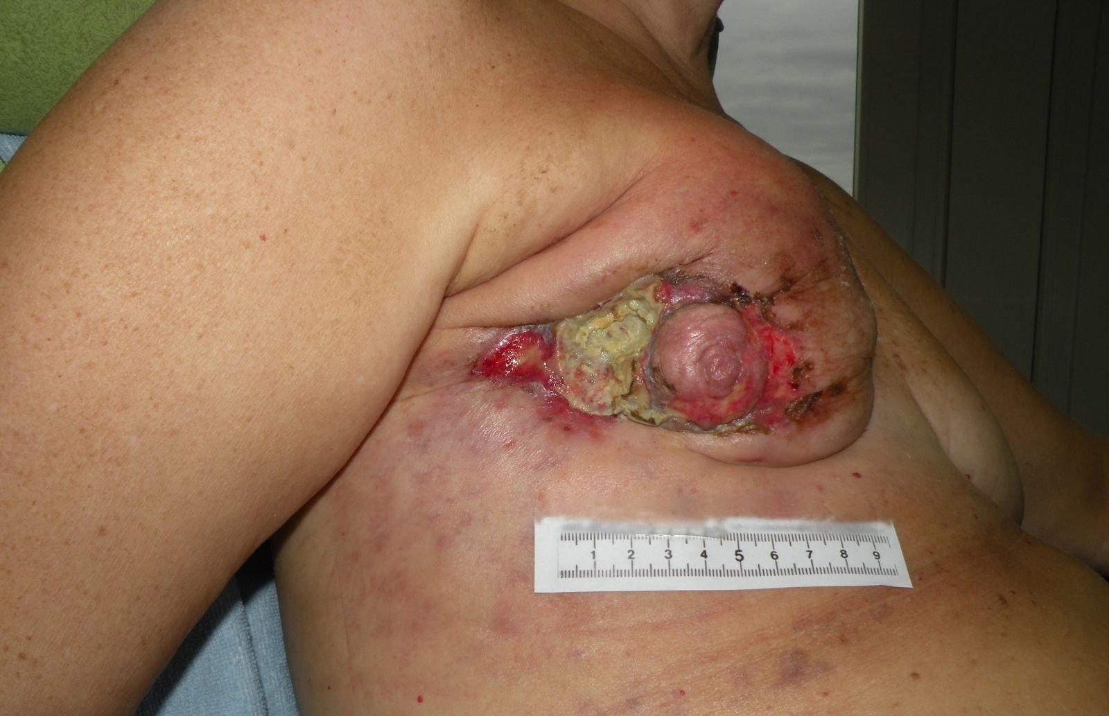 Frau K. war sehr zufrieden mit dem bisherigen Ergebnis und erlaubte sich jetzt, auf eine vorher nicht vermutete vollständige Wundheilung zu hoffen. Schon zu diesem Zeitpunkt beschrieb sie eine deutlich gesteigerte Lebensqualität. Inzwischen hatte sich ihre Zielsetzung bezüglich der Arbeitssituation geändert. Sie musste erkennen, dass selbst eine vollständige Wundheilung keine Heilung des Mamma-Karzinoms bedeutete und wollte die ihr verbleibende Zeit mit ihrer Familie und Freundin so gut wie möglich nutzen.