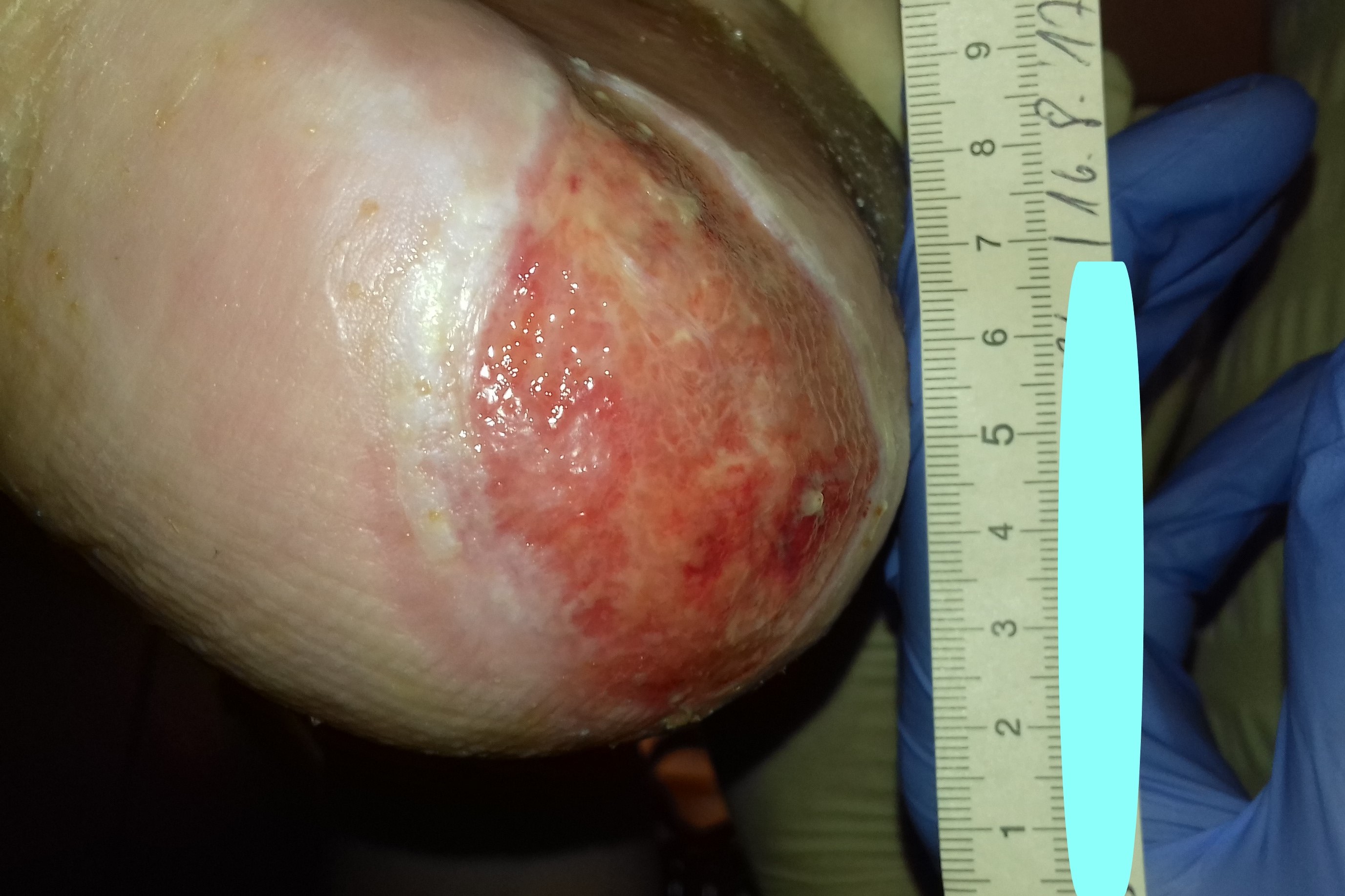 Der Dekubitus an seiner linken Ferse wurde als Kategorie 3 nach EPUAP klassifiziert und wies eine Länge von 6,3 cm und eine Breite von 4 cm auf (Foto 1). Am Wundgrund zeigten sich Granulation, Fibrin und Biofilm. Der Wundrand war stellenweise mazeriert, die Wundumgebung trocken und teilweise schuppig. Zu diesem Zeitpunkt exsudierte die Wunde viel schleimig-trübes, geruchloses Exsudat. Herr P. litt unter starken Schmerzen (VAS 5), die bei Berührung der Wunde noch weiter zunahmen (VAS 7).