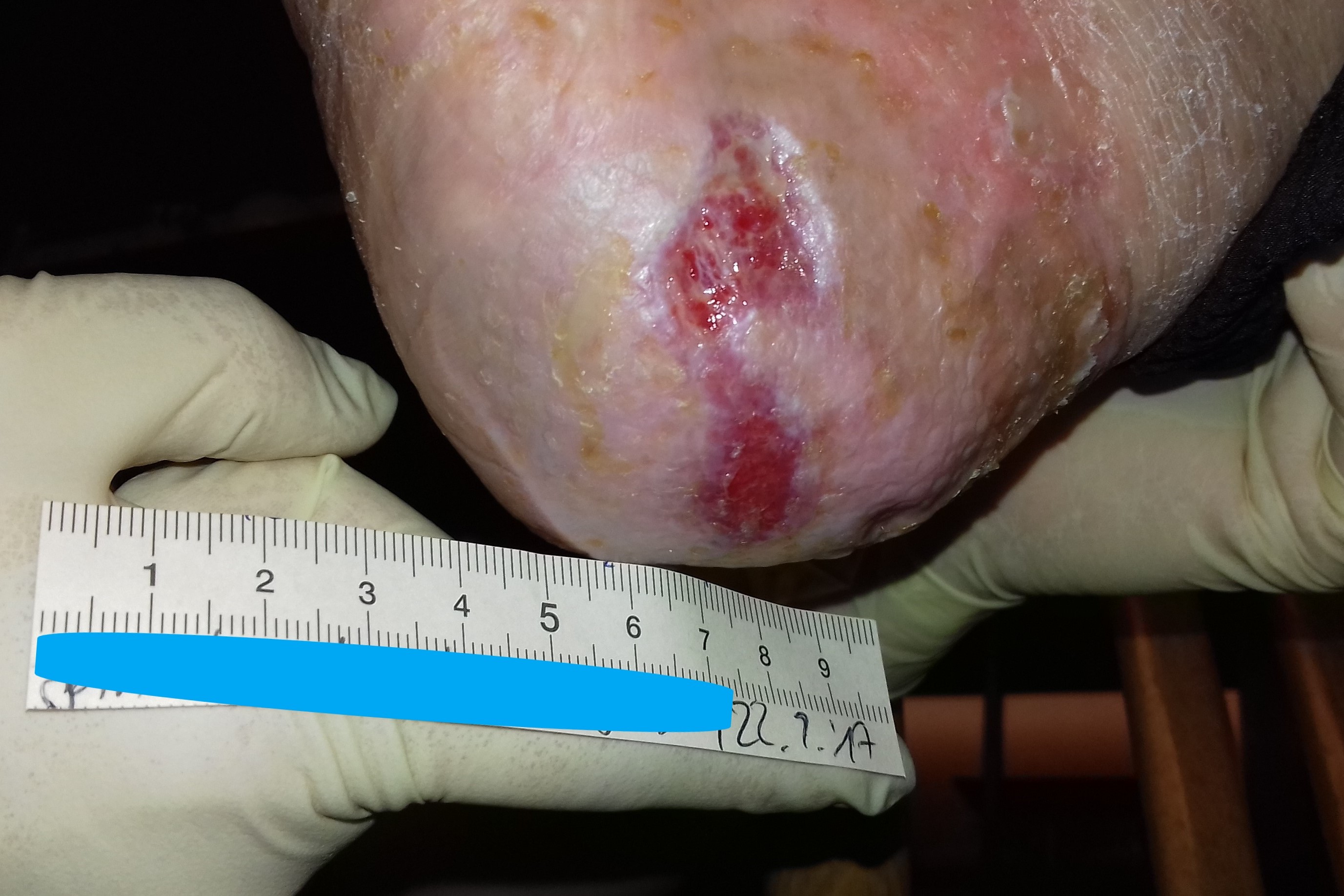 Die Wunde wurde zunächst mit einer Wundspüllösung und Kompressen vorsichtig gereinigt. Anschließend wurde ein selbstklebender Schaumverband angelegt, der alle 2 Tage gewechselt wurde. Es wurde zu diesem Zeitpunkt leider versäumt, eine adäquate Druckentlastung vorzunehmen. Zumindest seine COPD machte Herrn P. zu diesem Zeitpunkt aber kaum Beschwerden und auch die Herzinsuffizienz war medikamentös gut eingestellt, sodass die Vorerkrankungen die Wundheilung nicht beeinträchtigten.