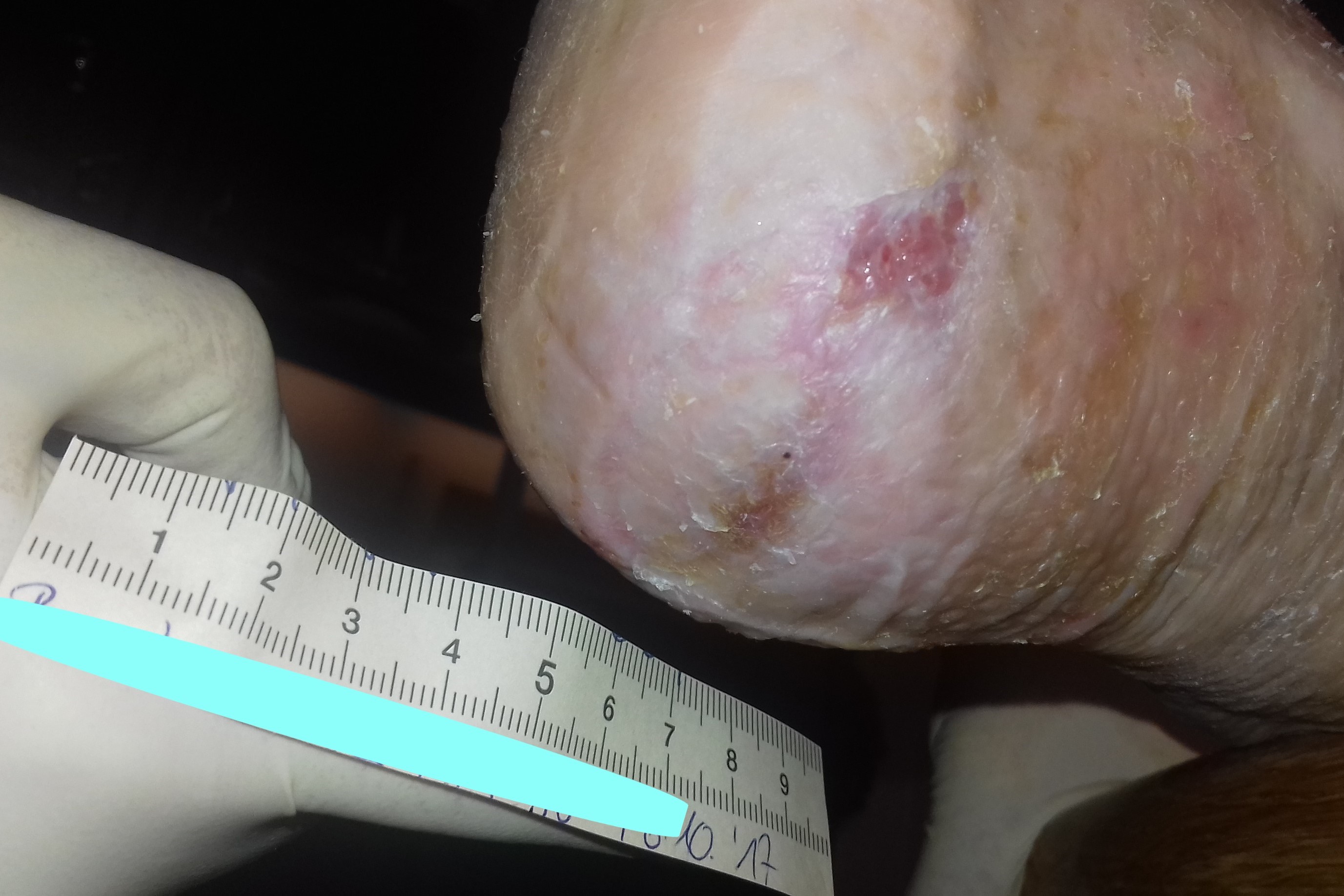 Weitere 2 Wochen später hatte sich die Wunde weiter verkleinert und war nun 1,1 cm lang und 0,8 cm breit (Foto 4). Am Wundgrund waren deutlich Granulations- und teilweise Epithelgewebe erkennbar. Eine der beiden kleineren Wunden war inzwischen vollständig geschlossen. Die Exsudation hatte inzwischen deutlich abgenommen und es gab nur noch wenig bis gar kein Exsudatsaufkommen. Am intakten Wundrand und auf der trocken-schuppigen Wundumgebung waren aufgrund einer gestiegenen Belastung der Ferse teilweise leichte Hyperkeratosen erkennbar. Schmerzen gab Herr P. aufgrund der gut eingestellten Medikation nicht mehr an.
