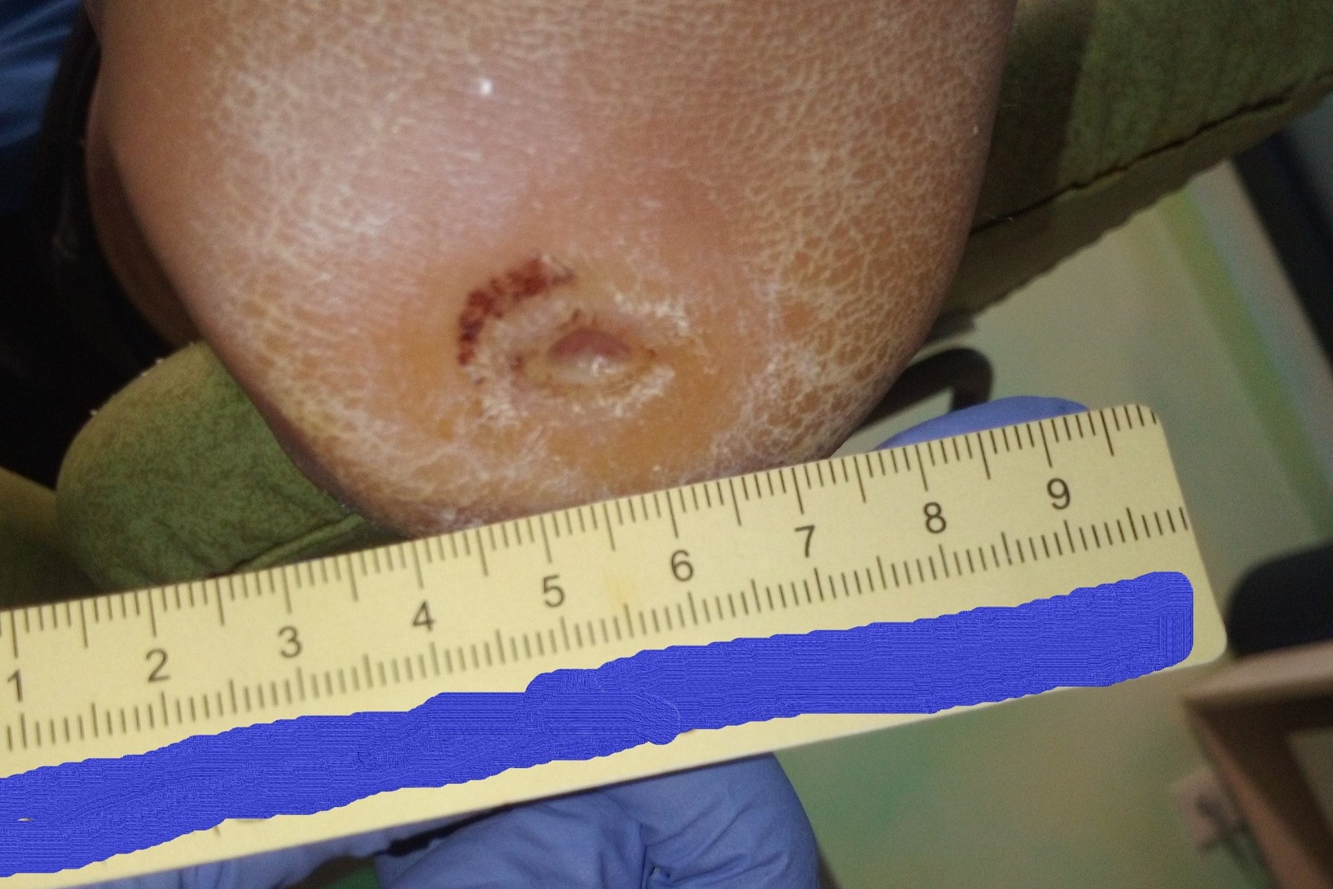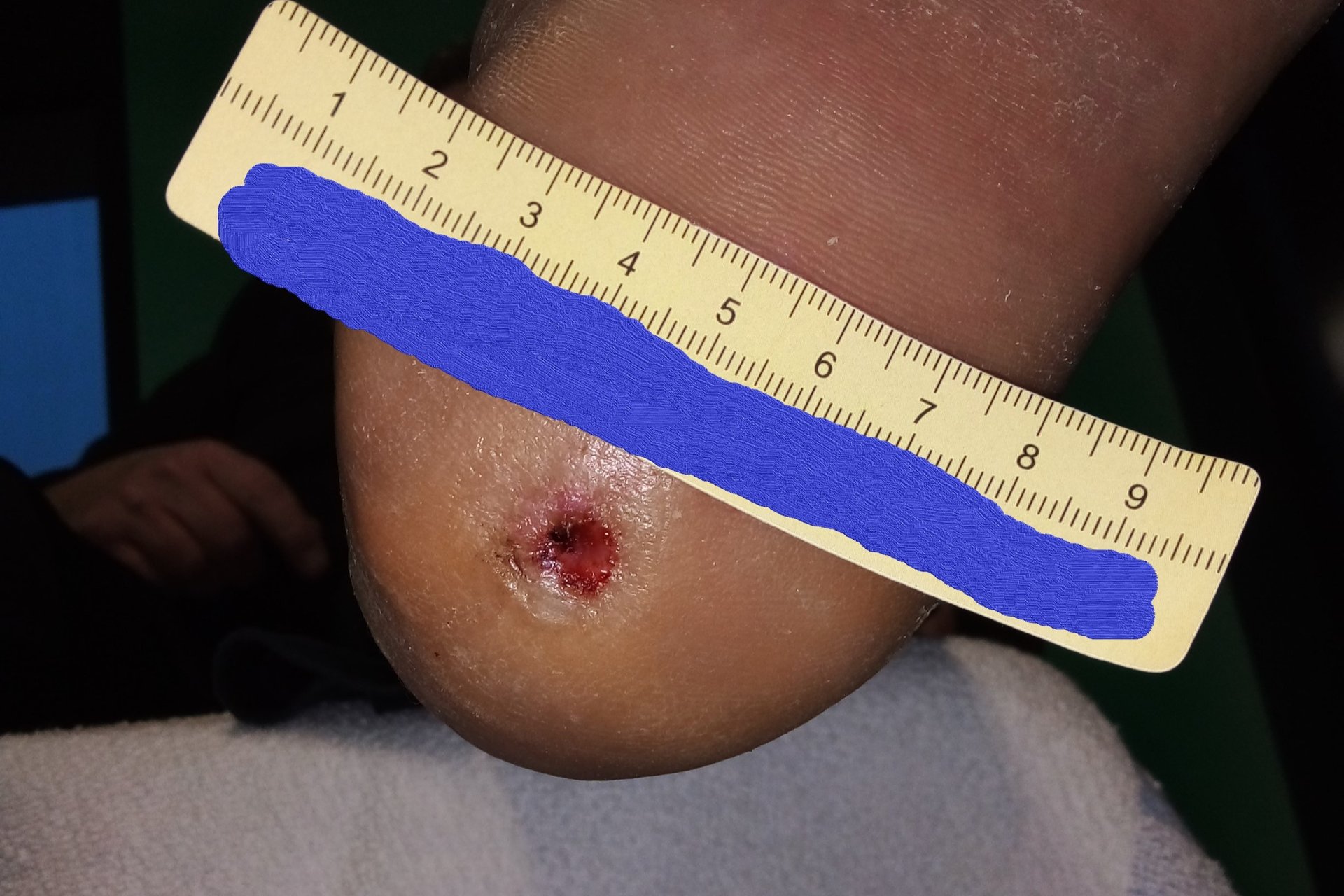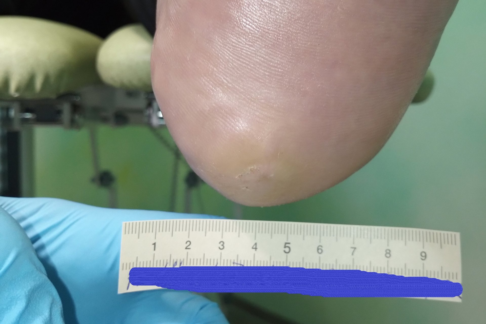 Nach weiteren 2 Monaten war die Wunde noch 0,5 cm lang und breit sowie 0,2 cm tief (Foto 4). Eine Wundanfrischung erfolgte durch den behandelnden Arzt, das hyperkeratotische Gewebe wurde am Wundrand entfernt. Dadurch hatte sich das Ausmaß der Wunde um wenige Millimeter vergrößert. Eine neue Betreuungsperson, die einen guten Zugang zu Herrn P. gefunden hatte, konnte ihn mit Aktivitäten im Sitzen gut beschäftigen. So konnte eine adäquate Druckentlastung seiner Füße erreicht werden. Das Versorgungsintervall konnte daraufhin auf 5 Tage verlängert werden. Außerdem wurde ab diesem Zeitpunkt auf die Hydrofaser verzichtet.