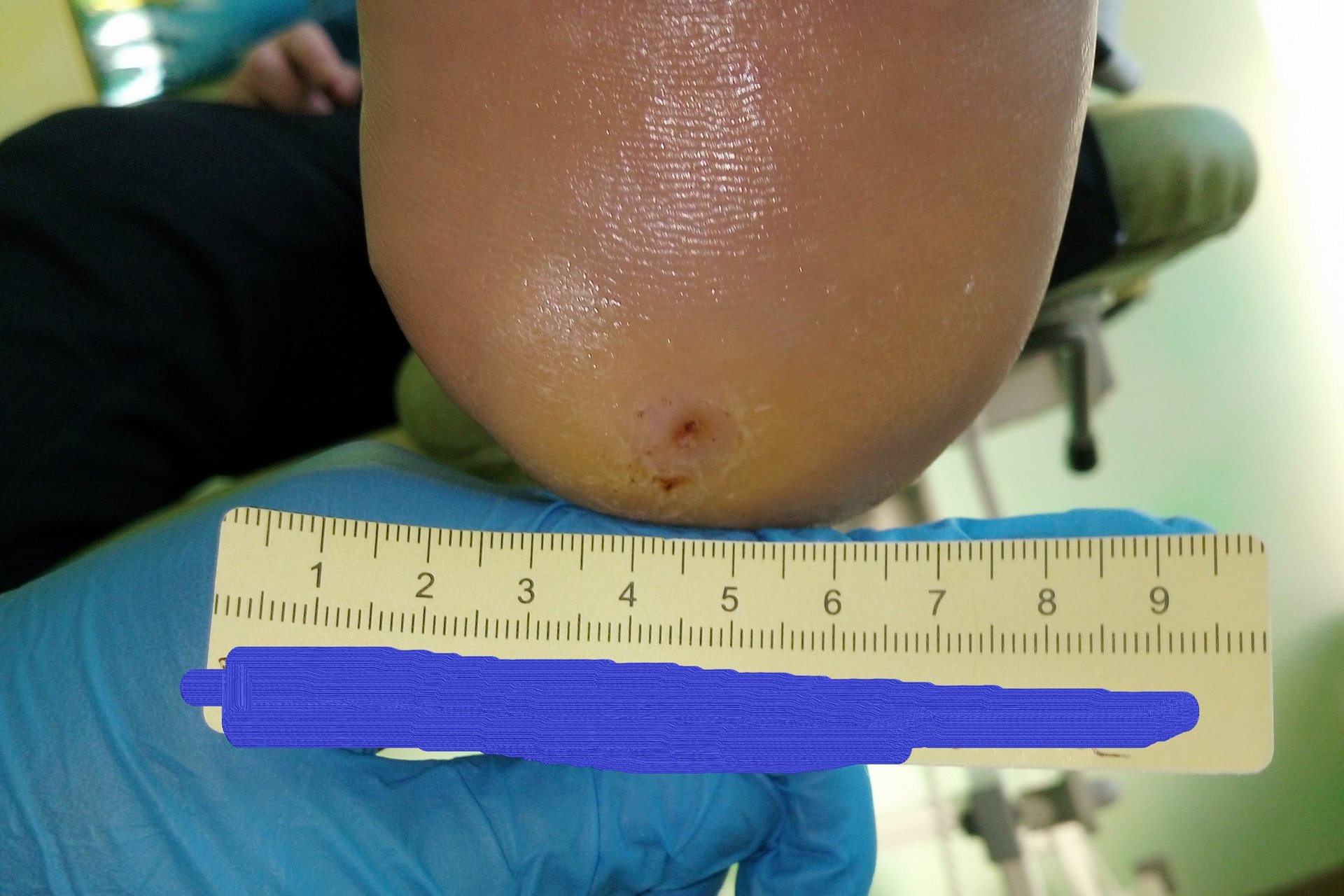 Die Umsetzung der Empfehlungen gelang sehr gut. Da Herr P. regelmäßig behandelt wurde, konnten ihm die Empfehlungen immer wieder neu erklärt werden, sodass er es die meiste Zeit über schaffte, sich daran zu halten. Dadurch konnte sich die Wunde binnen 5 Wochen auf eine Länge von 0,7 cm, eine Breite von 0,3 cm und eine Tiefe von 0,2 cm verkleinern (Foto 2). Die Wunde sonderte wenig Exsudat ab. Granulationsgewebe war reichlich vorhanden, die Epithelisierung war weit vorangeschritten, Fibrinbelag nur sehr wenig vorhanden. Der hyperkeratotische Wundrand war nach wie vor vorhanden.