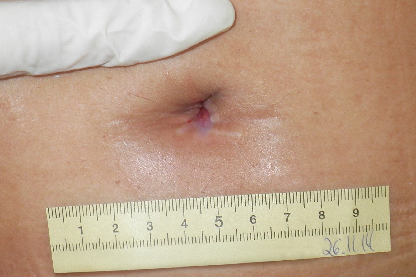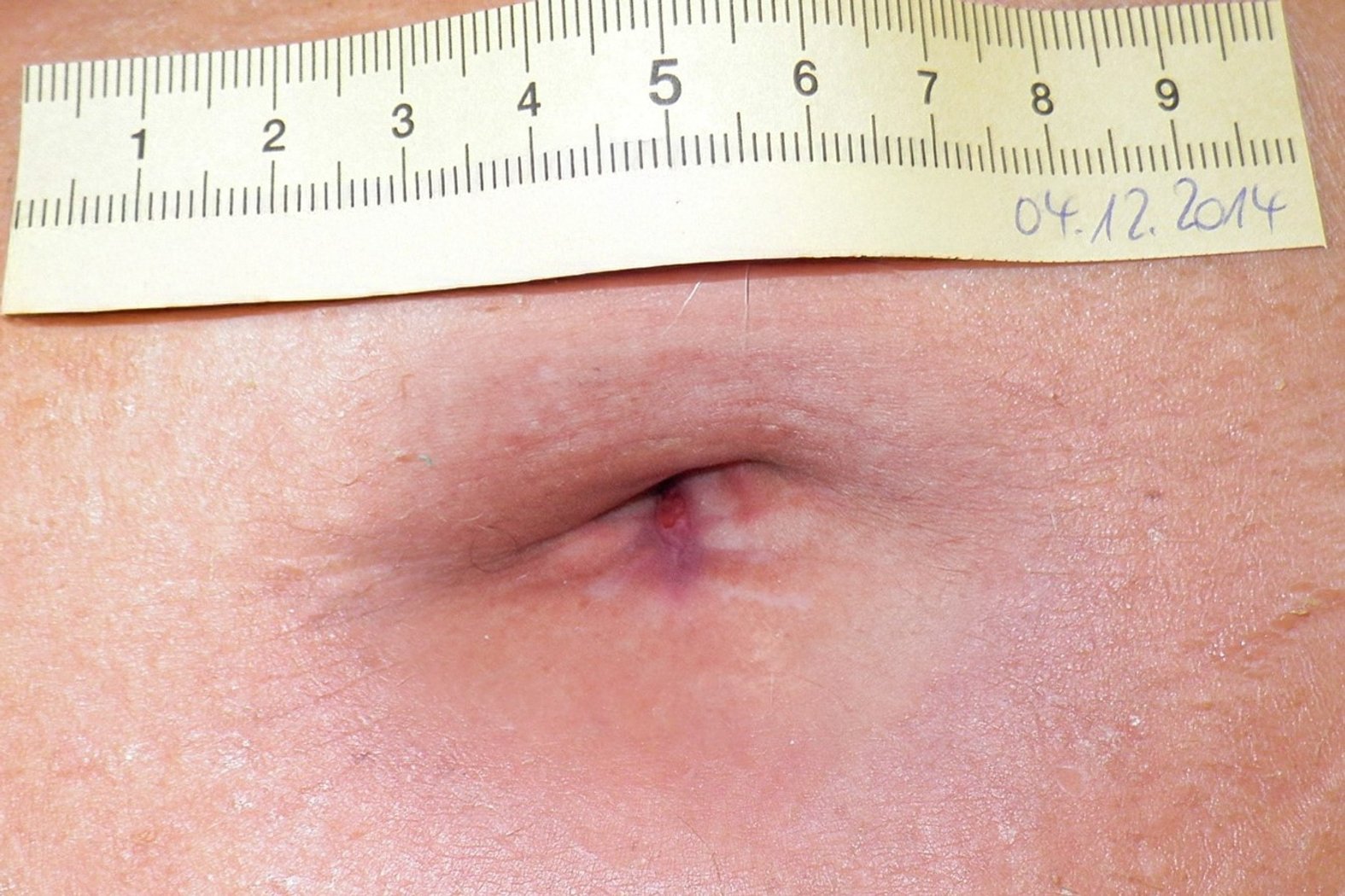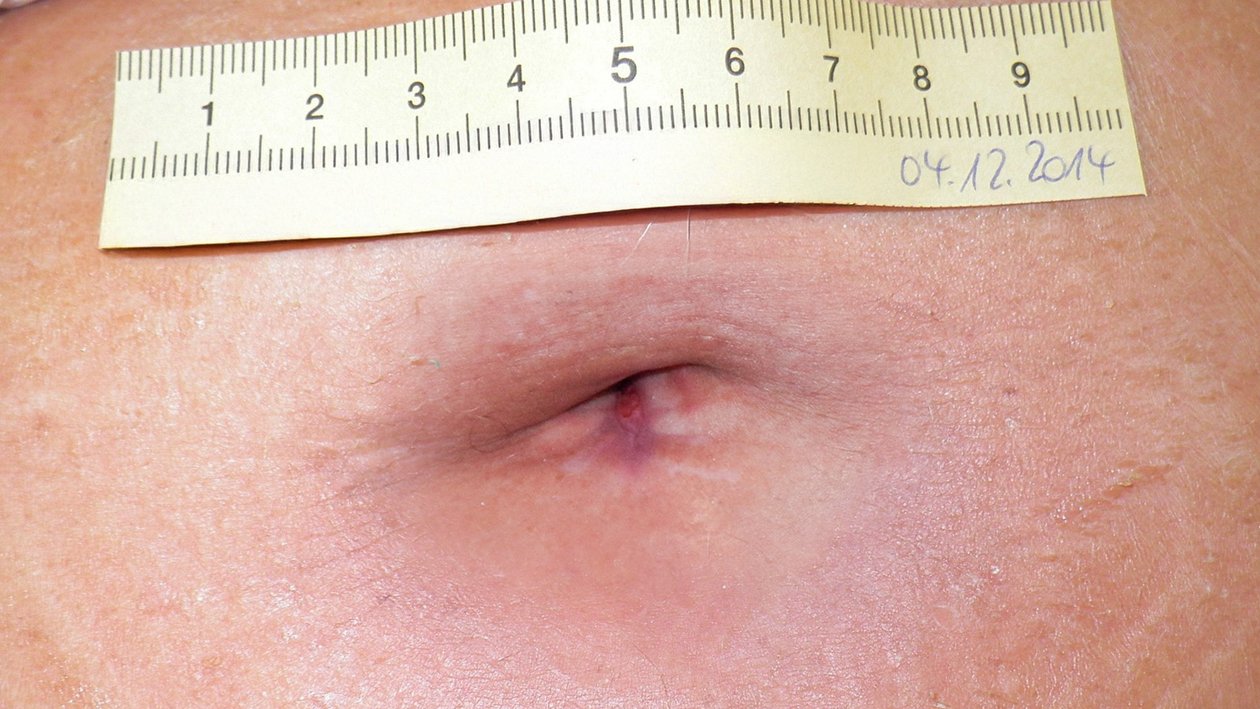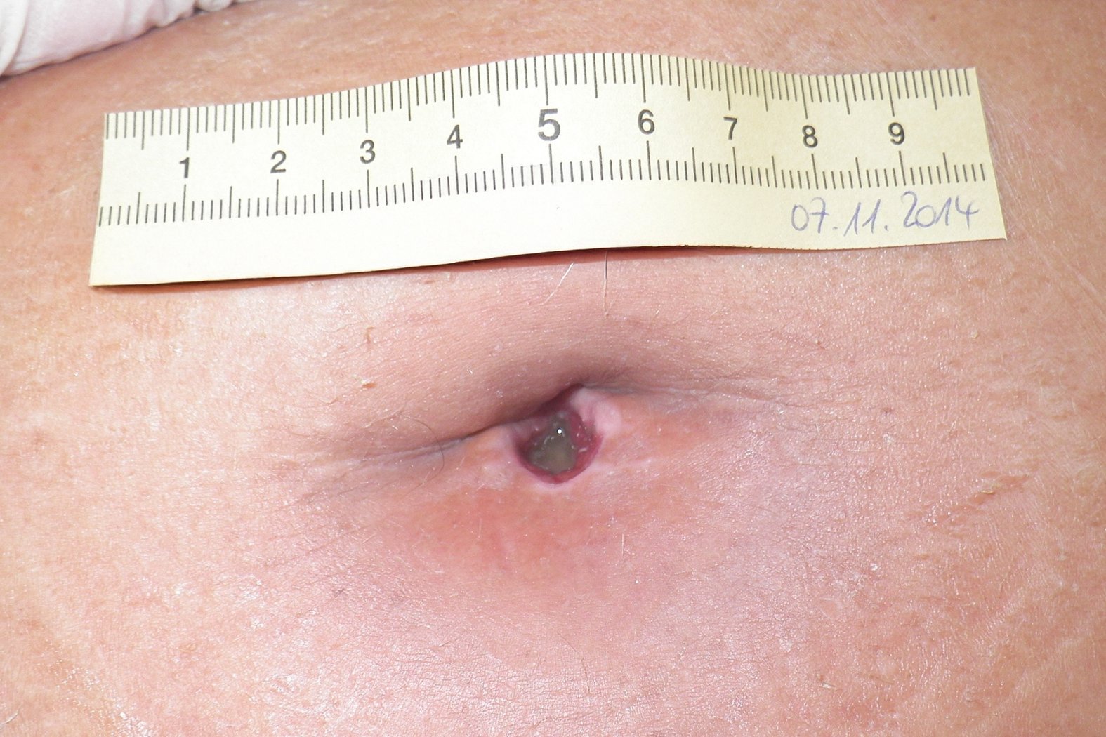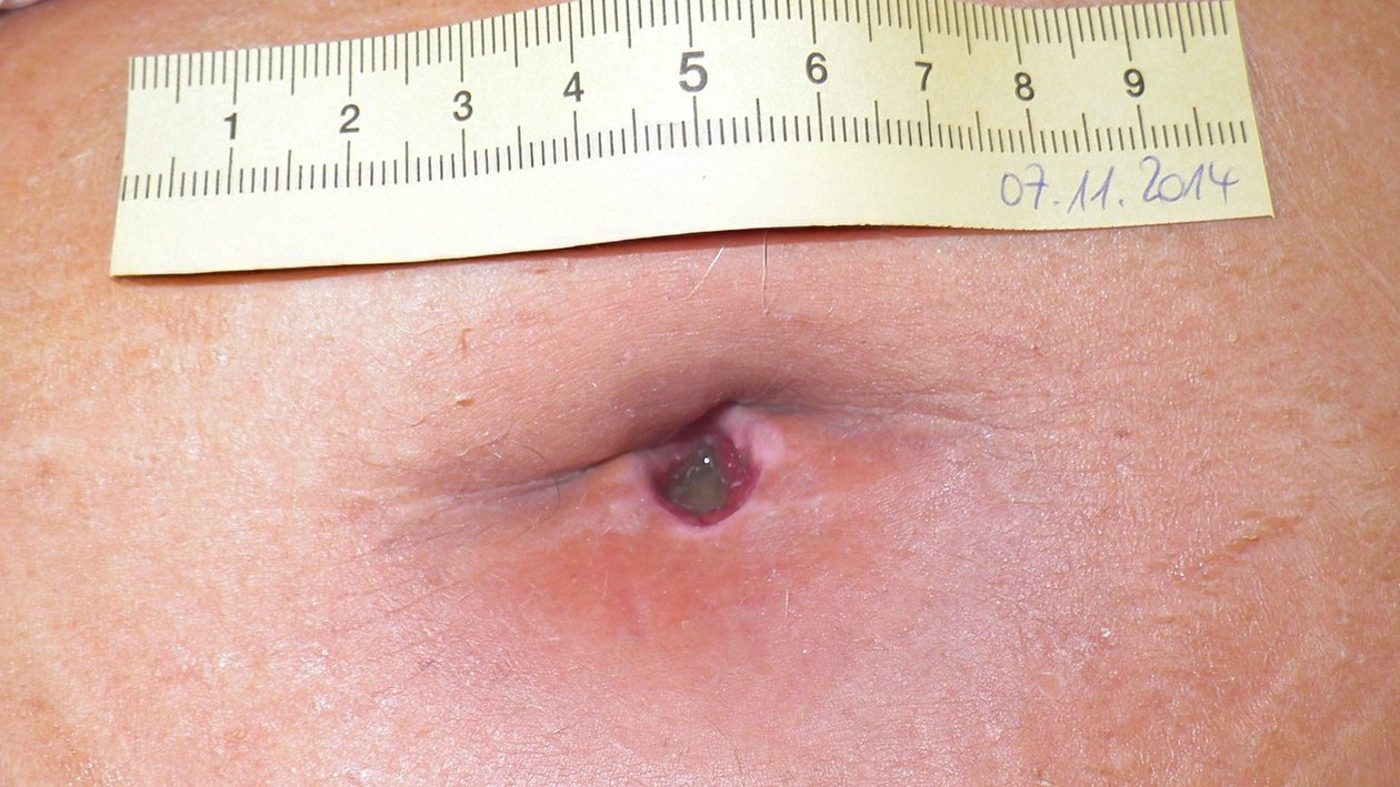 Zu Beginn wird der Verband am Bauchnabel entfernt. Die Wunde ist 0,9 cm lang, 0,7 cm breit und 0,5 cm tief (Foto 1). Der Wundgrund ist mit Fibrin und Biofilm belegt, der Wundrand und die Umgebungshaut sind unauffällig. Es ist viel gelblich-klares, geruchloses Exsudat erkennbar. Schmerzen gibt Frau F. nicht an.