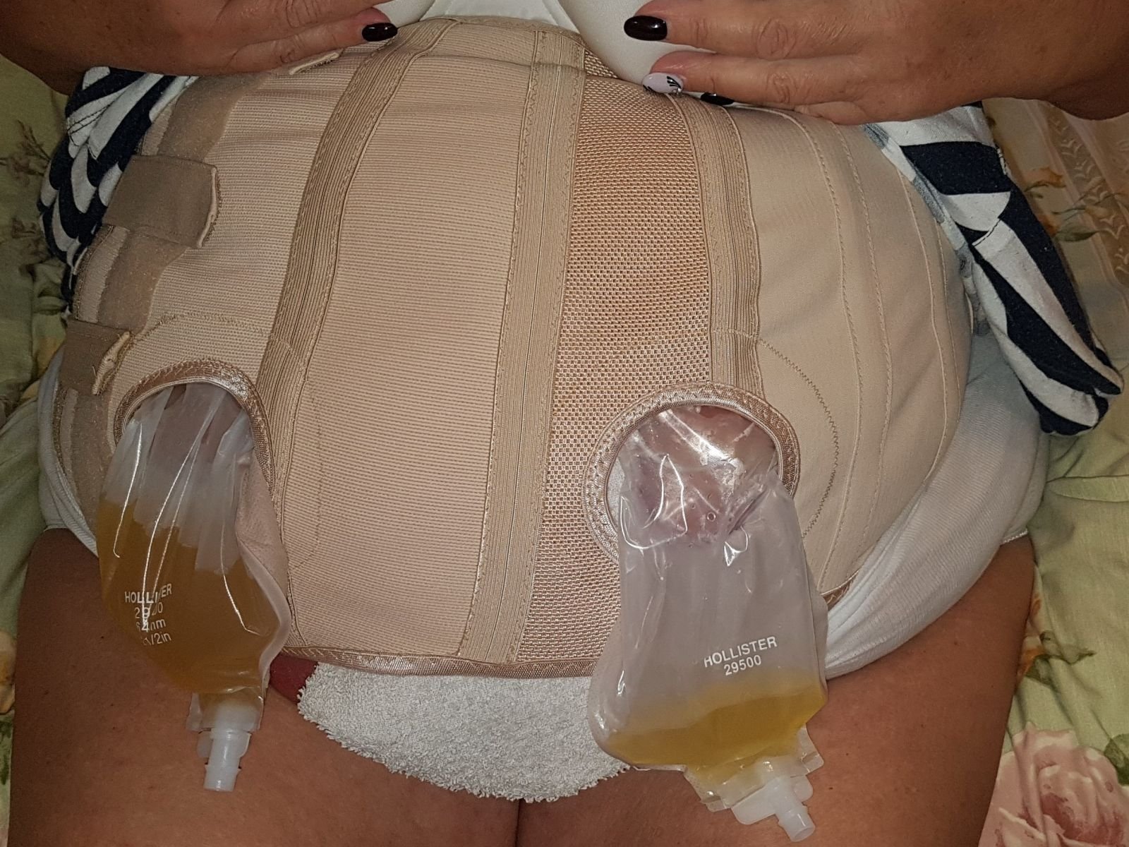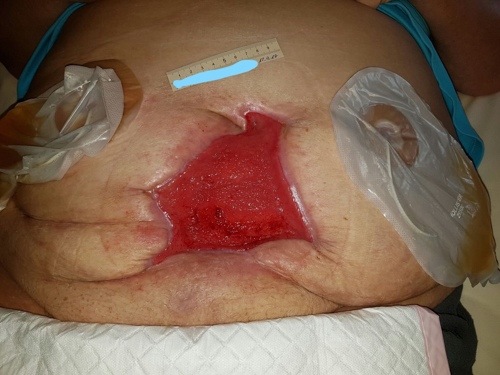 Die Fixierung des Wundverbandes war durch die Bauchfalten und die Stomaanlagen erschwert und hielt nicht richtig. Beim Aufstehen und Herumgehen lösten sich immer mal wieder Ecken der Fixierung und es musste nachgeklebt werden.