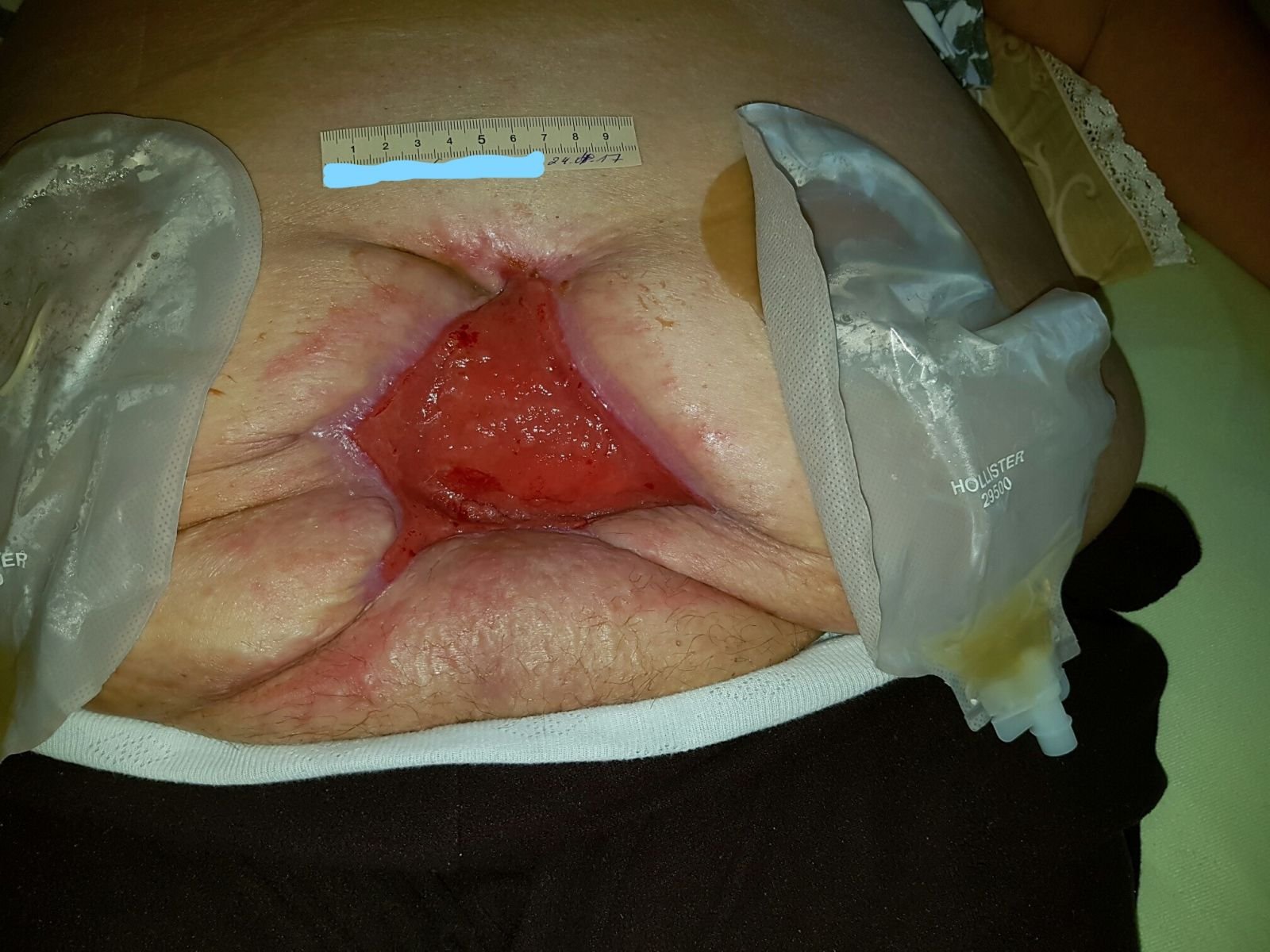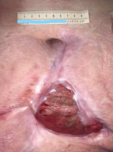 Frau L. ist eine verwitwete 67-jährige Frau mit Adipositas Grad III und Diabetes mellitus (noch nicht insulinpflichtig), die an einem muskelinvasiven Plattenepithelkarzinom der Harnblase erkrankt war. Im Februar 2017 erfolgte die radikale Zystektomie (Entfernung der kompletten Harnblase) mit Anlage eines beidseitigen transkutanen Urostoma. In der Folge entwickelte sich eine Dehiszenz der OP-Naht bis zur Faszie mit kleineren Abszessen.