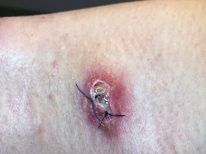 Frau L. ist eine verwitwete 67-jährige Frau mit Adipositas Grad III und Diabetes mellitus (noch nicht insulinpflichtig), die an einem muskelinvasiven Plattenepithelkarzinom der Harnblase erkrankt war. Im Februar 2017 erfolgte die radikale Zystektomie (Entfernung der kompletten Harnblase) mit Anlage eines beidseitigen transkutanen Urostoma. In der Folge entwickelte sich eine Dehiszenz der OP-Naht bis zur Faszie mit kleineren Abszessen.