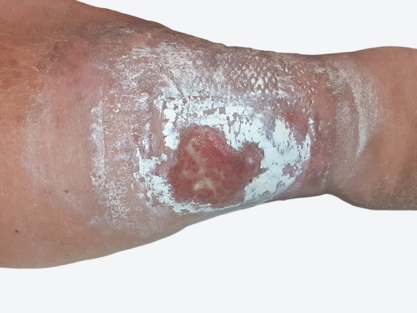 In ihrer Verzweiflung wandte sich die Patienten an einen Bekannten, der selbst im Bereich Wundversorgung tätig ist. Dieser erklärte ihr und ihrem Mann das Prinzip eines mechanischen Débridements mit sterilen Kompressen und empfahl die Versorgung mit einer Schaumstoffwundauflage, die speziell für die Versorgung am Zeh entwickelt wurde. Mit diesem Wissen traute die Patientin sich die Wundreinigung zu (Bild 7) und es zeigte sich schnell eine Verbesserung. Erst die Zehenkappen, mit denen die Therapie nun fortgesetzt wurde, sowie Tipps für die Wundversorgung, welche die Patientin aus ihrem Bekanntenkreis erreichten, halfen ihr schließlich.