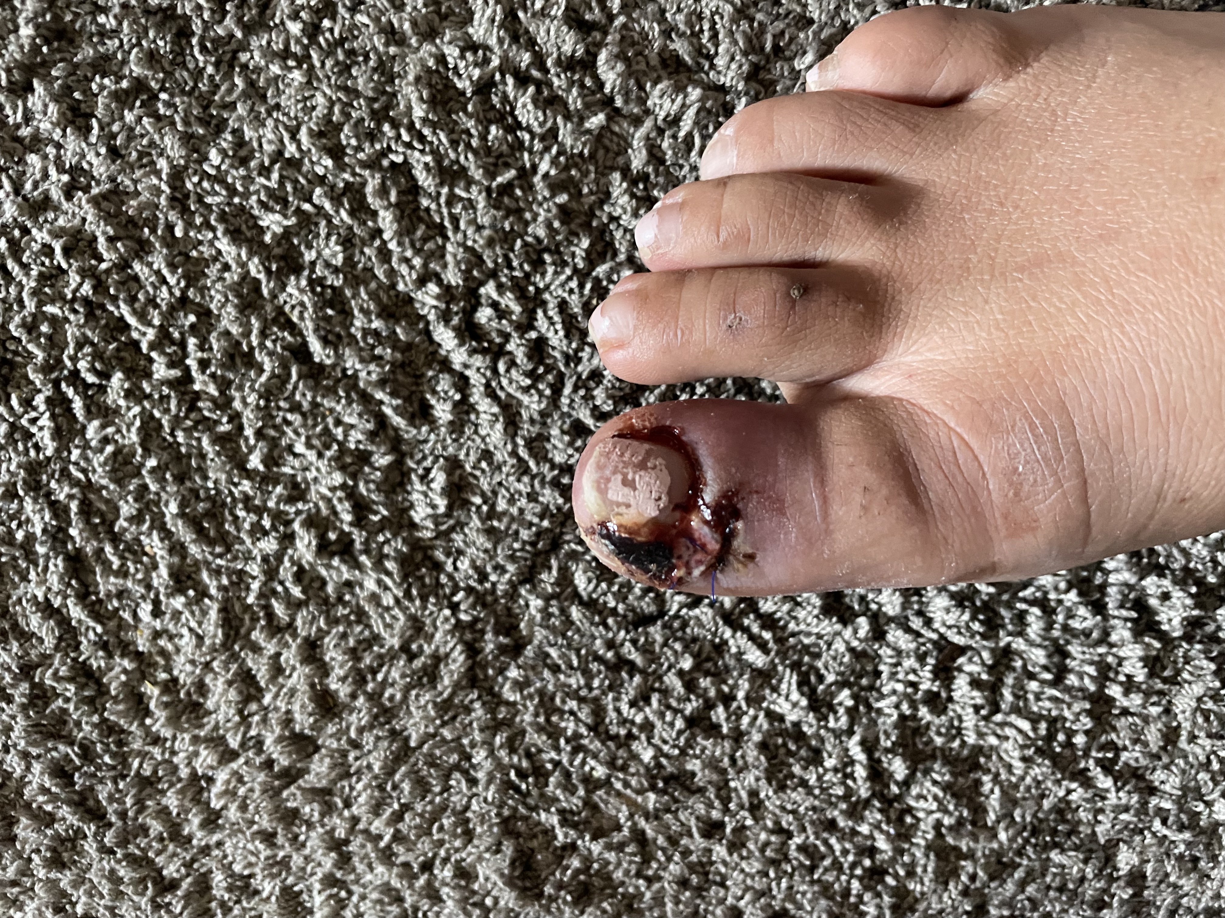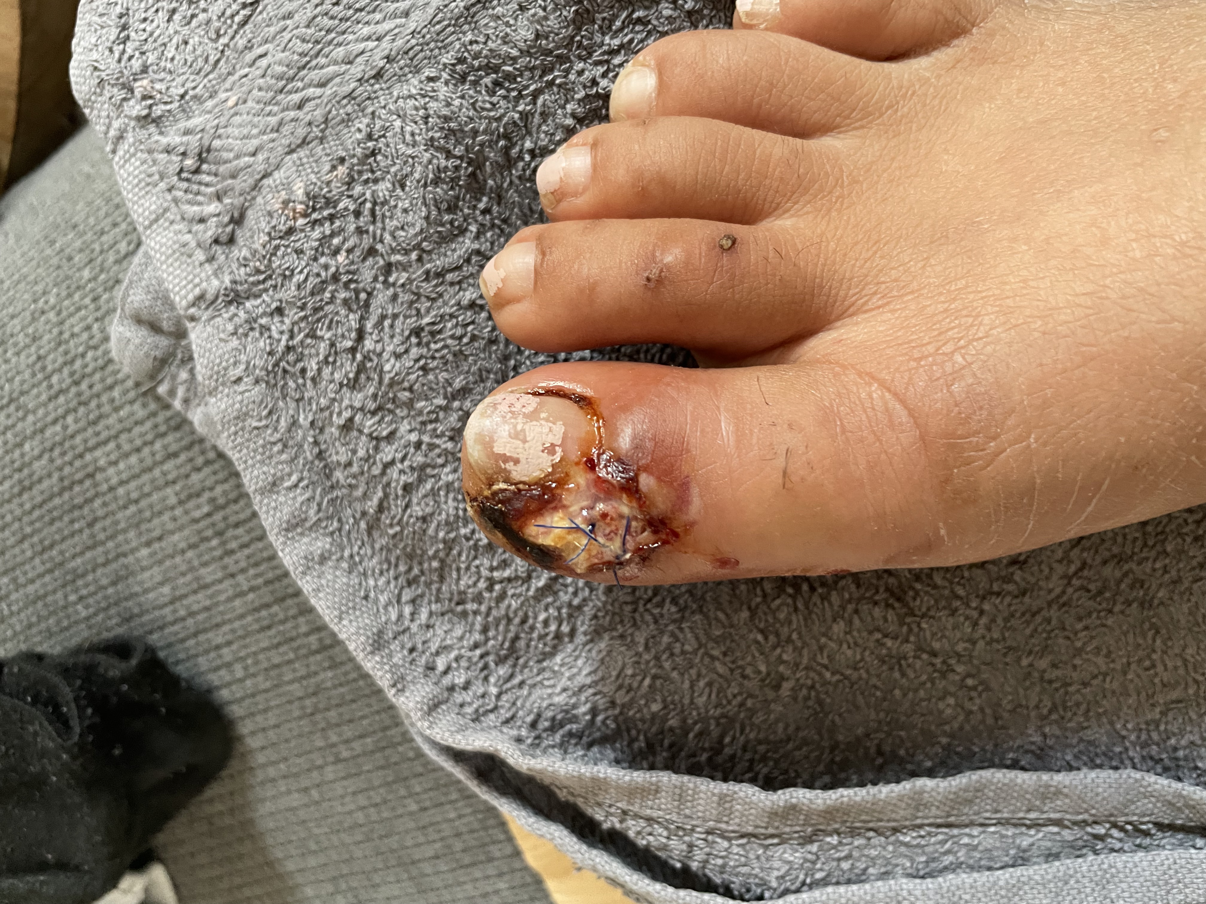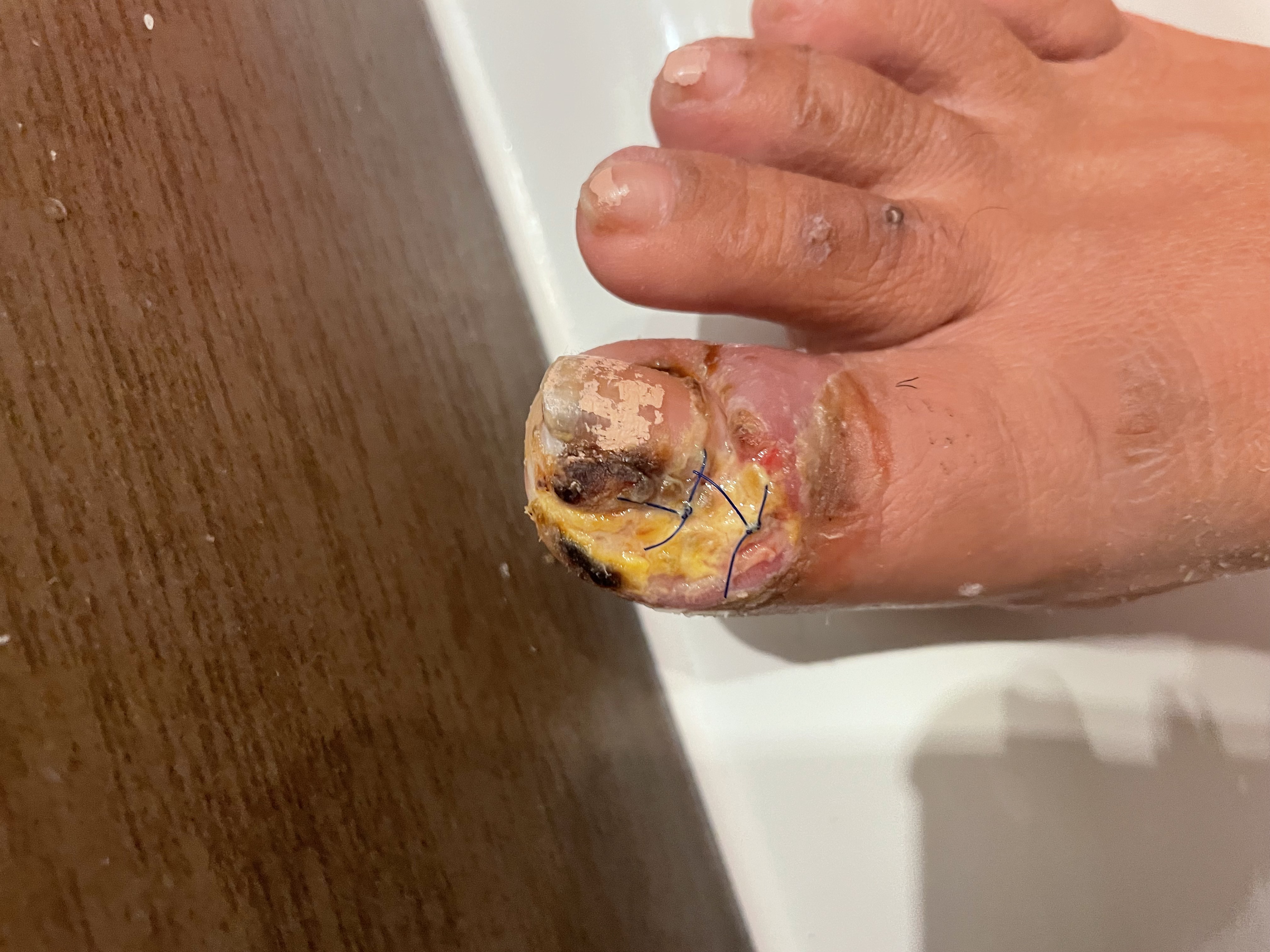 Die 29-jährige Patientin litt zu Beginn an einer Nagelbettentzündung am großen Zeh des rechten Fußes (Bild 1). Starke Schmerzen bewegten sie dazu, die Notaufnahme aufzusuchen, wo entzündetes Gewebe entfernt wurde (Bild 2). Später wurde in einer chirurgischen Praxis eine Operation (Nagelbettinzision) durchgeführt und die Wunde anschließend genäht (Bild 3).