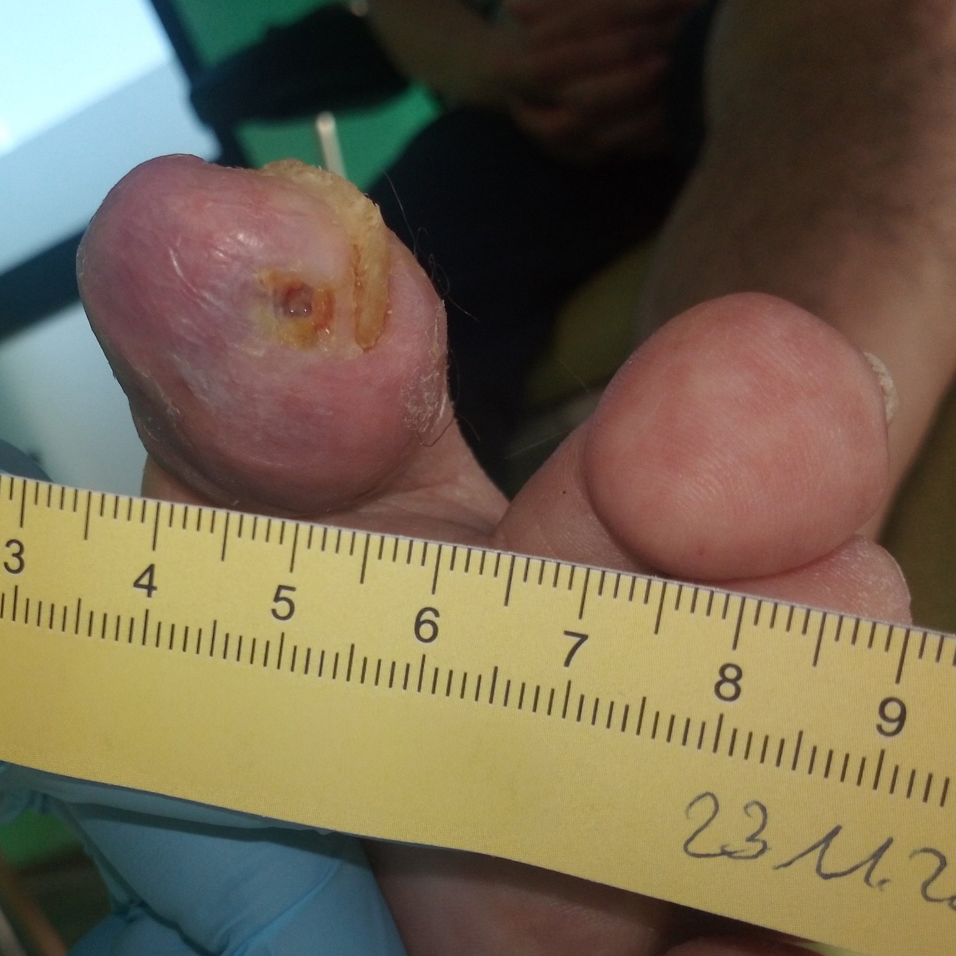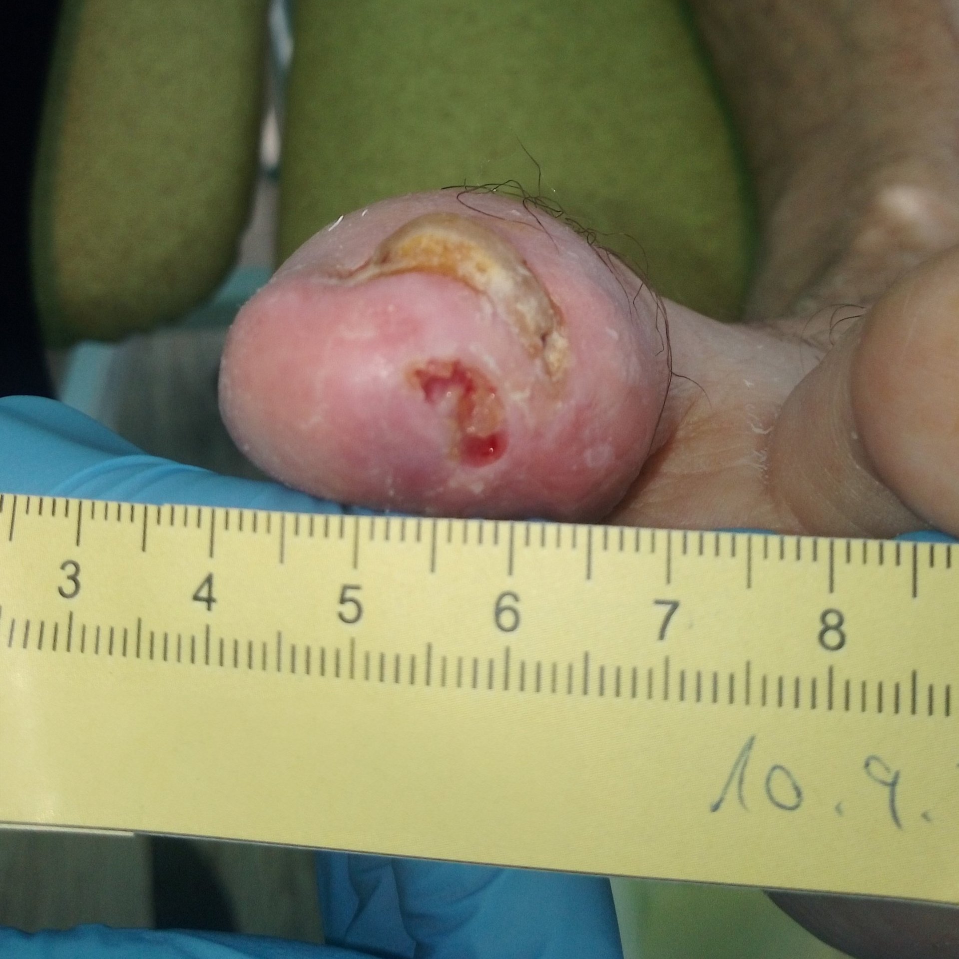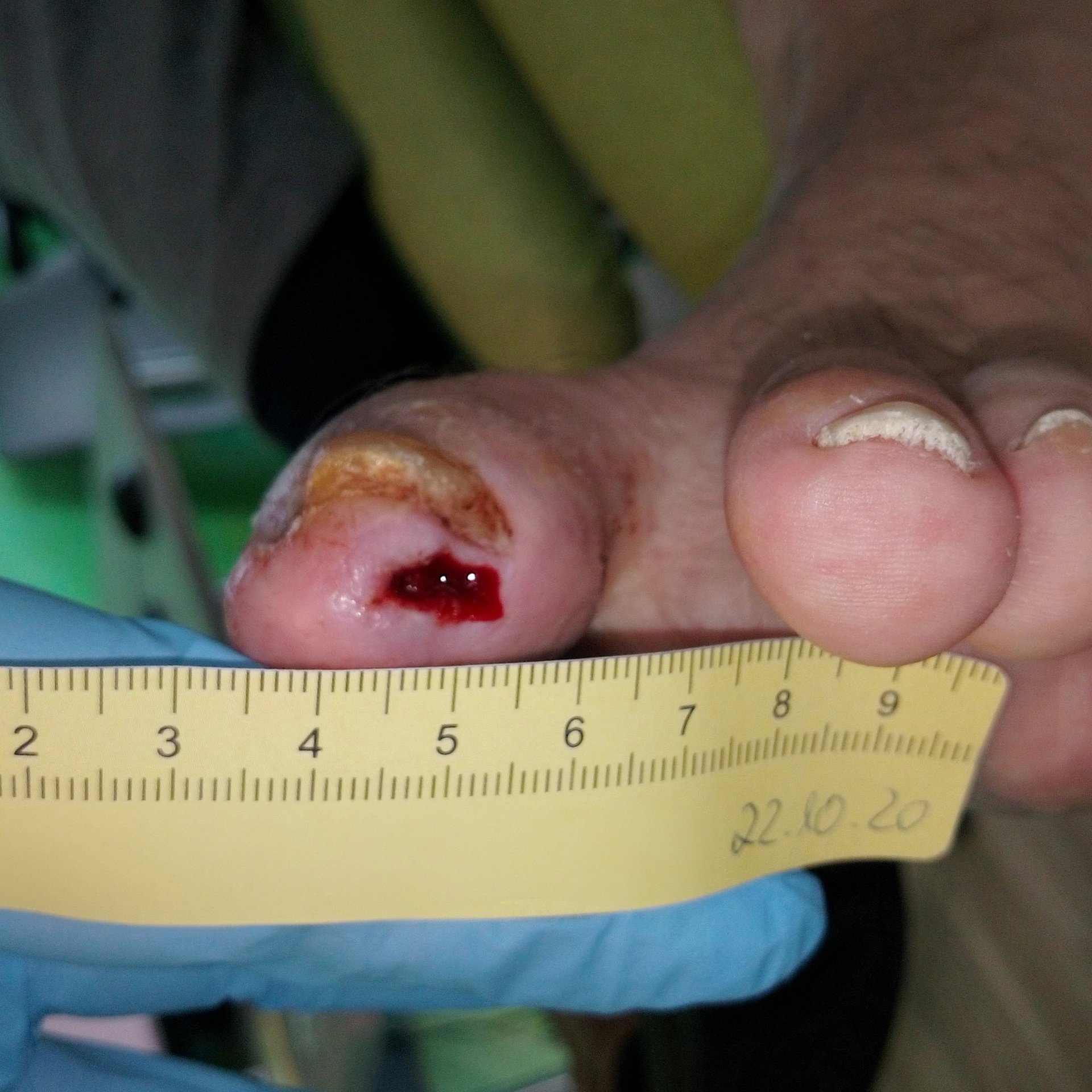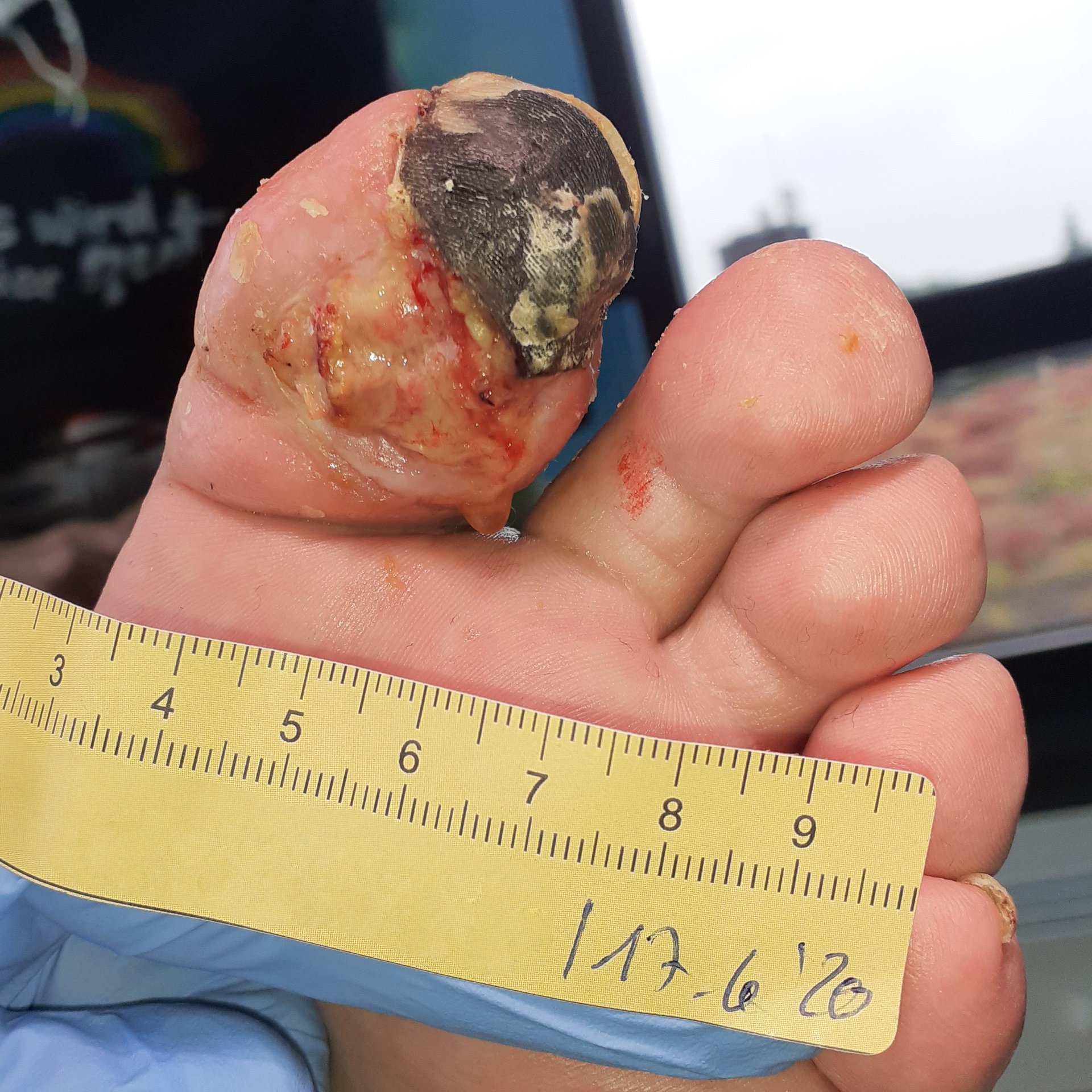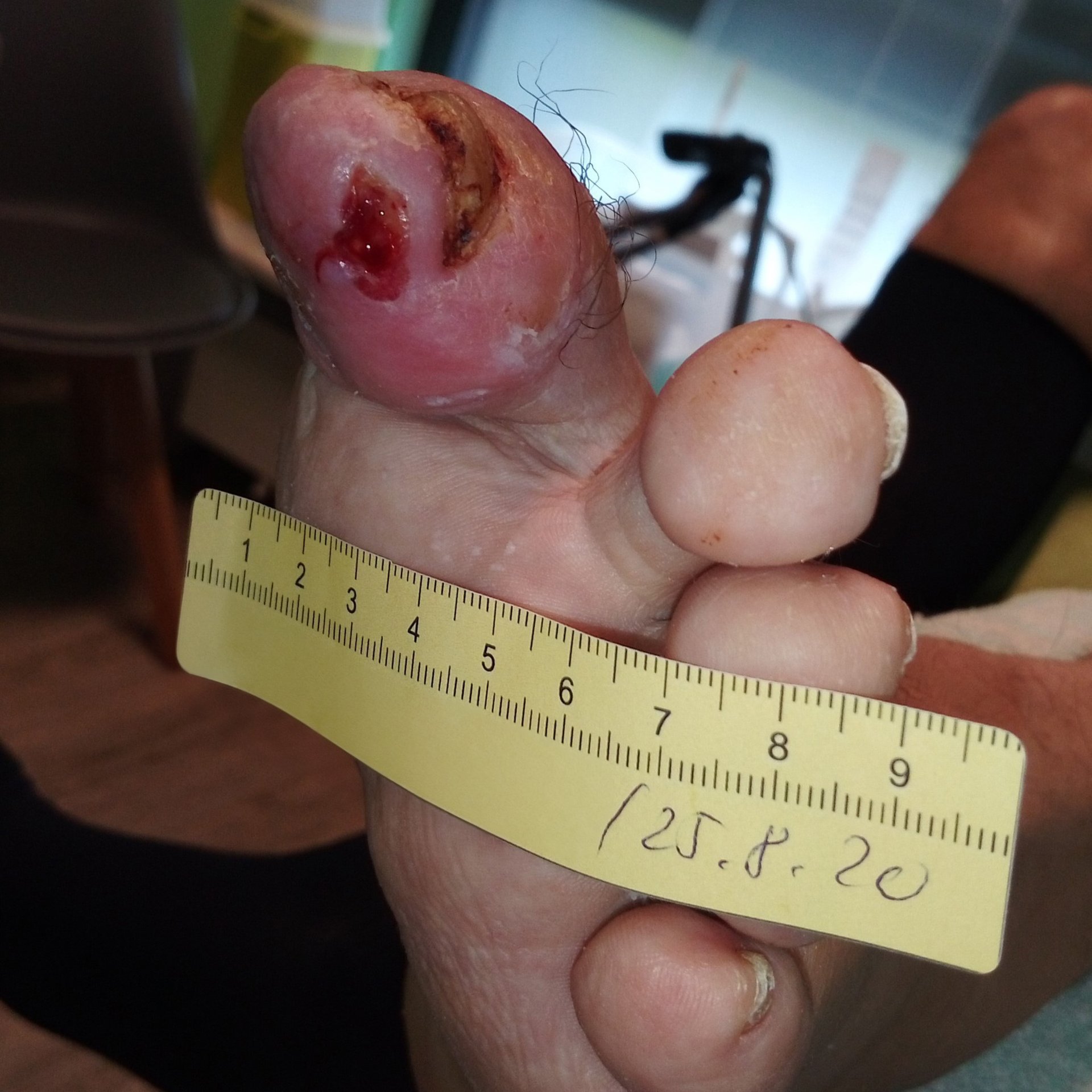 Herr W. hatte infolge einer Sepsis mit Multiorganversagen 6 Wochen in einer stationären Rehabilitationseinrichtung verbracht. Etwa 1 Woche nach seiner Entlassung aus der stationären Rehabilitation kam er in Begleitung seiner Ehefrau in die Praxis. Am großen Zeh (D1) seines linken Fußes zeigte sich eine Wunde mit trockenen und feuchten Nekrosen, die 3 cm lang, 2,5 cm breit und bis zu 0,4 cm tief war.