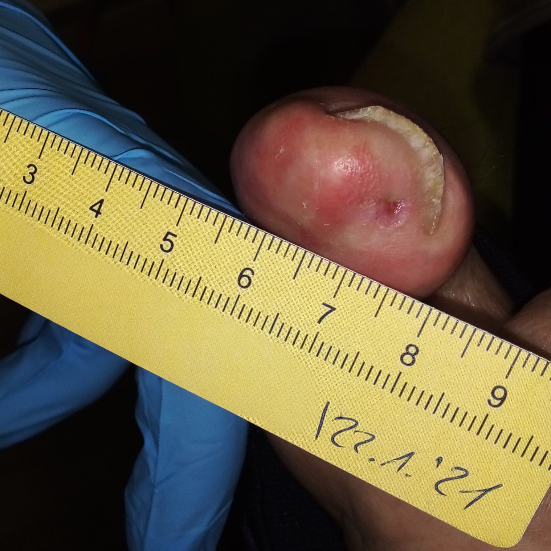 Nach 3 Wochen zeigte sich die Wunde vollständig ohne Nekrosen und war noch 1,4 cm lang und breit sowie bis zu 0,5 cm tief (Foto 2). Am Wundgrund waren neben Granulationsgewebe weiterhin Fibrin und Biofilm zu sehen. Die geruchlose und klar-seröse Exsudation war weiterhin stark. Es waren weiterhin Hyperkeratosen und Mazerationen am Wundrand erkennbar und die Umgebungshaut war leicht feucht. Der Zehennagel hatte sich zur Hälfte gelöst. Die Wundversorgung wurde wie bisher fortgesetzt, allerdings mit einem verkürzten Verbandwechselintervall von 2 Tagen, um der Mazeration entgegenzuwirken.