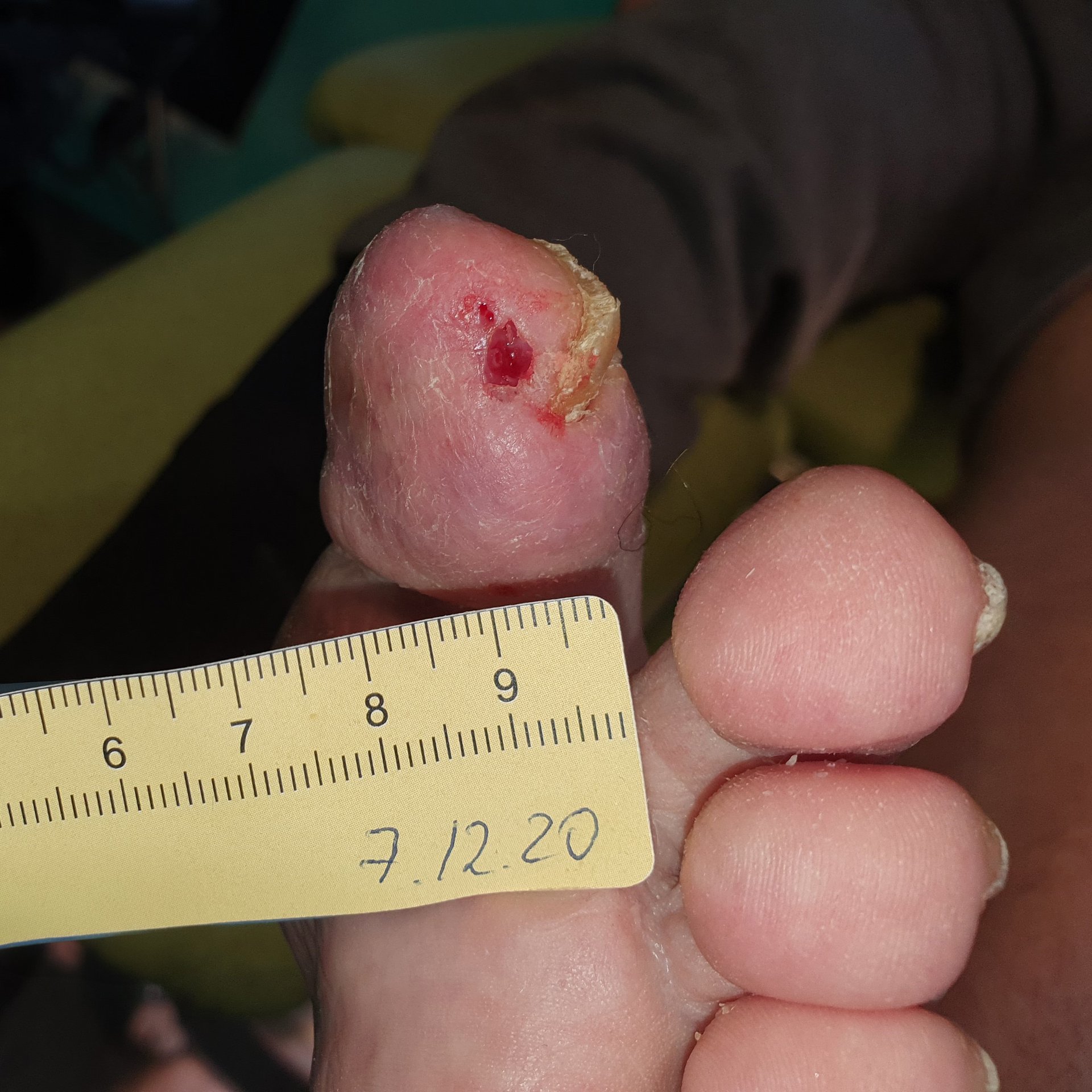 Bei der Erstvorstellung zeigte sich am linken großen Zeh von Herrn W. eine 3 cm lange, 2,5 cm breite und bis zu 0,4 cm tiefe Wunde mit trockenen und feuchten Nekrosen (Foto 1). Der Wundgrund war mit Fibrin und Biofilm belegt. Die Wunde exsudierte stark; das Exsudat war serös, klar und geruchlos. Schmerzen gab Herr W. nicht an.