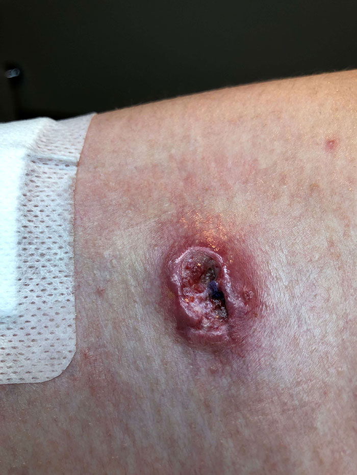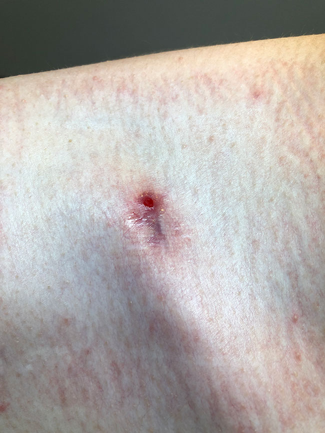 Die zuvor bestehende Wundbreite vergrößerte sich von 0,3 cm auf 1,3 cm. Die obere Naht wurde entfernt, um die Wunde zu öffnen und so ein chirurgisches Débridement mit einer Curette bis zum Wundgrund zu ermöglichen. Es wurde eine Wundreinigung und Wundspülung durchgeführt. Die Abdeckung erfolgte mit einer sterilen antimikrobiellen Gelkompresse und einer sterilen Schaumstoffwundauflage für infizierte Wunden. Der Verbandwechsel fand täglich statt (Bild 3: Tag 11).