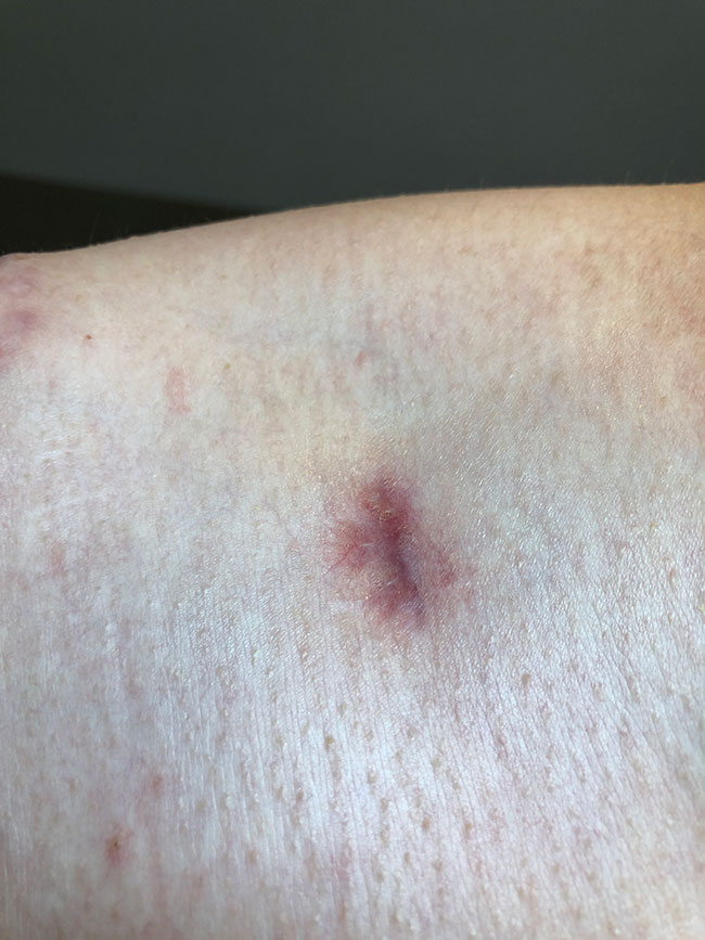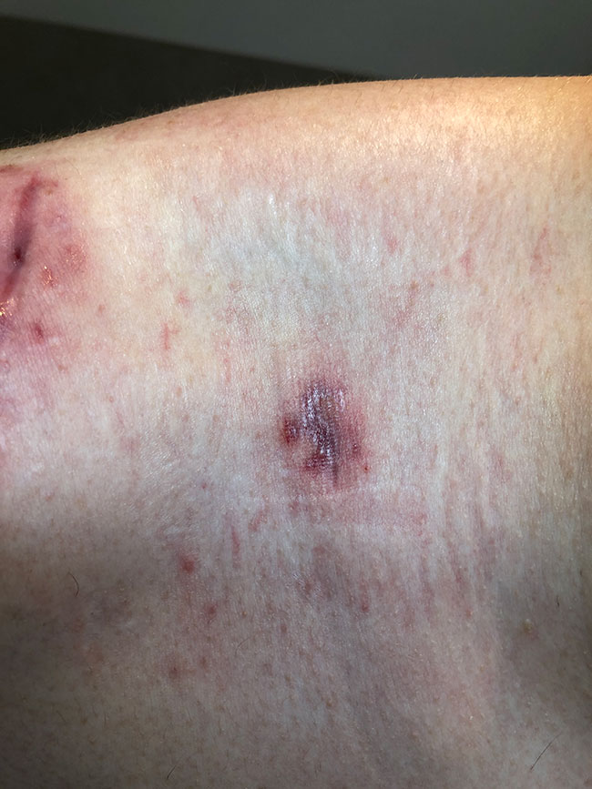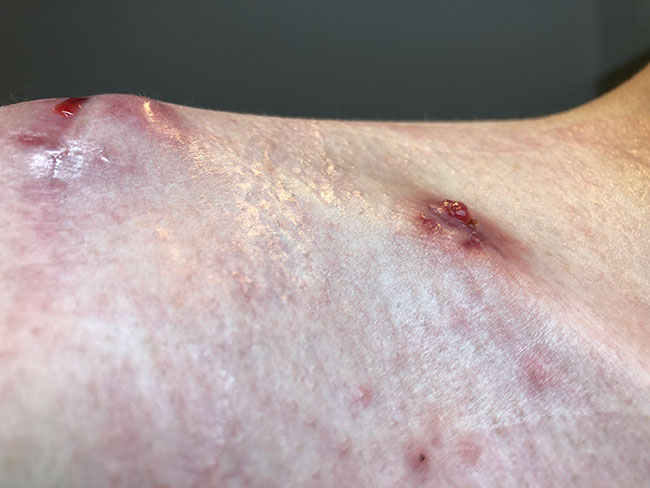 Fünf Tage nachdem die Hypergranulation vollständig zurückgebildet war, war die Wunde vollständig mit fragilem Epithelgewebe verschlossen (Bild 8: 37). Die mit Epithelgewebe verschlossene Wunde wurde regelmäßig kontrolliert, jedoch nicht mehr abgedeckt. Wenige Tage später entstand ein erneuter Defekt der fragilen Epithelschicht, sodass eine erneute Wundversorgung mit einer sterilen Wundauflage erforderlich war (Bild 9: Tag 49).