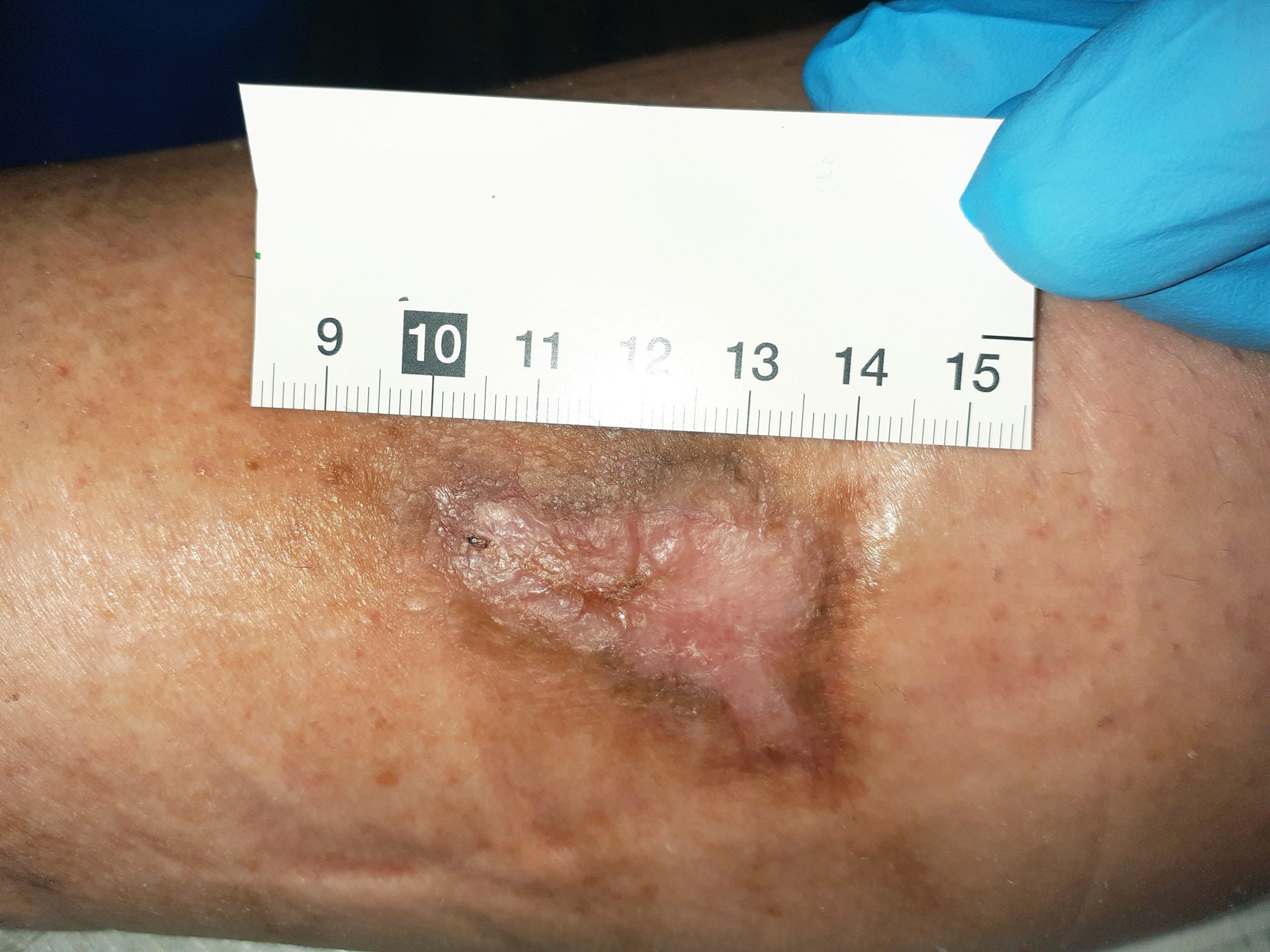 Als der Verband entfernt ist, zeigt sich am rechtem Unterschenkel der Patientin eine 3,4 cm lange, 2,5 cm breite und 0,5 cm tiefe Wunde (Foto 1). Der Hautzustand der Umgebungshaut ist sehr gepflegt. Außerdem liegt eine schwache Exsudation vor. Der Wundrand ist livide und leicht geschwollen, die Wundumgebung gerötet. Der Wundgrund ist deutlich mit Biofilm und Fibrin belegt und äußerst berührungsempfindlich.
