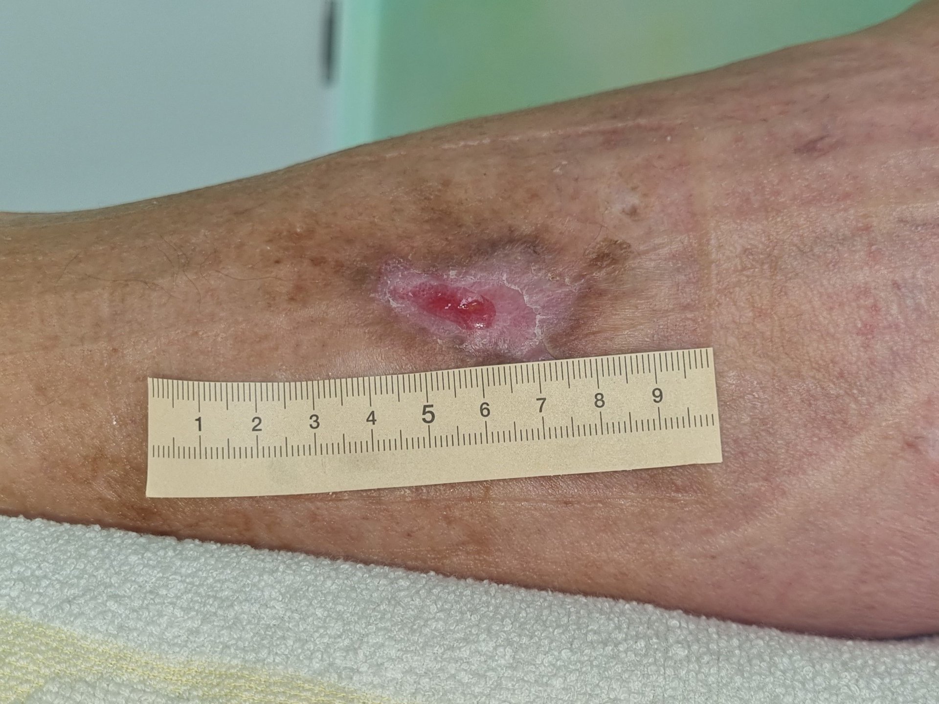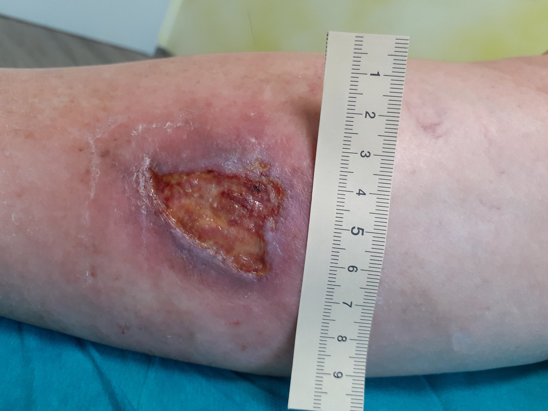 Als der Verband entfernt ist, zeigt sich am rechtem Unterschenkel der Patientin eine 3,4 cm lange, 2,5 cm breite und 0,5 cm tiefe Wunde (Foto 1). Der Hautzustand der Umgebungshaut ist sehr gepflegt. Außerdem liegt eine schwache Exsudation vor. Der Wundrand ist livide und leicht geschwollen, die Wundumgebung gerötet. Der Wundgrund ist deutlich mit Biofilm und Fibrin belegt und äußerst berührungsempfindlich.