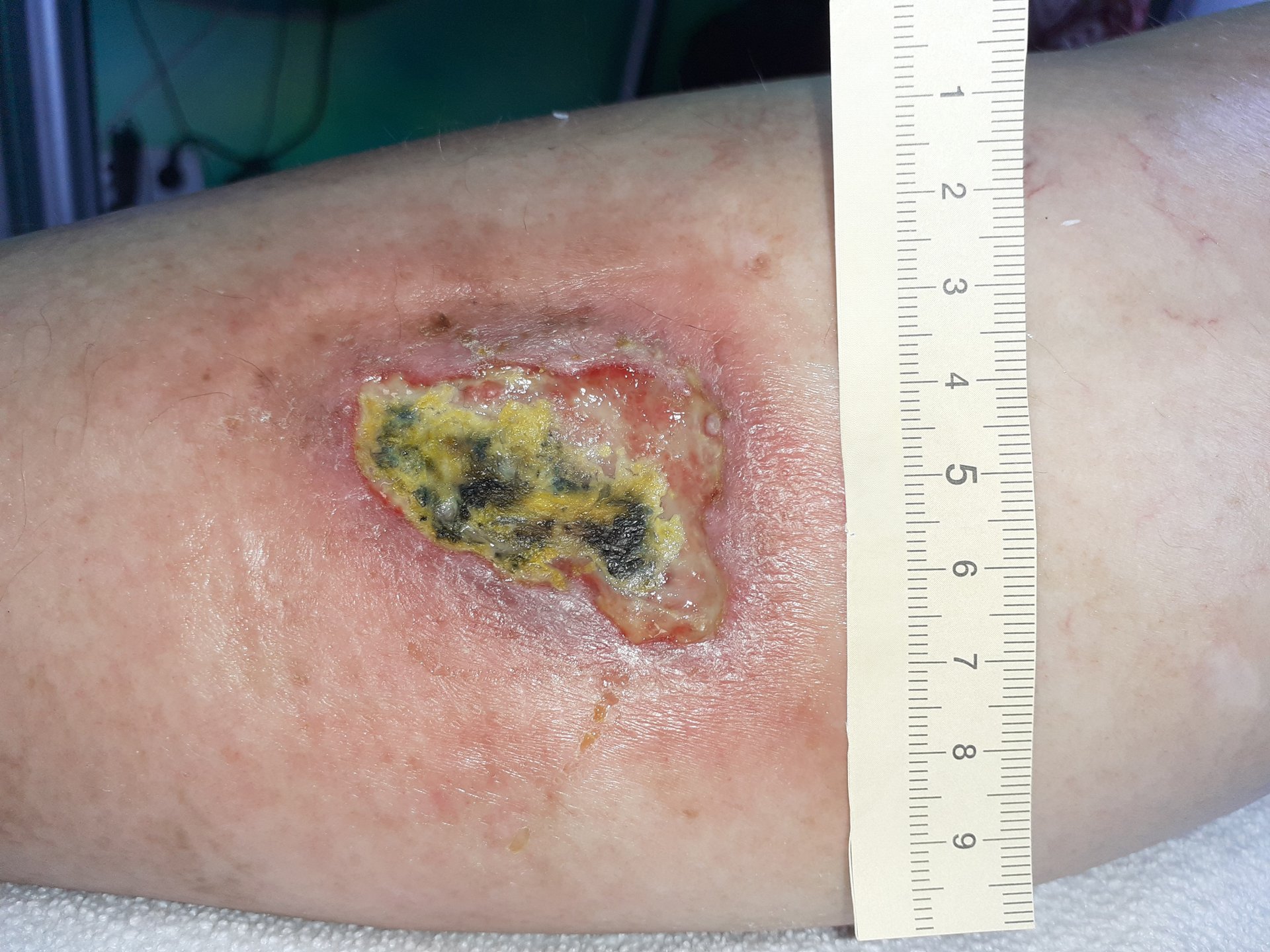 Etwa fünf Wochen nach der Erstvorstellung in der spezialisierten Praxis und eine Woche nach der Biopsie hat sich die Wundsituation deutlich verschlechtert (Foto 2). Die Wunde ist nun 4 cm lang, 3,2 cm breit und 0,9 cm tief. Während der Wundrand weniger ödematös, ansonsten aber unverändert ist, zeigen sich am Wundgrund neben Fibrin und Biofilm inzwischen auch Nekrosen. Die Exsudation hat zugenommen, ist gelblich und weist einen leichten Geruch auf. Trotz Schmerztherapie gibt die Patientin beim Verbandwechsel weiterhin starke Schmerzen an (VAS 8).