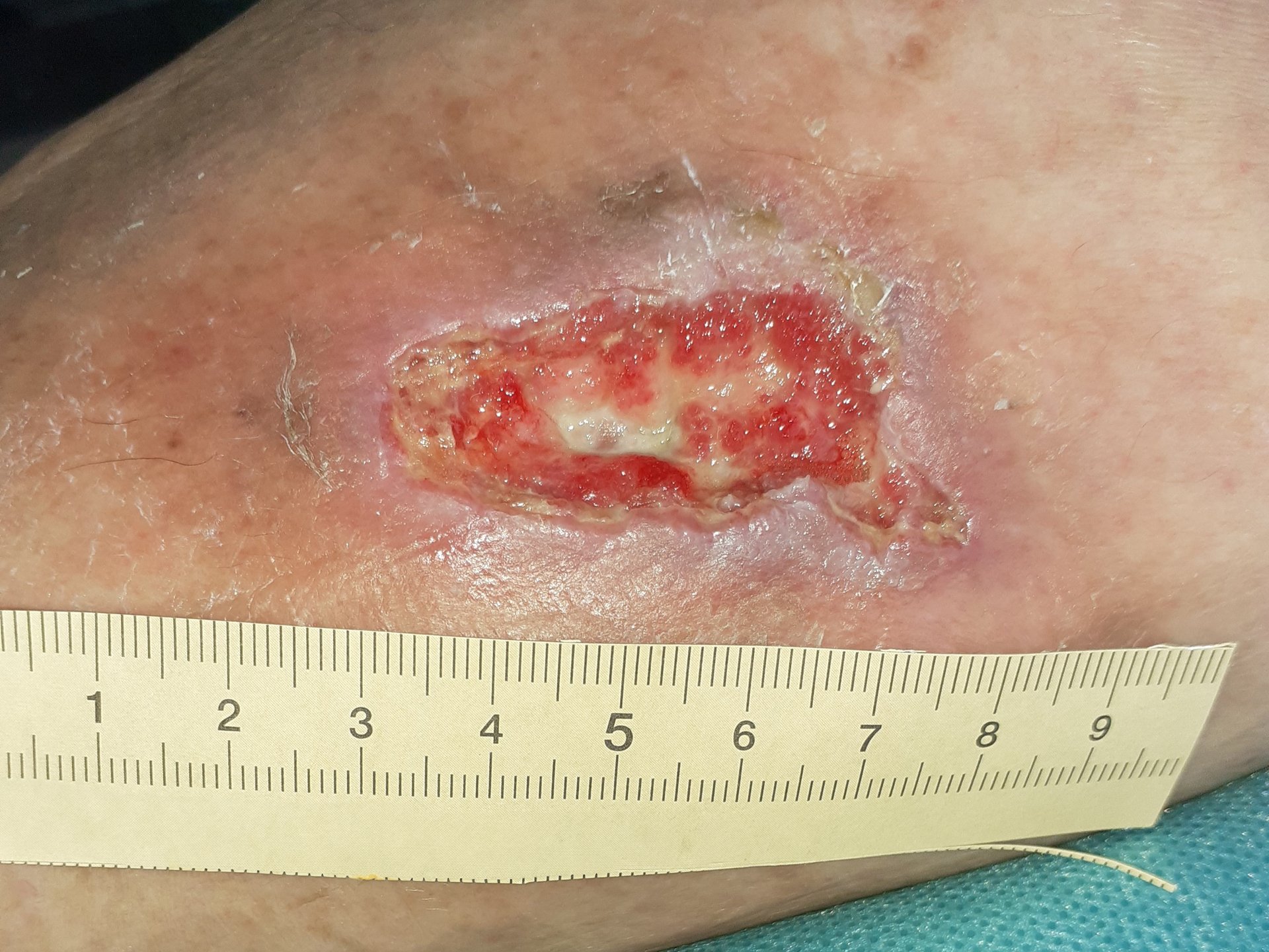 Nach weiteren 4 Wochen hat die Wunde eine Länge von 4,5 cm, eine Breite von 1,8 cm und eine Tiefe von 0,6 cm. Zwar ist der Wundrand etwas mazeriert, doch am Wundgrund sind keine Nekrosen mehr zu erkennen, dafür aber beginnende Granulation und noch etwas Fibrin. Das Wundexsudat ist nun klarer und geruchlos. Die Schmerzen haben unterdessen abgenommen und liegen beim Verbandwechsel bei VAS 4-5.