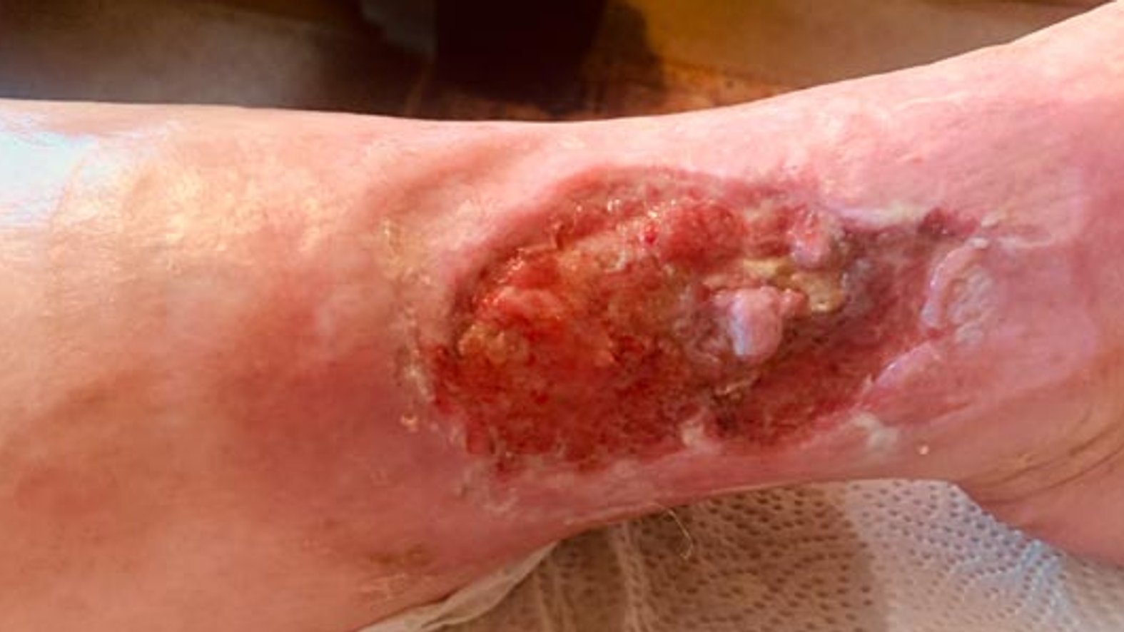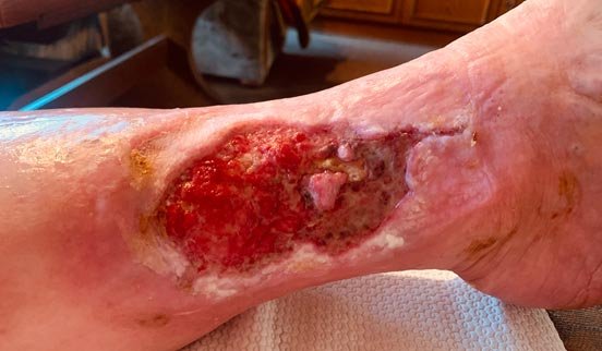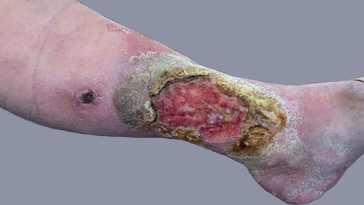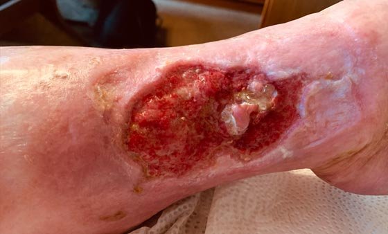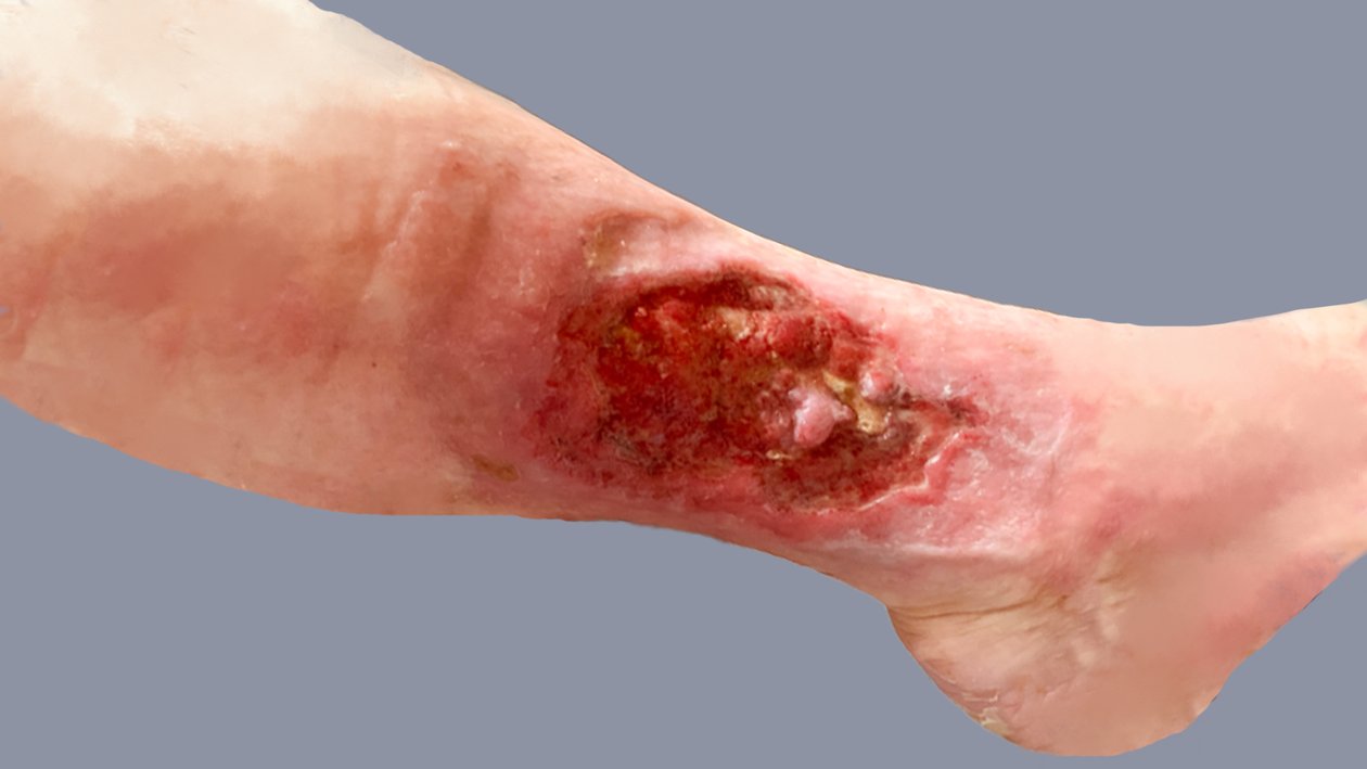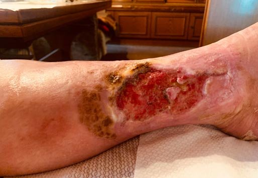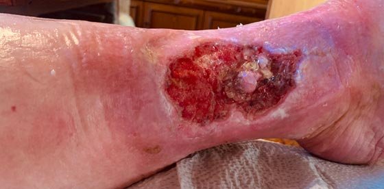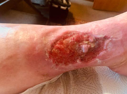Frau S. lebt allein in einem kleinen Häuschen. Sie ist seit 20 Jahren verwitwet und gestaltet ihren Alltag größtenteils selbstständig. Unterstützung erhält sie durch eine ehrenamtliche Betreuerin und eine Nachbarin, welche die freundliche, lebenslustige Frau S. privat unterstützt. Frau S. hatte 2012 bereits eine Wunde an der gleichen Stelle, die am Ende mit einer Spalthautabdeckung versorgt werden musste und danach zunächst verschlossen war. Diese Wunde ging nach längerer Zeit wieder auf und vergrößerte sich nach und nach. Frau S. hatte wenig Schmerzen und ging zunächst nicht zum Arzt. Je länger sie keinem von der Wunde erzählte, desto größer wurde die Scham.