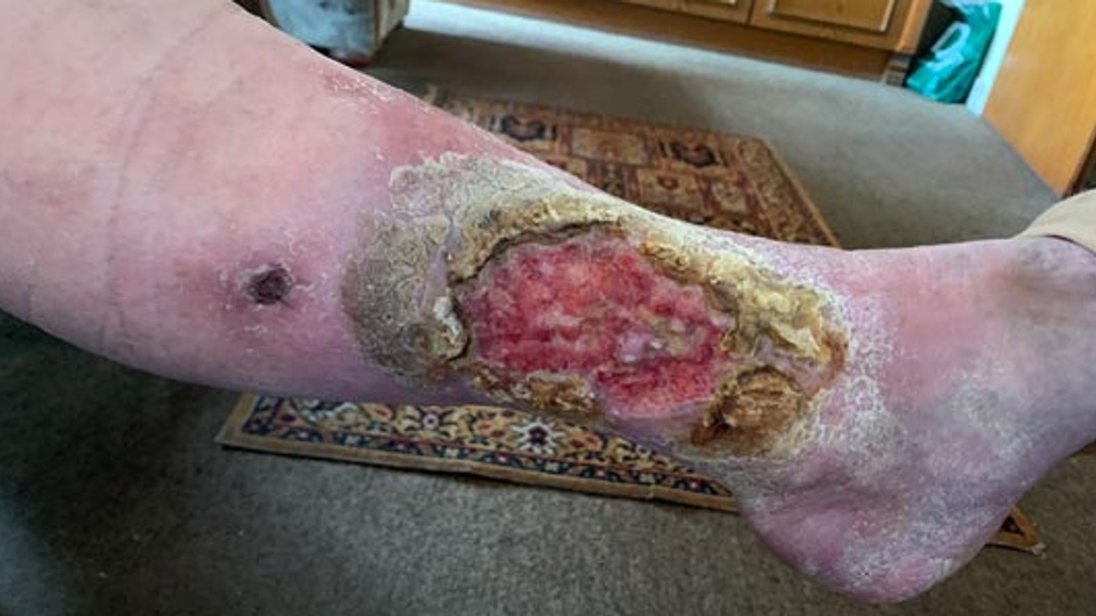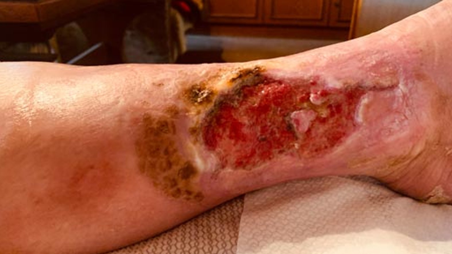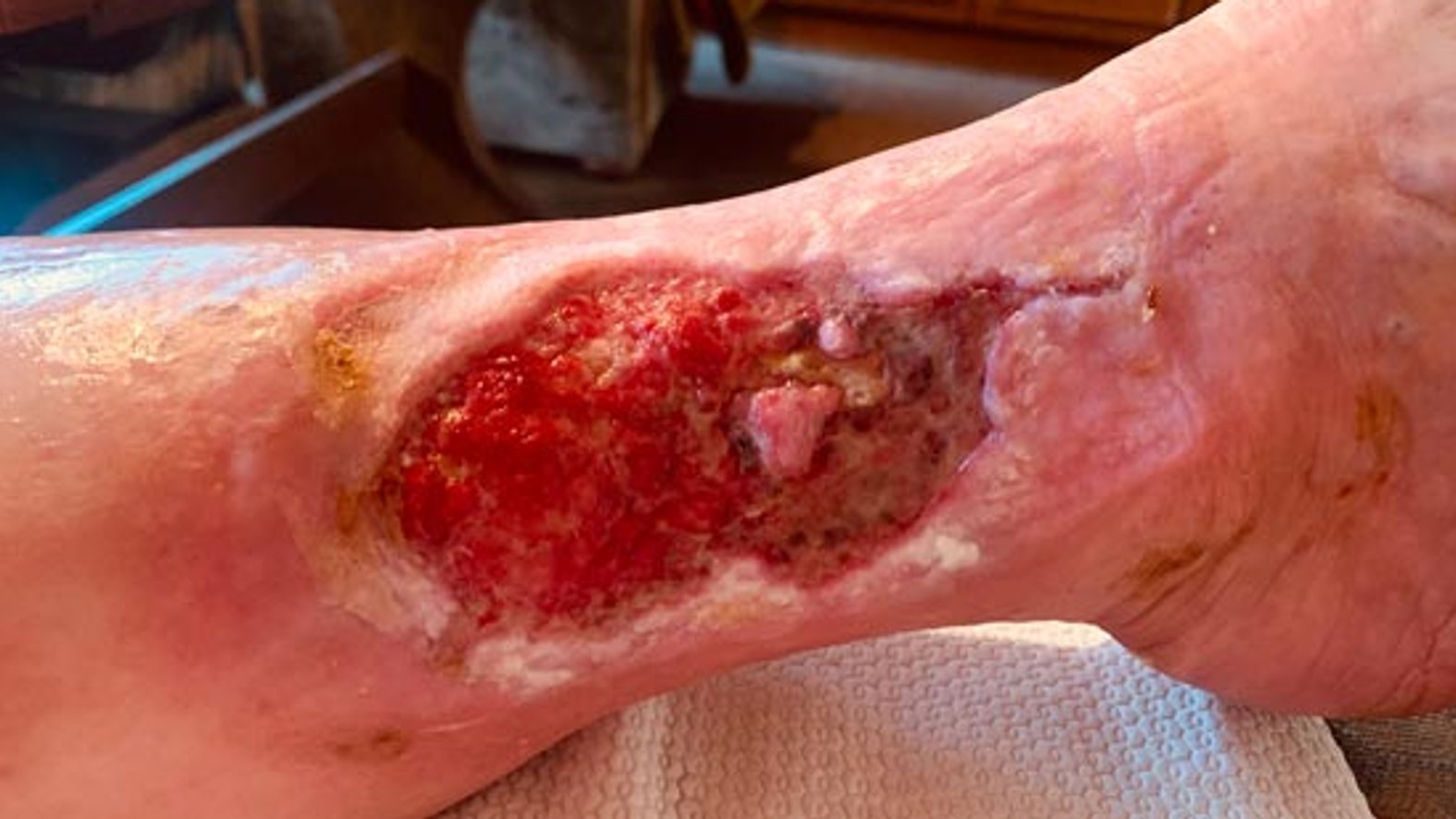 Frau S. lebt allein in einem kleinen Häuschen. Sie ist seit 20 Jahren verwitwet und gestaltet ihren Alltag größtenteils selbstständig. Unterstützung erhält sie durch eine ehrenamtliche Betreuerin und eine Nachbarin, welche die freundliche, lebenslustige Frau S. privat unterstützt. Frau S. hatte 2012 bereits eine Wunde an der gleichen Stelle, die am Ende mit einer Spalthautabdeckung versorgt werden musste und danach zunächst verschlossen war. Diese Wunde ging nach längerer Zeit wieder auf und vergrößerte sich nach und nach. Frau S. hatte wenig Schmerzen und ging zunächst nicht zum Arzt. Je länger sie keinem von der Wunde erzählte, desto größer wurde die Scham.