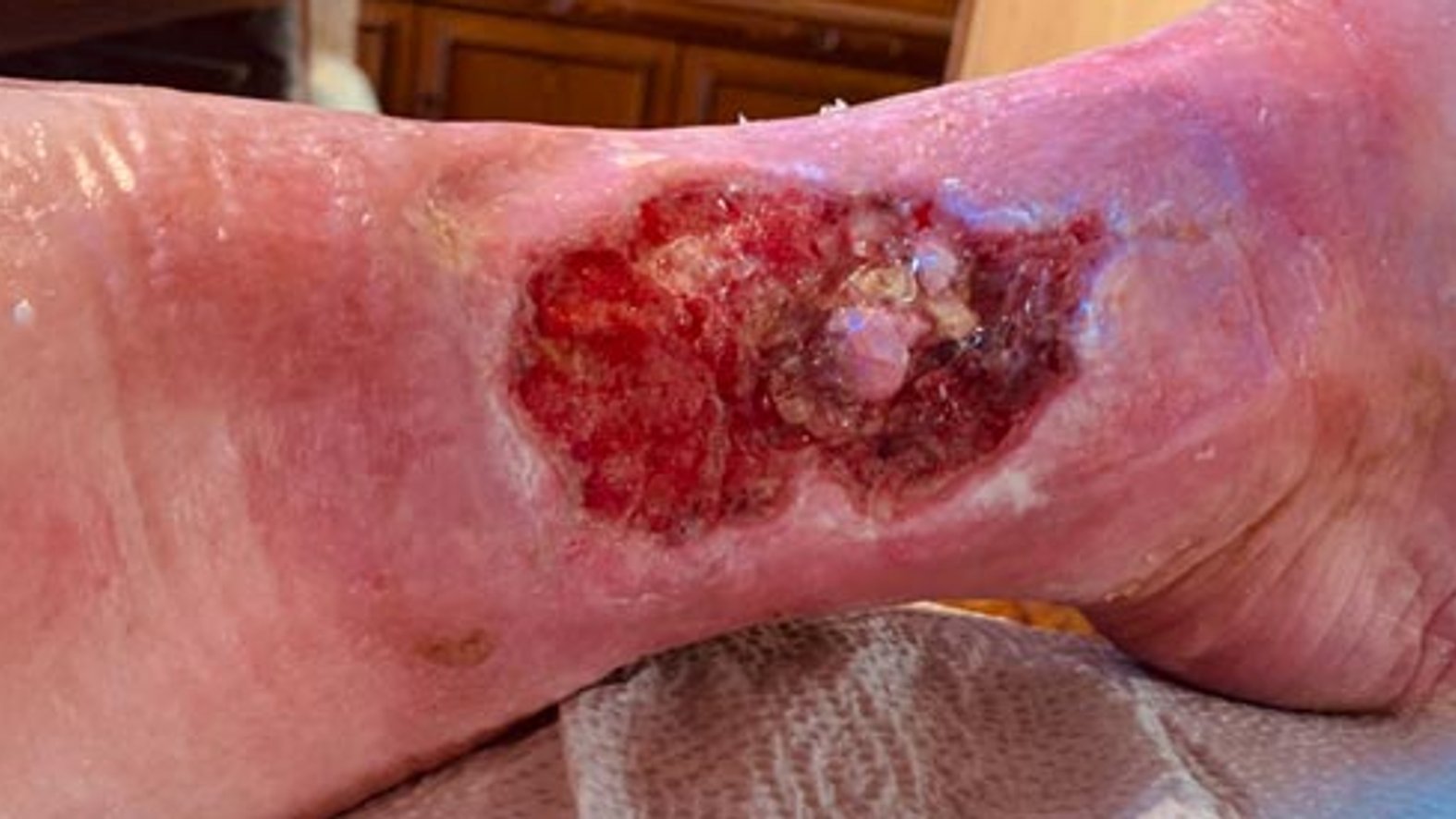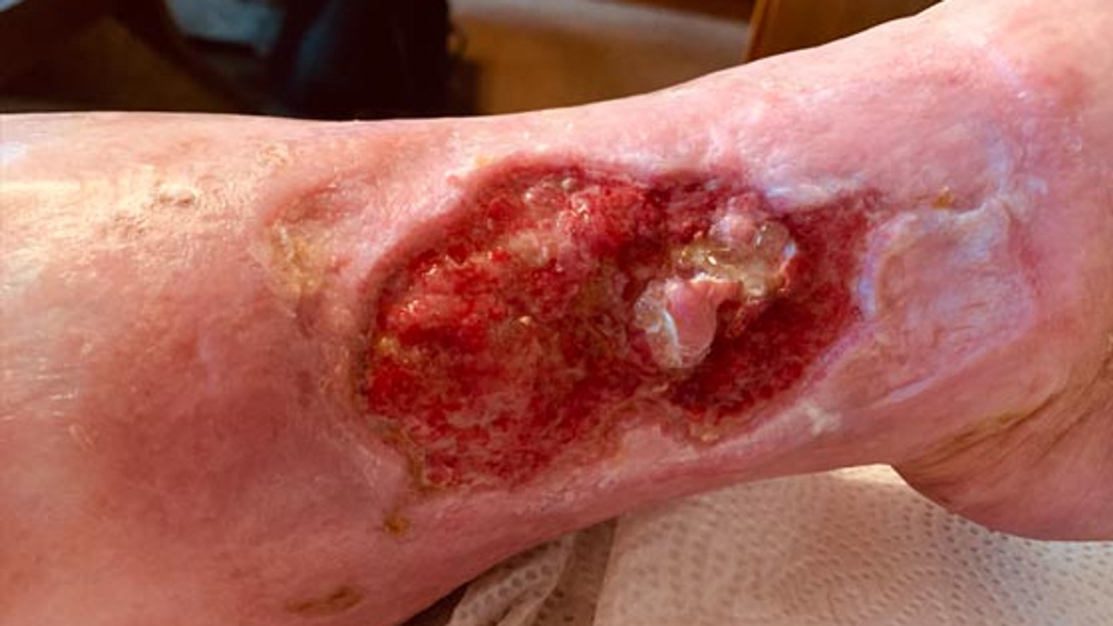 Nach ca. zwei Monaten der Versorgung durch das Familienmitglied mit zusätzlicher ärztlicher Überprüfung zeigte der Wundgrund Granulationsgewebe und war gut durchblutet. Das Exsudat war teilweise stark und die Versorgung mit einer Hydrofaser und einem Superabsorber wurde fortgesetzt. Durch die starke Exsudation war der Wundrand leicht mazeriert (Bild 4).