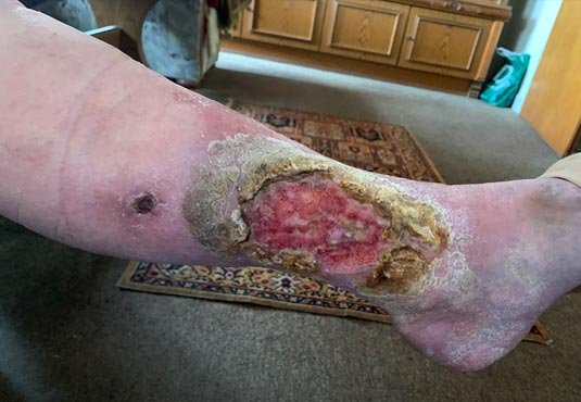 Sie trug bis dato keine Kompressionsversorgung. Frau S. legt Wert auf ihre Selbständigkeit und wollte niemandem zur Last fallen. Nur durch einen Zufall fand ein erweitertes Familienmitglied heraus, dass eine so gravierende Wundsituation vorlag. Beim gemeinsamen Kaffeetrinken rutsche Frau S. die Hose hoch und eine behelfsmäßige Wundversorgung mit Küchenkrepp kam zum Vorschein. Darauf angesprochen druckste sie etwas herum und traute sich dann doch, dem Familienmitglied von der Wunde zu erzählen.