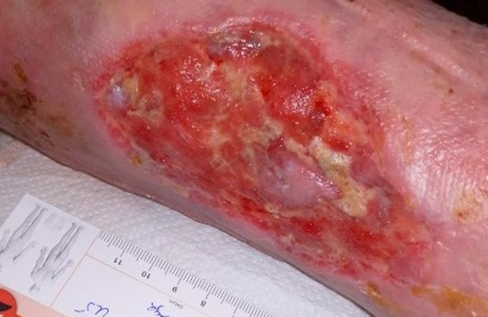 Dadurch, dass Küchenkrepp anstatt einer richtigen Wundauflage verwendet wurde, trocknete die Wunde stark aus (Bild 1). Zu Beginn der Wundversorgung waren zunächst eine intensive Wundreinigung mit 0,9% NaCl und eine Hydrierung (Befeuchtung) der Wunde mit einem Hydrogel und der trockenen Wundumgebungshaut mit einer Urea-Lotion nötig, damit das volle Ausmaß der Wunde begutachtet werden konnte.