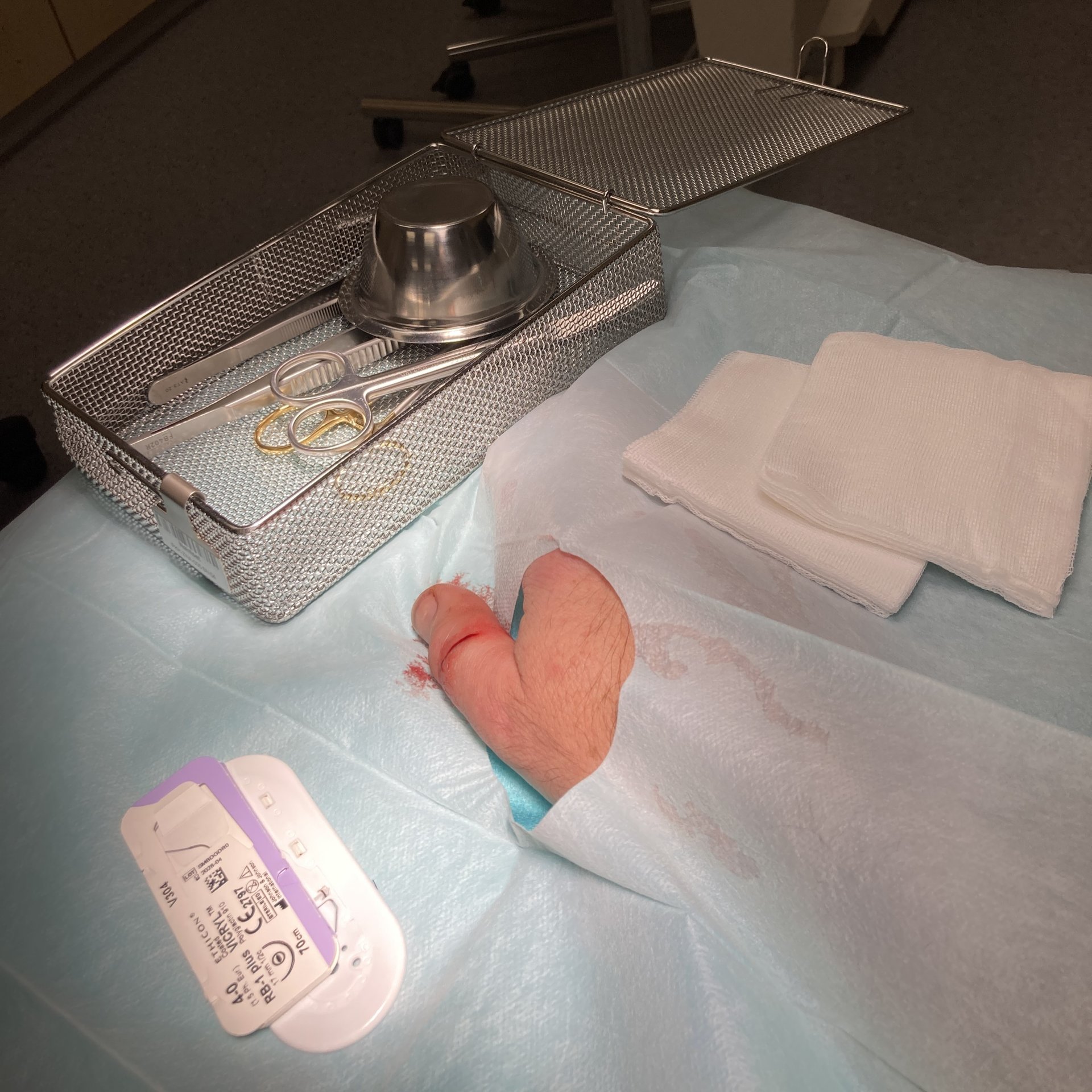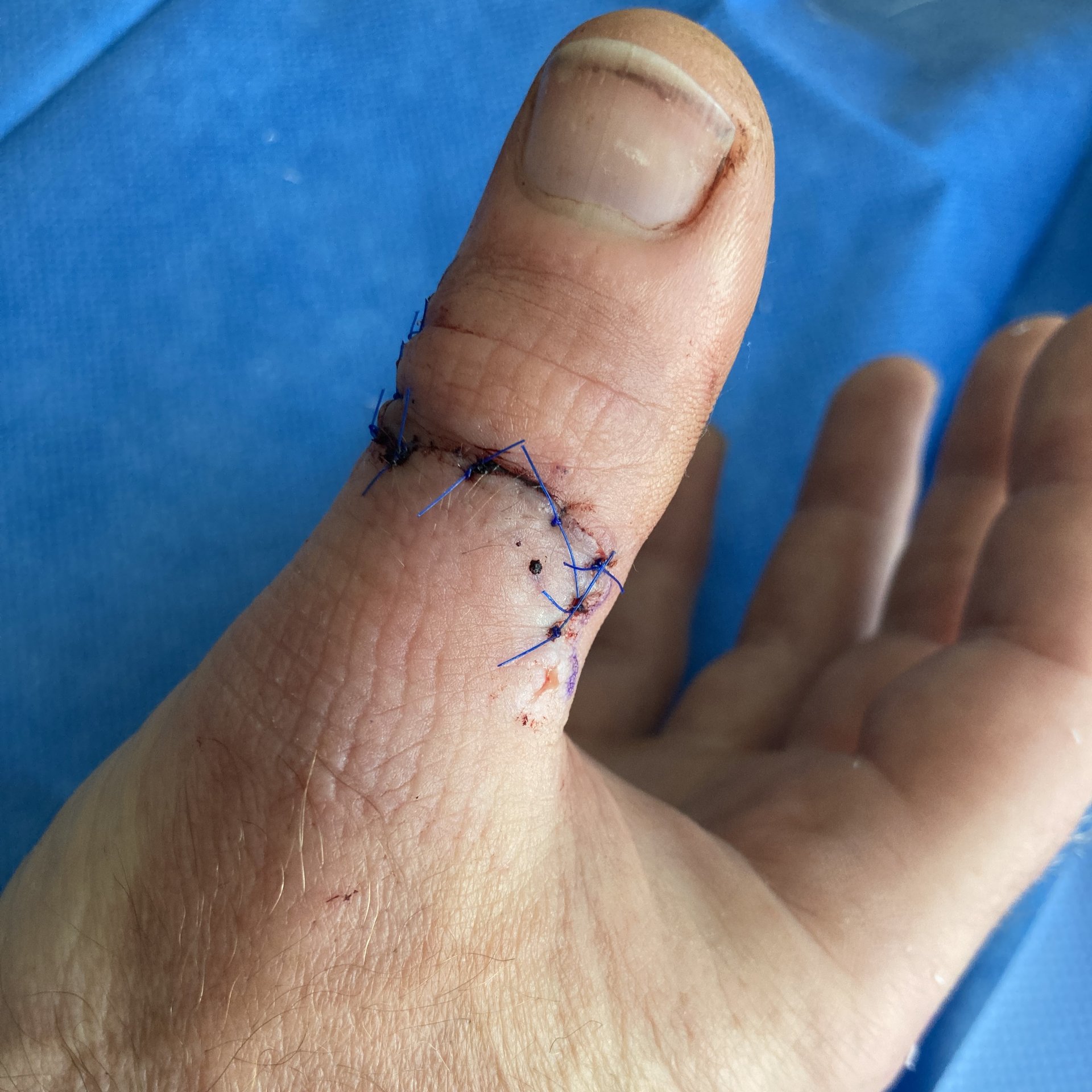 Im nahegelegenen Krankenhaus wurde ein venöser Zugang gelegt, um das Breitbandantibiotikum Amoxicillin intravenös zu verabreichen und so einer Infektion vorzubeugen. Dann wurde die Wunde gründlich gereinigt und mit einer sterilen Wundspüllösung gespült. Nachdem zunächst unklar blieb, ob es sich bei der Verletzung der Sehne um eine partielle oder vollständige Durchtrennung handelte und ob die Gelenkkapsel verletzt war, wurde für den Folgetag eine OP geplant. Bis dahin erfolgte die Versorgung der Wunde mit einem Wunddistanzgitter und einer sterilen Kompresse, die mit einer Fixierbinde fixiert wurden. Zudem wurde der betroffene Finger geschient. Seinen Beruf konnte Herr J. während des gesamten Behandlungsverlaufs durchgängig ausüben, da ihn die Schiene hierbei nur geringfügig beeinträchtigte.