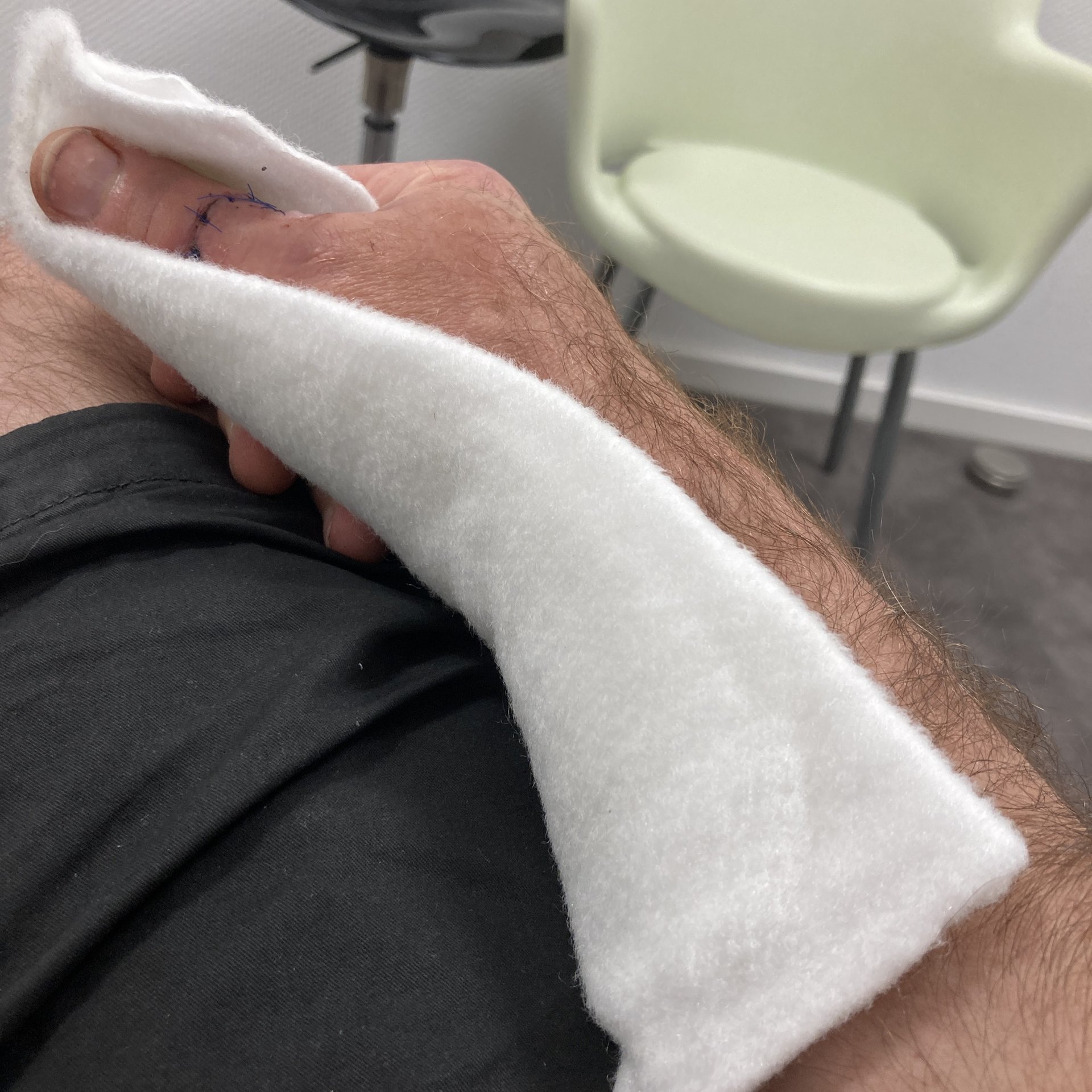 Am Tag nach der Verletzung wurde der geplante operative Eingriff unter Lokalanästhesie durchgeführt (Foto 3). Dabei wurde die vollständig durchtrennte Strecksehne genäht. Zudem wurde ein Ganglion (gutartiges Geschwulst an einem Gelenk oder einer Sehnenscheide) entfernt. Nachdem die Wunde vernäht war (Foto 4), erfolgte eine kurze Kühlung und Hochlagerung der Hand, um die vorhandene Schwellung zu reduzieren. Im Anschluss erfolgte eine erneute Versorgung mit einem Wunddistanzgitter, einer sterilen Kompresse und einer Fixierung. Auch die Schiene wurde wieder angelegt. Um das komplikationslose Zusammenwachsen der Sehne zu gewährleisten, wurde die Ruhigstellung des Fingers für voraussichtlich 5 bis 6 Wochen angeordnet. Nach dem Abklingen der Lokalanästhesie gab Herr J. leichte Schmerzen an.
