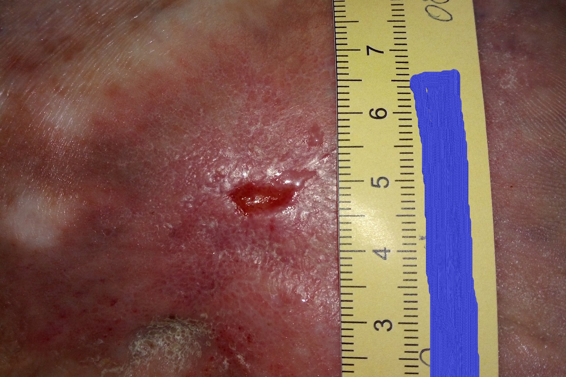 In den folgenden 2 Wochen verkleinerte sich die Wunde weiter auf 0,6 cm Länge, 0,3 cm Breite und 0,1 cm Tiefe (Foto 4), während Herr F. sehr darauf bedacht war, die Tipps zur Mobilität und Ruhephasen zu befolgen. Die Wunde sonderte kaum noch Exsudat ab und die Rötung der Umgebungshaut war verschwunden. In Erwartung der zeitnahen Abheilung wurden im Rahmen der Versorgung Kompressionsstrümpfe ausgemessen, in die, an den Stellen der betroffenen Perforansvenen, kleine Pelotten eingearbeitet werden sollten, um eine zielgerichtete Kompression zu ermöglichen. Vorerst wurde die Wunde bis zur vollständigen Abheilung jedoch noch alle 5 Tage mit PU-Schaum und dem Mehrkomponentenkompressionsverband bandagiert.