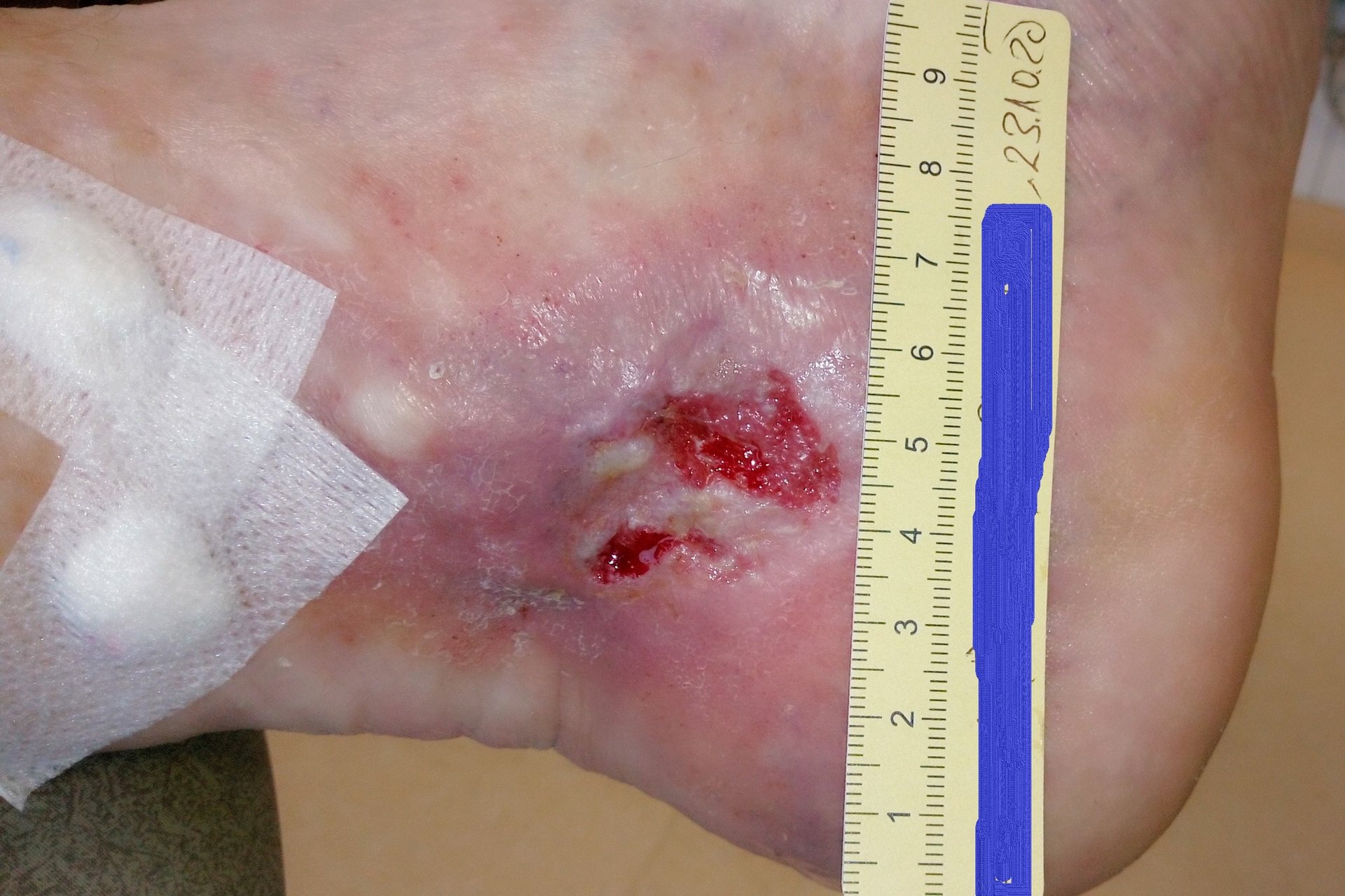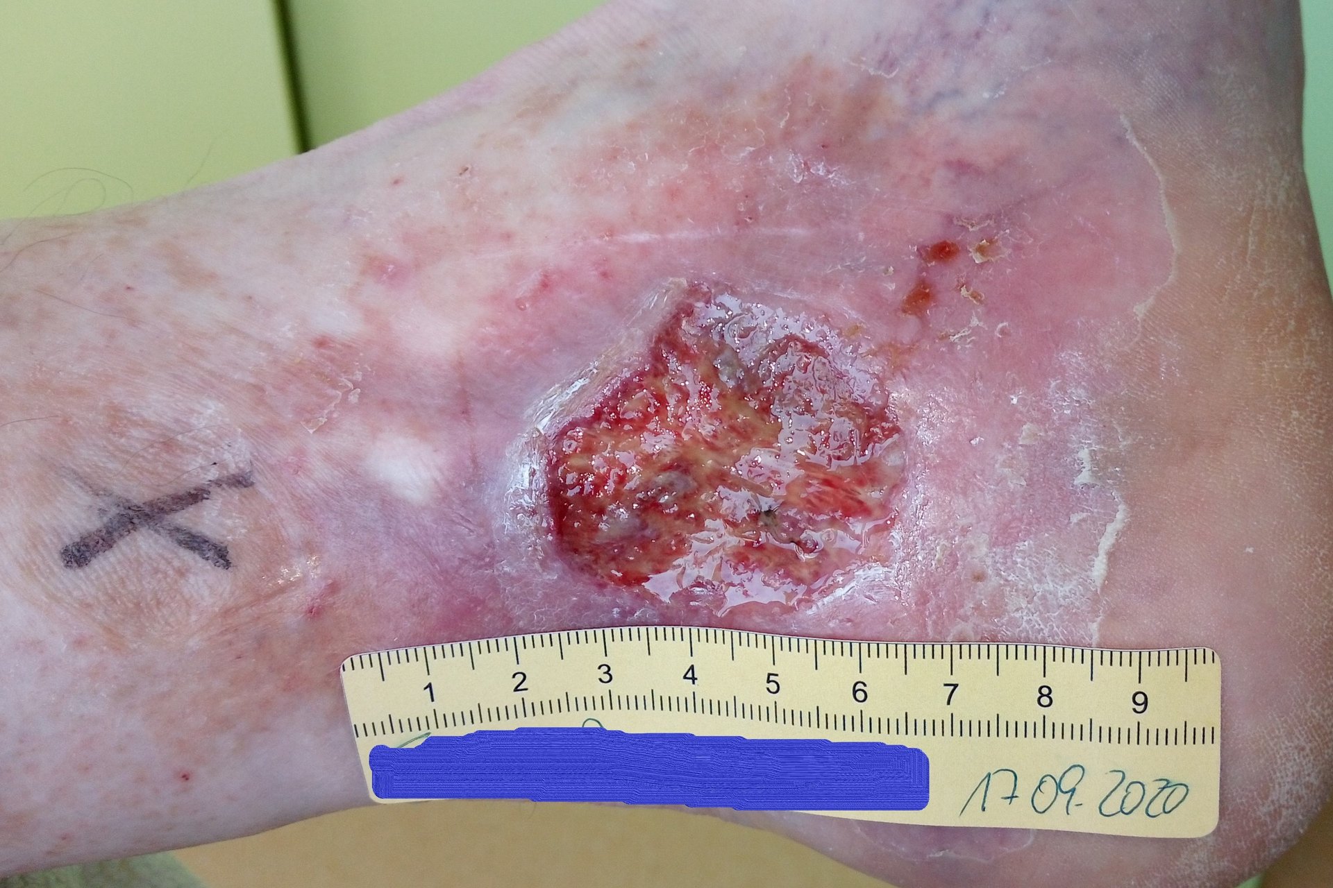 Zu Beginn der Versorgung zeigte sich eine 4 cm lange, 3,8 cm breite und zwischen 0,2 cm und 0,4 cm tiefe Wunde (Foto 1). Die starke Exsudation war klar, serös und geruchlos. Der Wundgrund war mit Biofilm und Fibrin belegt und es waren Granulationskörnchen sichtbar. Der Wundrand fußwärts teilweise mazeriert. Die Umgebungshaut war trocken und teils schuppig und wies Veränderungen im Sinne einer Atrophie blanche auf. Es waren zwei kleinere Läsionen entstanden. Unter Schmerzen litt Herr F. zu diesem Zeitpunkt nur, wenn die Wunde berührt wurde (VAS 3-4).