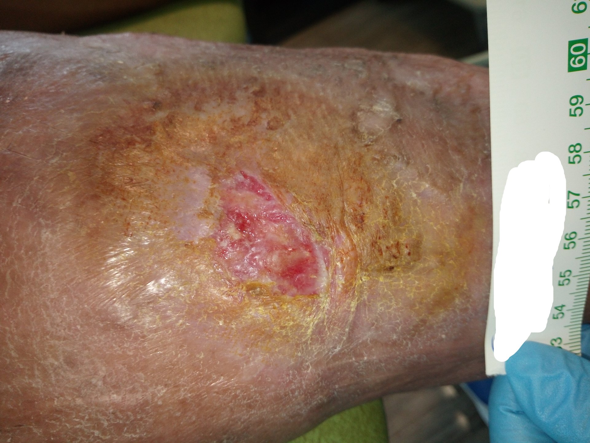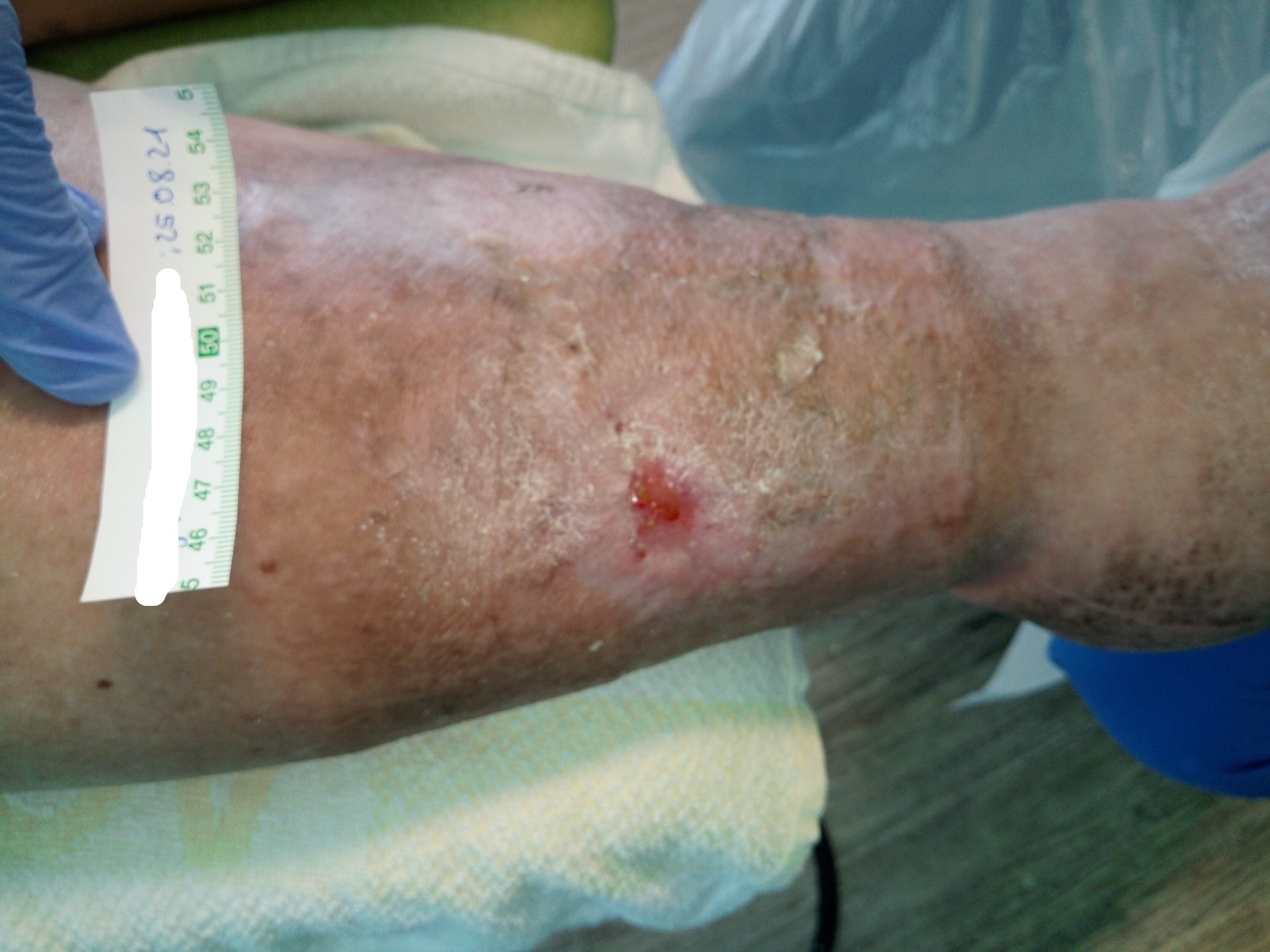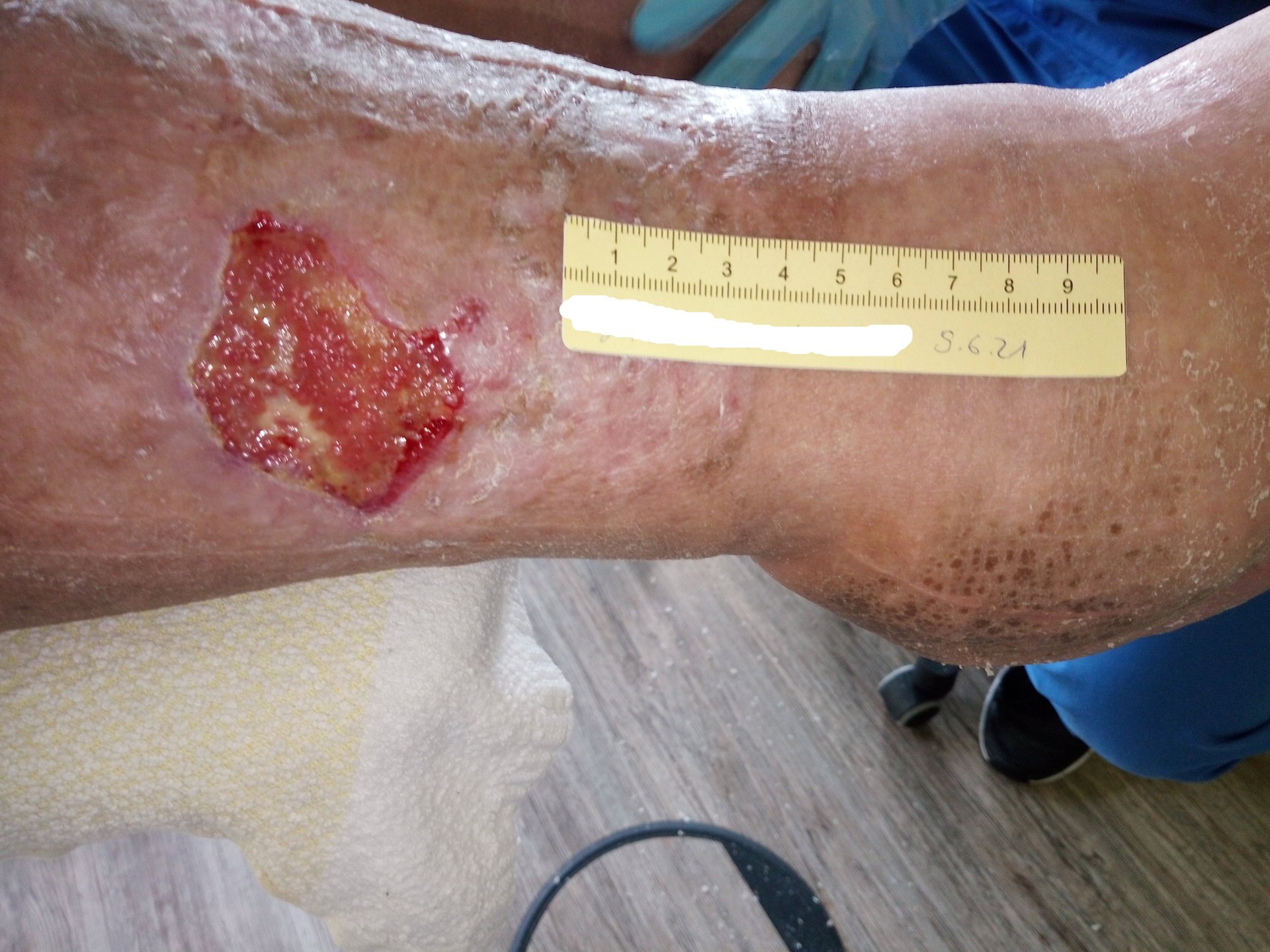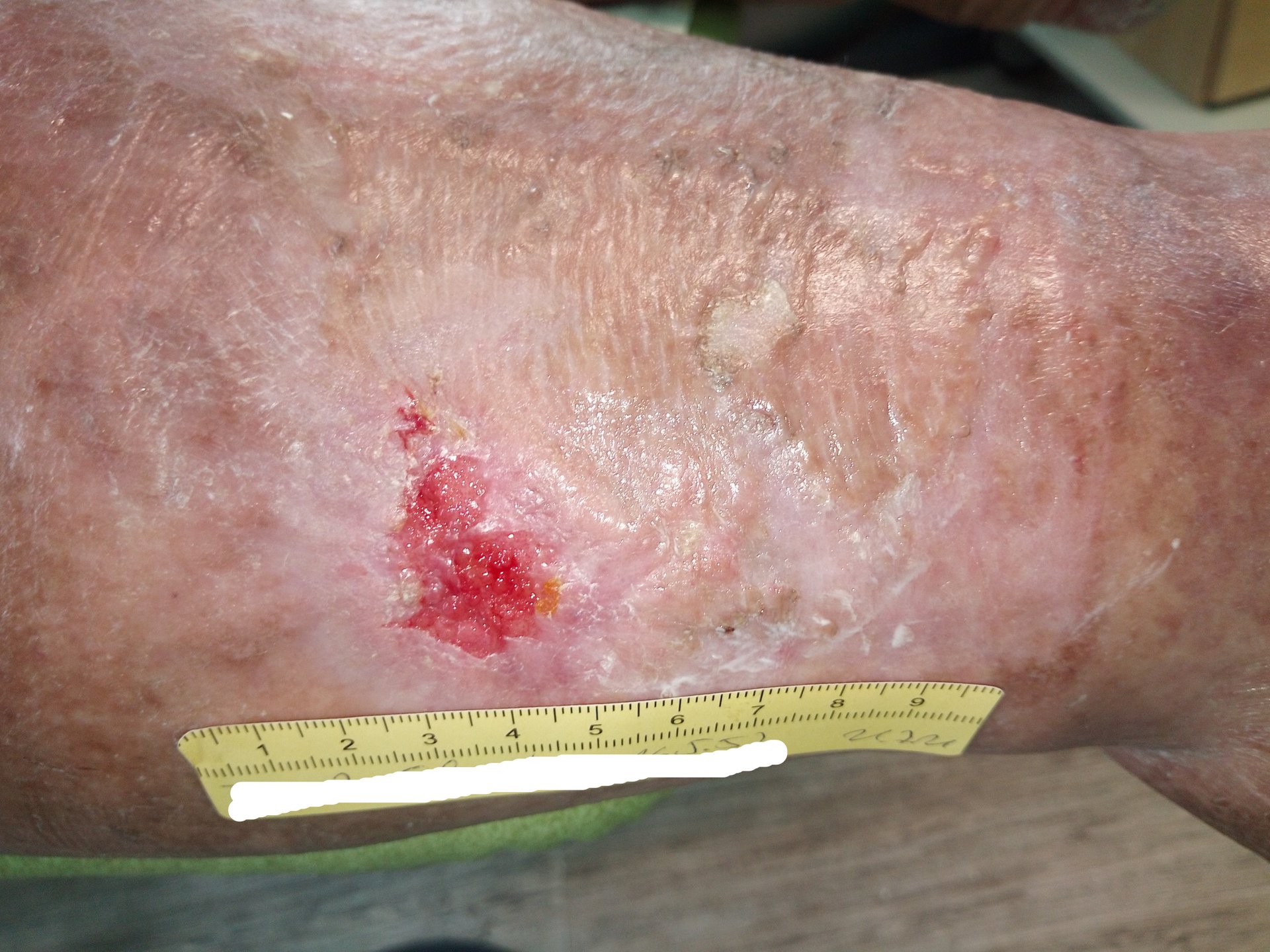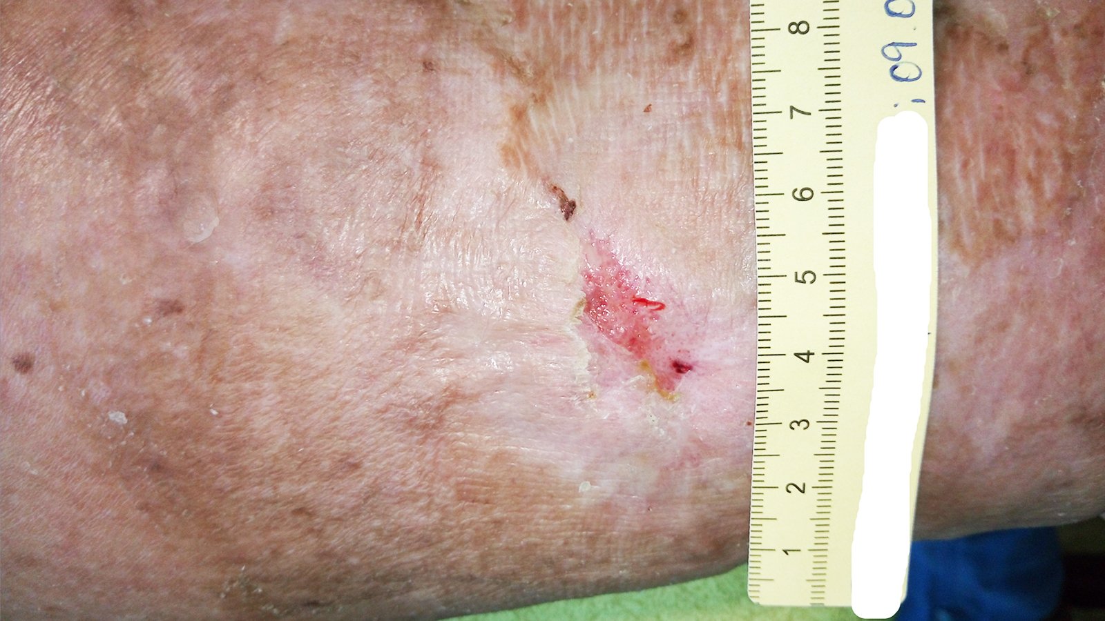 Mit einer Länge und Breite von 3,8 cm war die Wunde nun wieder größer als noch vor 2 Wochen (Foto 5). Über die Epithelinseln hatte sich angetrocknetes Exsudat gelegt. Auch die Umgebungshaut war durch die vernachlässigte Hautpflege wieder trockener mit vielen Hautschuppen. Die Exsudation und Ödeme hatten leicht zugenommen.
