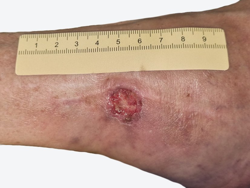 Während eines Krankenhausaufenthalts aufgrund einer geplanten Stoma-Rückverlagerung fiel bei der 64-jährigen Patientin Frau T. eine Wunde am rechten, stark ödematösen Unterschenkel auf. Frau T. hatte die Wunde bisher nicht ärztlich abklären lassen, sondern diese stattdessen selbst versorgt. Die nun jedoch veranlasste Diagnostik im Krankenhaus ergab, dass es sich um ein Ulcus cruris venosum handelte, dessen Therapie daraufhin eingeleitet wurde.