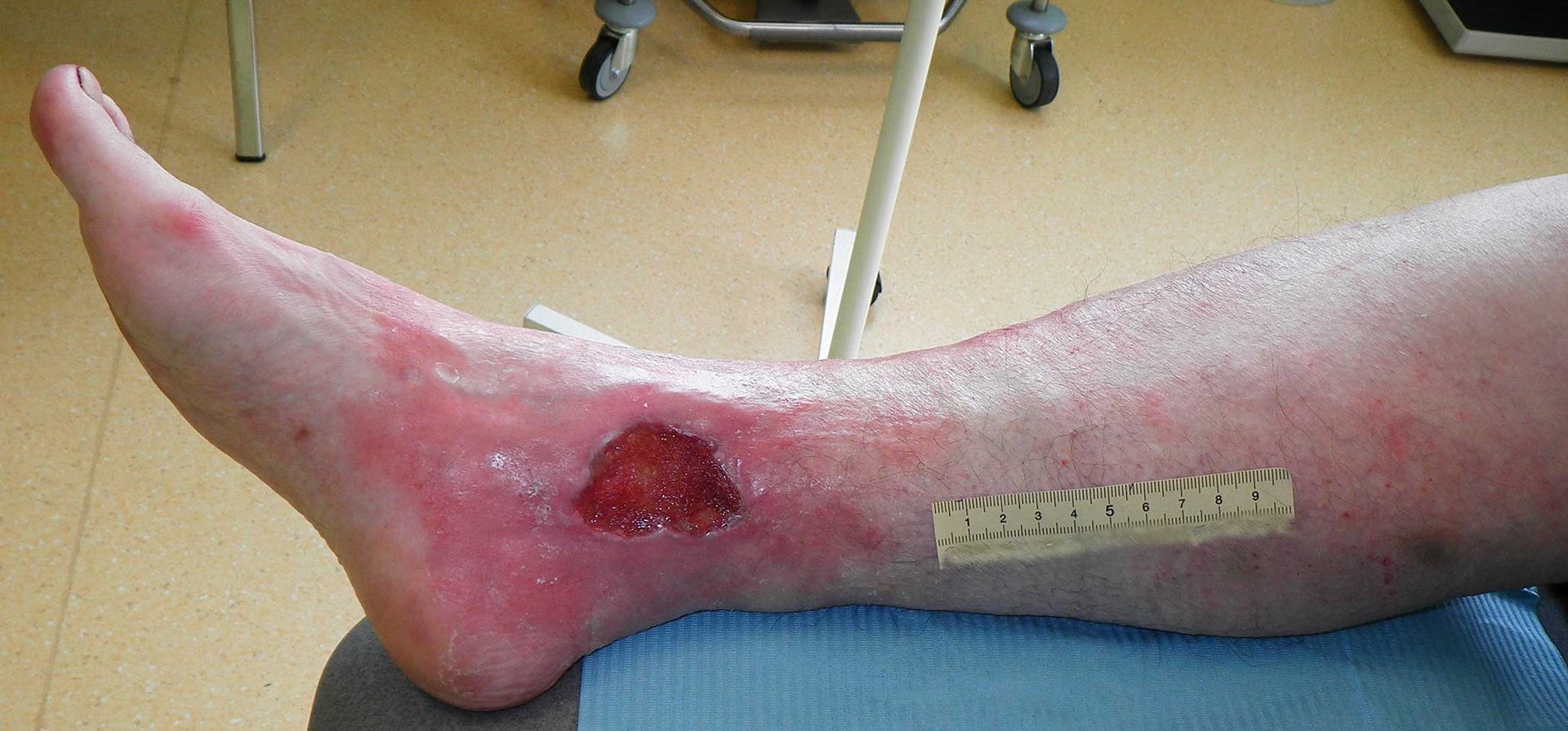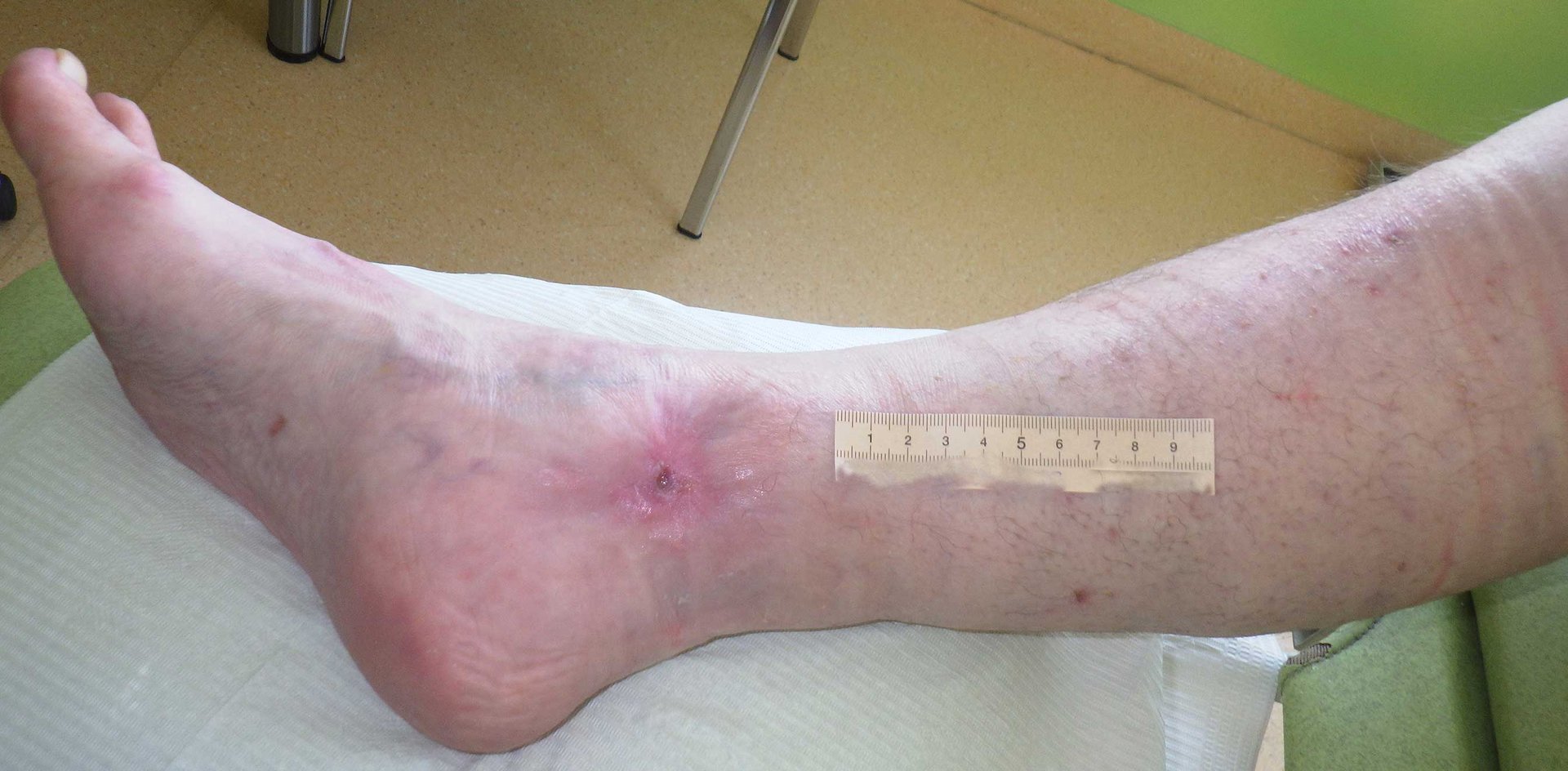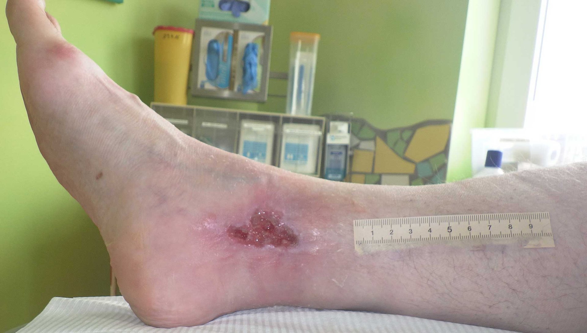 Frau P. stellt sich in der Praxis vor mit einer bereits seit eineinhalb Jahren bestehenden Wunde über dem rechten Innenknöchel. Sie sei damals beim Fahrradfahren vom Pedal gerutscht und habe sich die Stelle aufgeschürft. In der folgenden Zeit habe die Wunde zwar keine Heilungstendenz gezeigt und immer wieder genässt, zunächst habe sie dem aber keine Bedeutung zugemessen. Erst nach etwa einem halben Jahr, in dem sie die Wunde bei Bedarf ausschließlich mit unsterilen Pflastern abgedeckt habe, habe sie das Bein ihrem Hausarzt gezeigt. Dieser hat die Wunde etwa einmal in der Woche verbunden, eine Wundheilung hat sich aber nicht eingestellt.