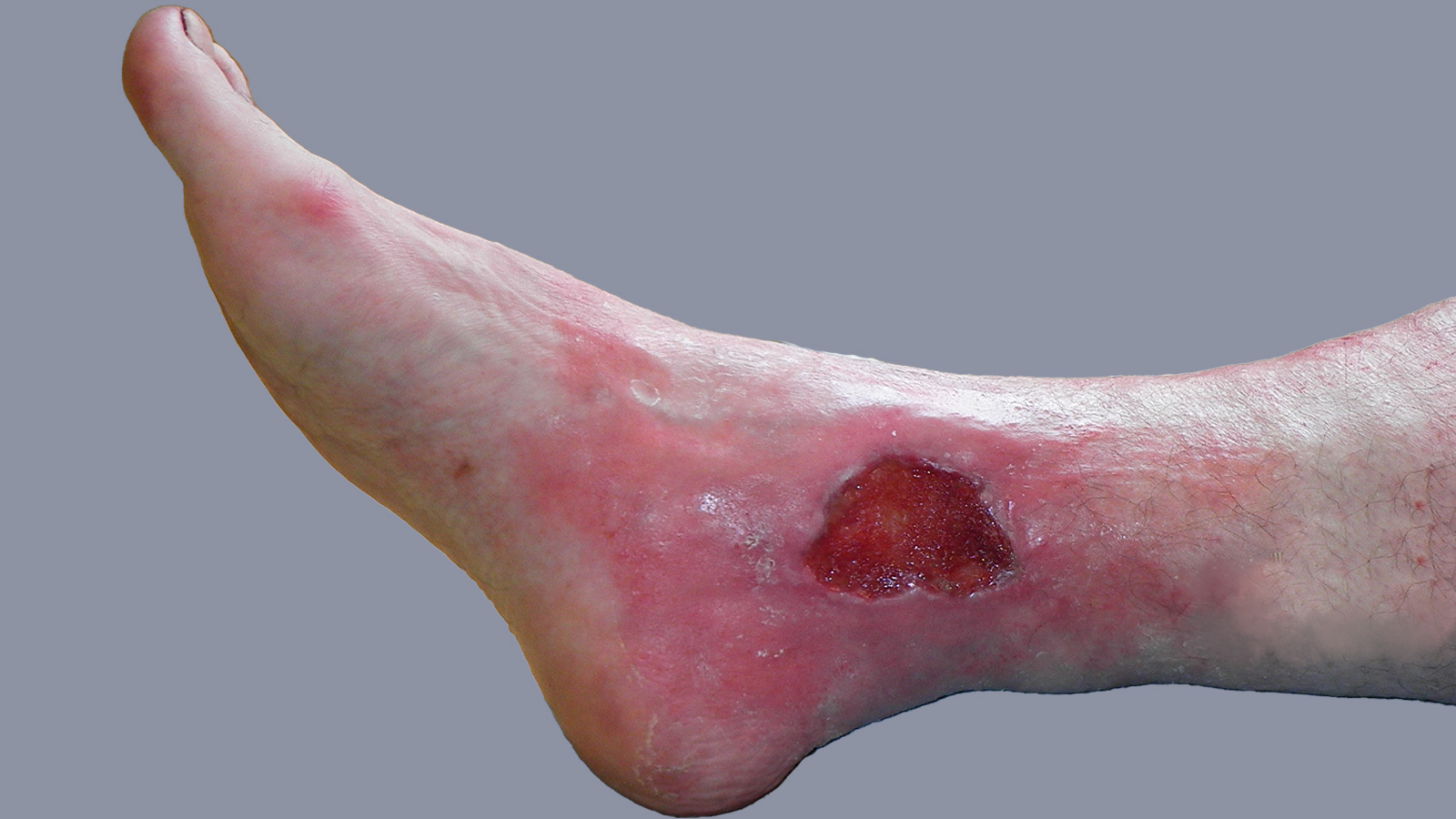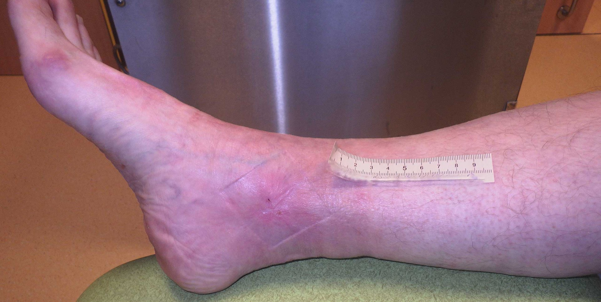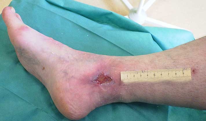 Frau P. stellt sich in der Praxis vor mit einer bereits seit eineinhalb Jahren bestehenden Wunde über dem rechten Innenknöchel. Sie sei damals beim Fahrradfahren vom Pedal gerutscht und habe sich die Stelle aufgeschürft. In der folgenden Zeit habe die Wunde zwar keine Heilungstendenz gezeigt und immer wieder genässt, zunächst habe sie dem aber keine Bedeutung zugemessen. Erst nach etwa einem halben Jahr, in dem sie die Wunde bei Bedarf ausschließlich mit unsterilen Pflastern abgedeckt habe, habe sie das Bein ihrem Hausarzt gezeigt. Dieser hat die Wunde etwa einmal in der Woche verbunden, eine Wundheilung hat sich aber nicht eingestellt.