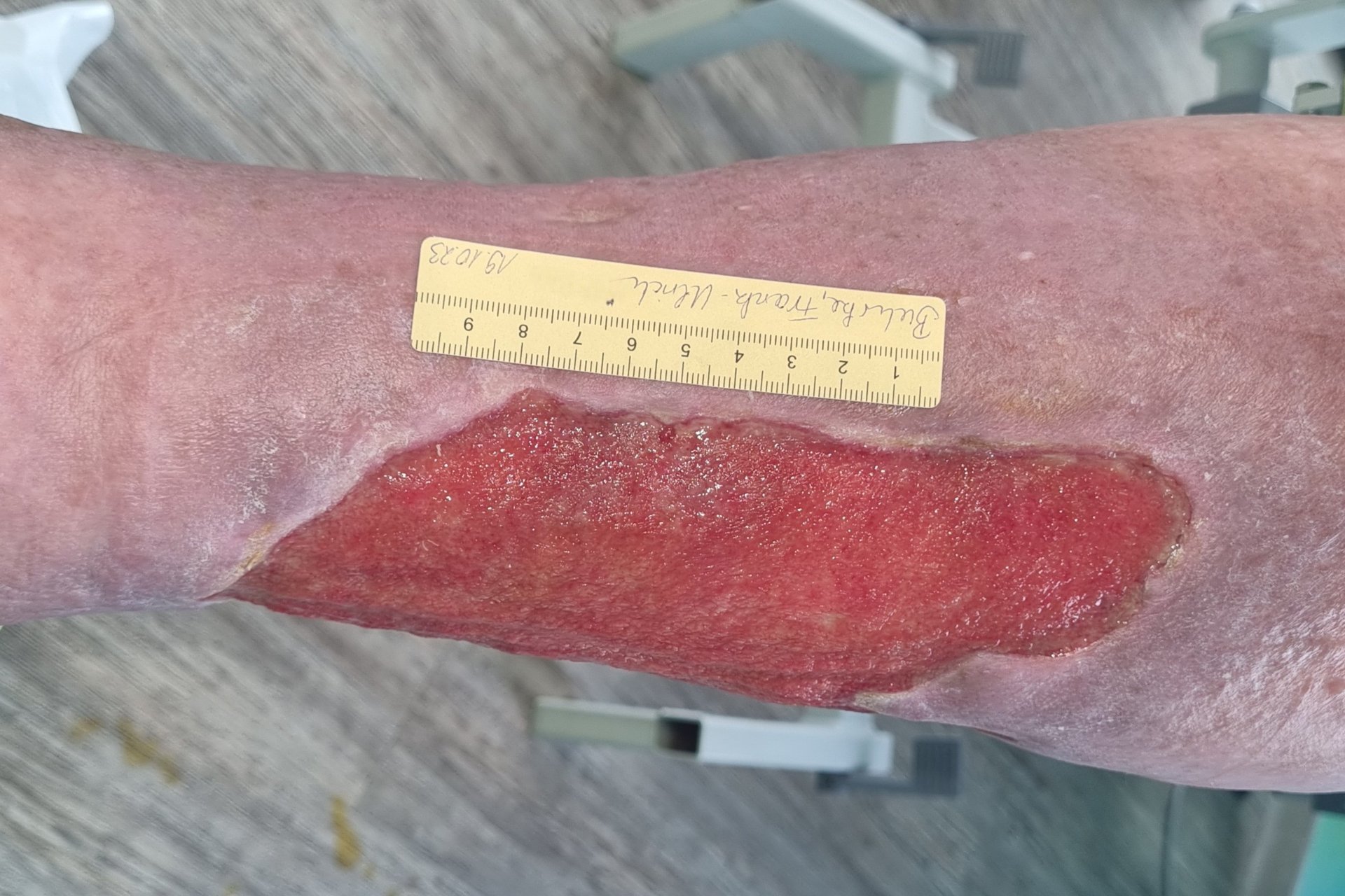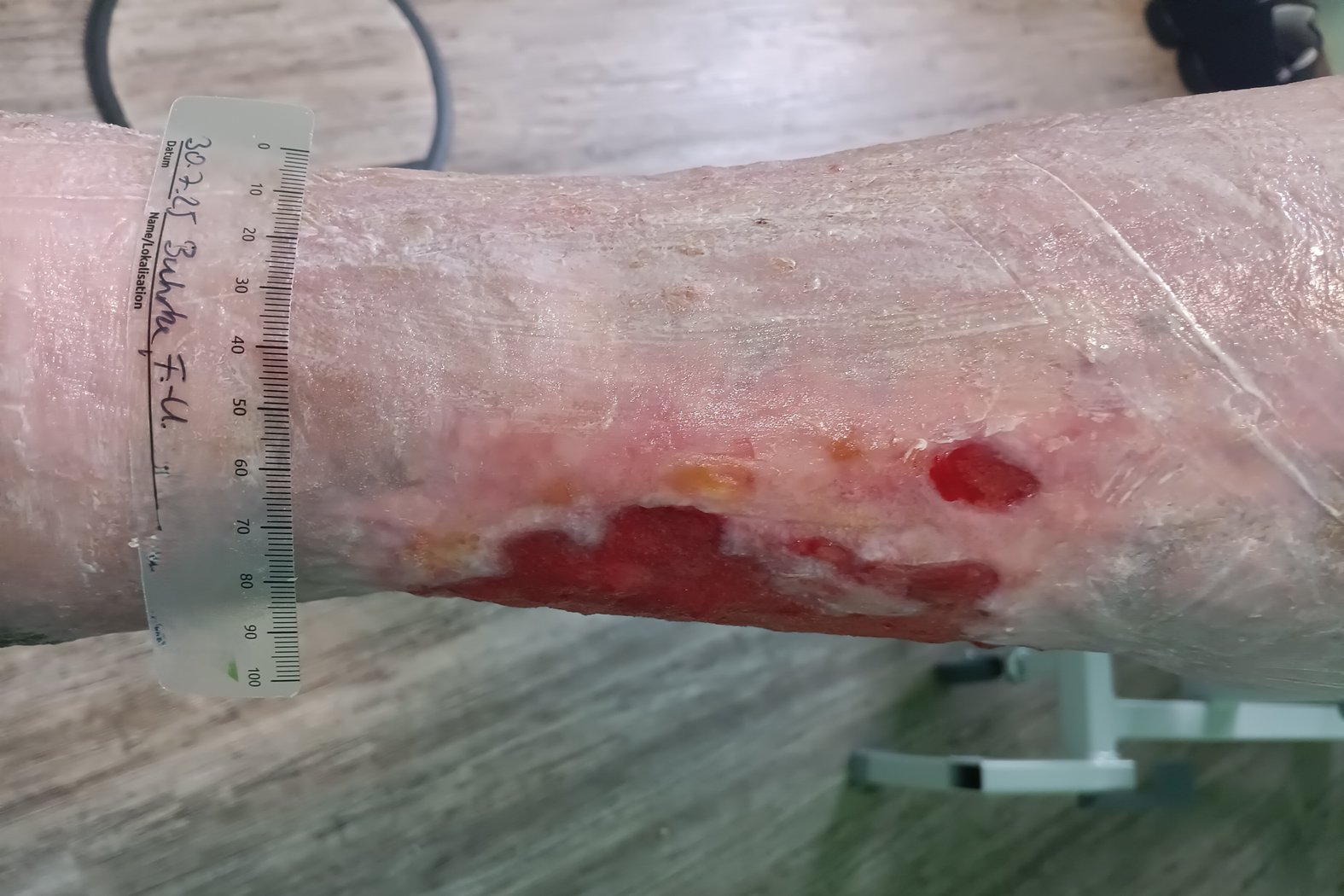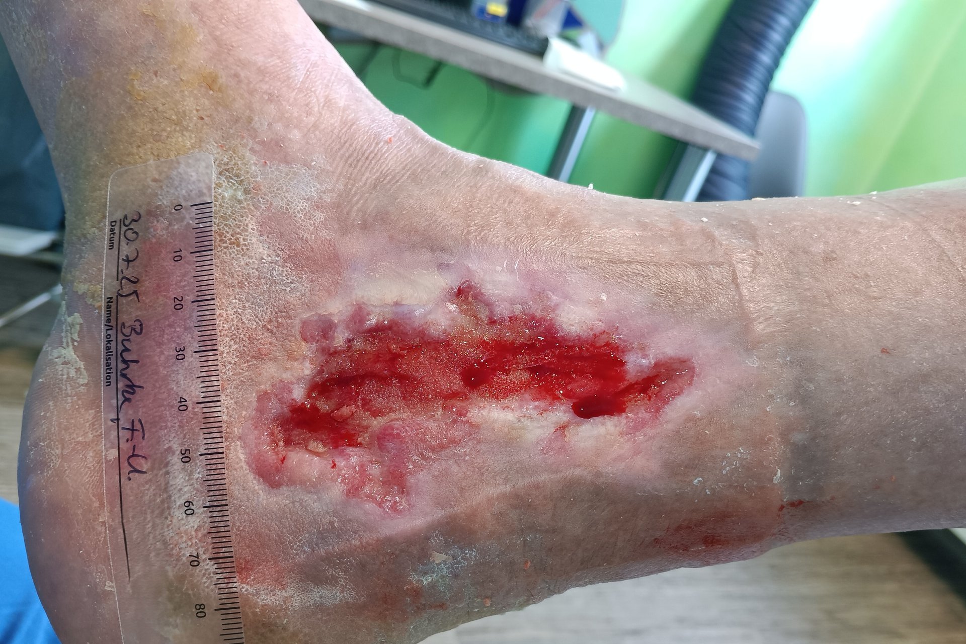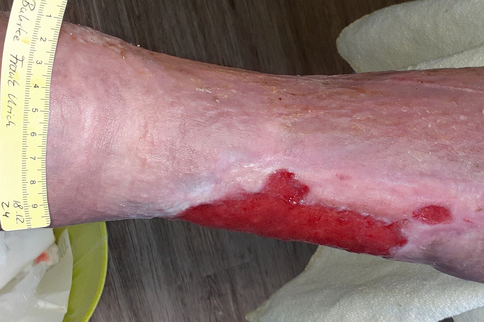 Die Wundreinigung war schwer möglich, da Herr Buhrke dabei starke Schmerzen hatte und die verordnete Analgesie erst noch angepasst werden musste