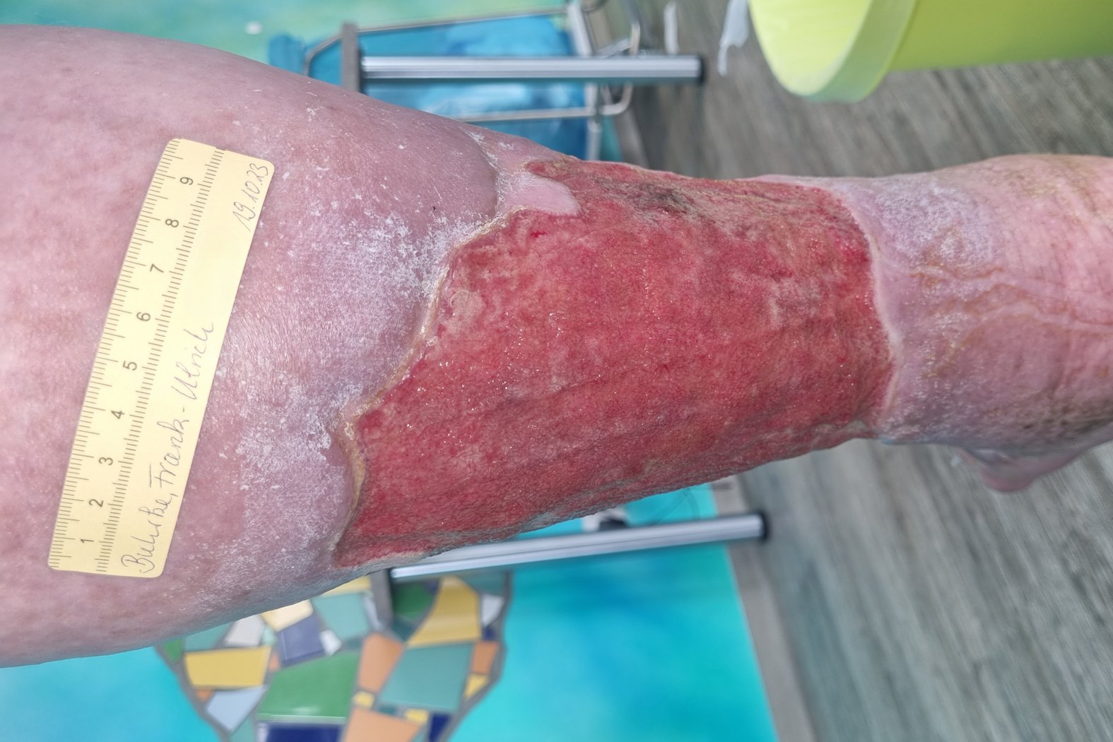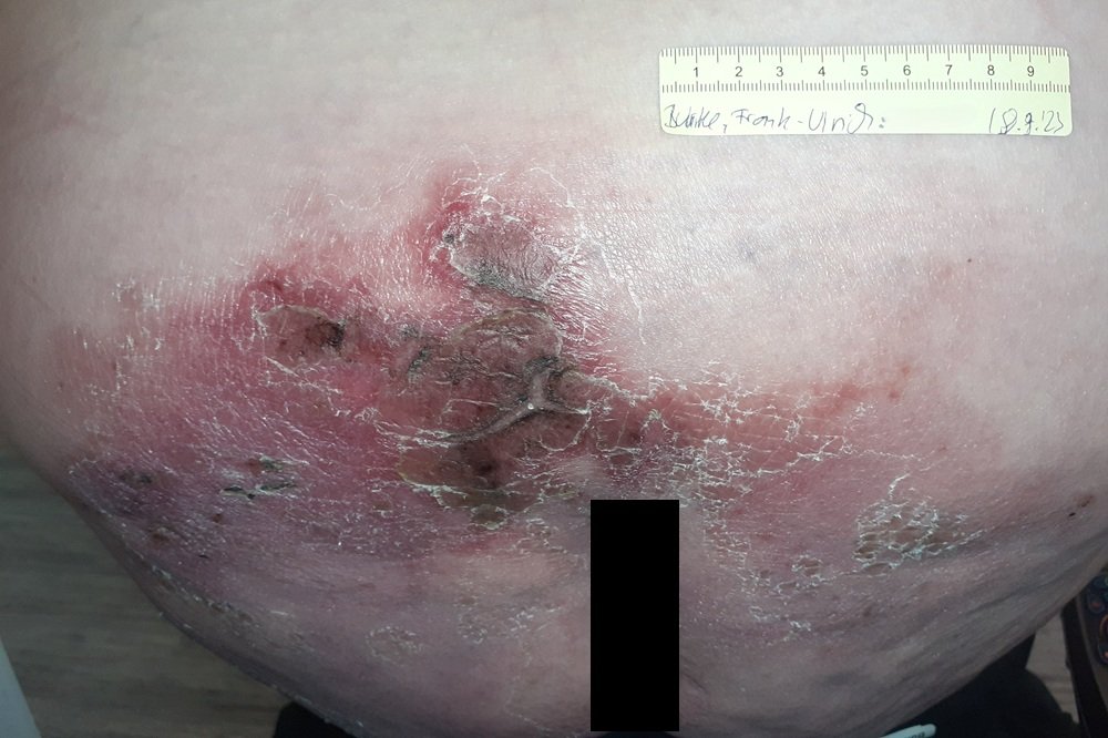 Herr Buhrke stellte sich im August 2023 erstmalig in einer auf die Wundversorgung spezialisierten pflegerischen Praxis vor (Fotos 1-4), musste den dortigen Behandlungsstart jedoch verschieben, da er aufgrund eines Erysipels im Bereich des Gesäßes und Rückens (Foto 5) stationär im Krankenhaus behandelt werden musste. Nach der Entlassung konnte die Versorgung in der pflegerischen Praxis dann jedoch endlich beginnen.